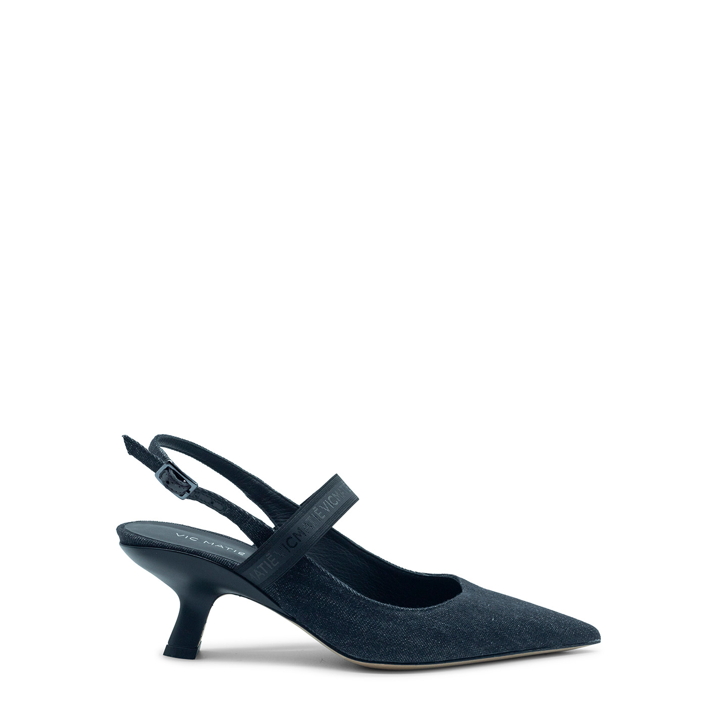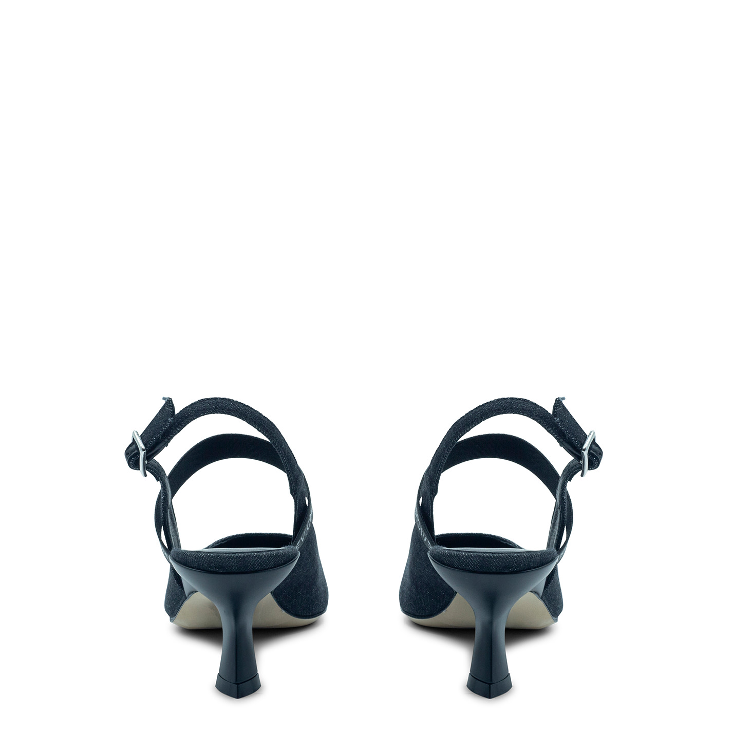 Slash chanel in denim stone lavato nero, fibbia regolabile e con elastico logato tono su tono. Struttura a punta molto femminile, con tacco verniciato matt che ricorda la slash. Suola in cuoio. Sottopiede in pelle. Made in Italy.