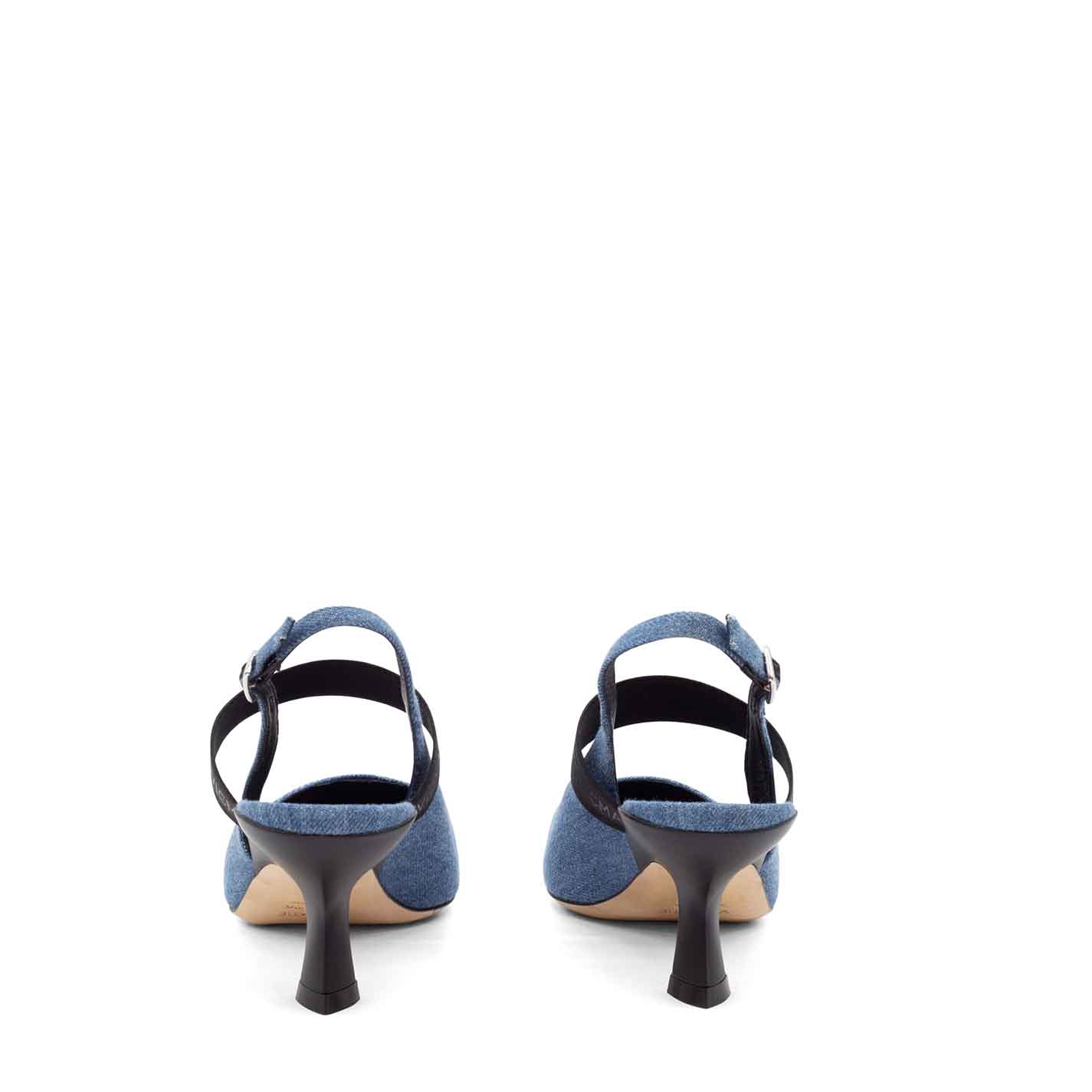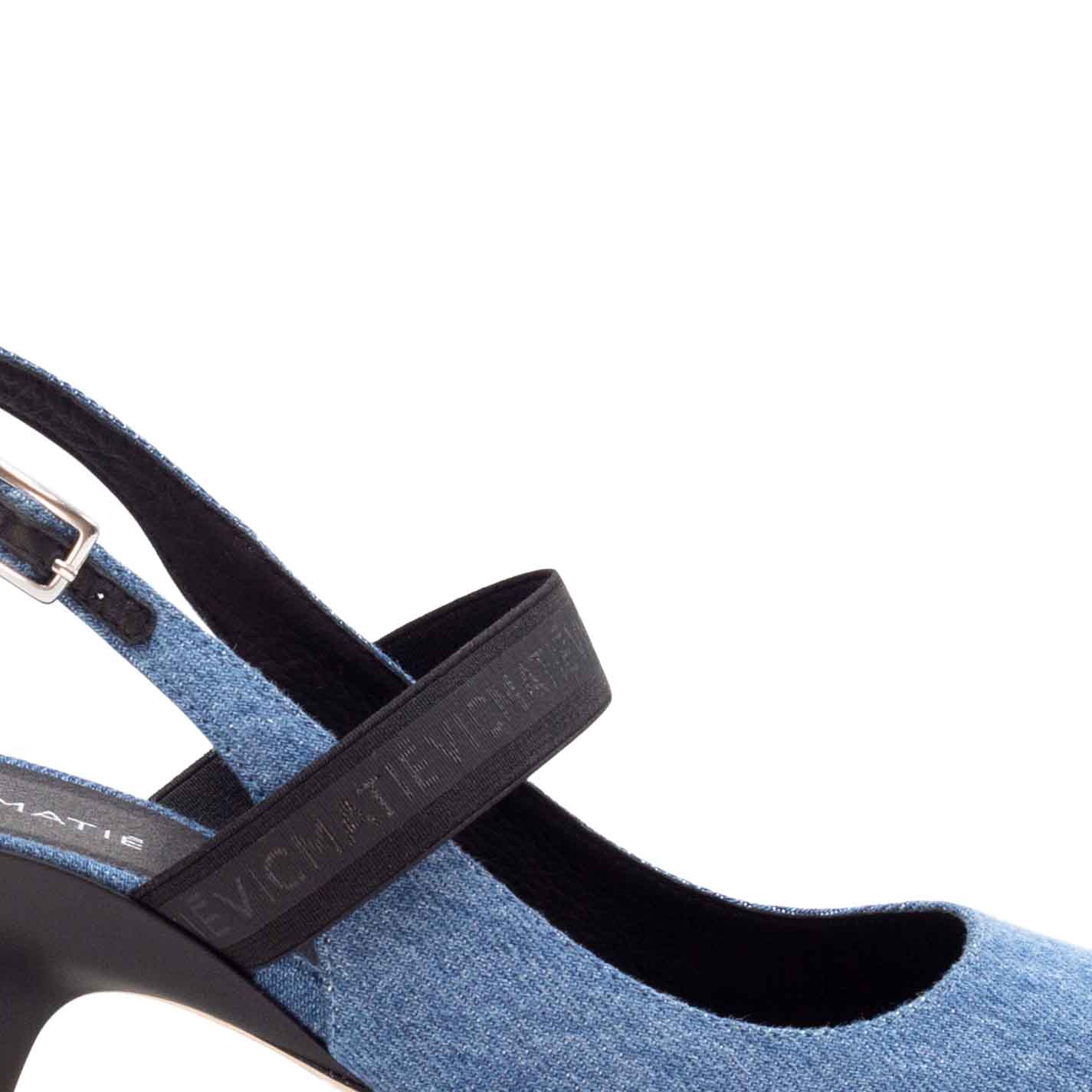 Slash chanel in tessuto jeans azzurro con elastico logato a contrasto. Struttura a punta molto femminile, con tacco verniciato matt che ricorda la "slash". Suola in cuoio. Made in Italy.