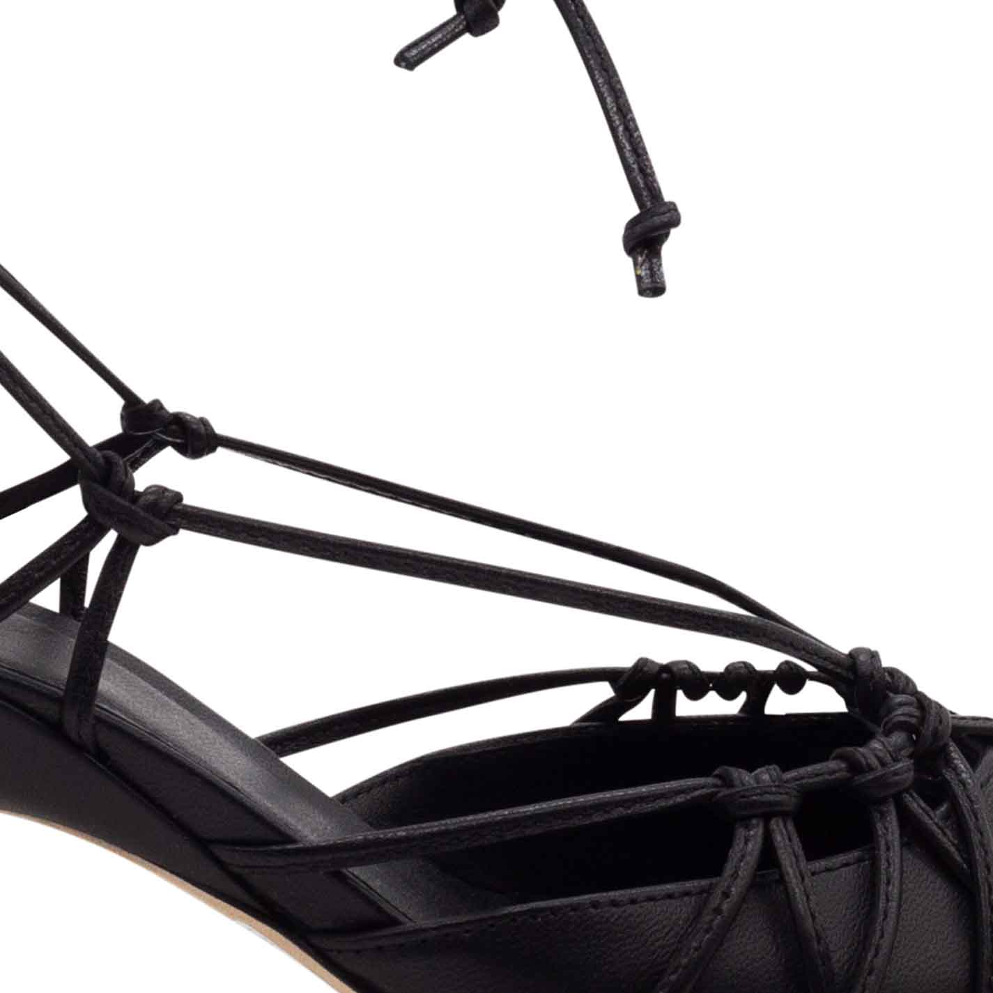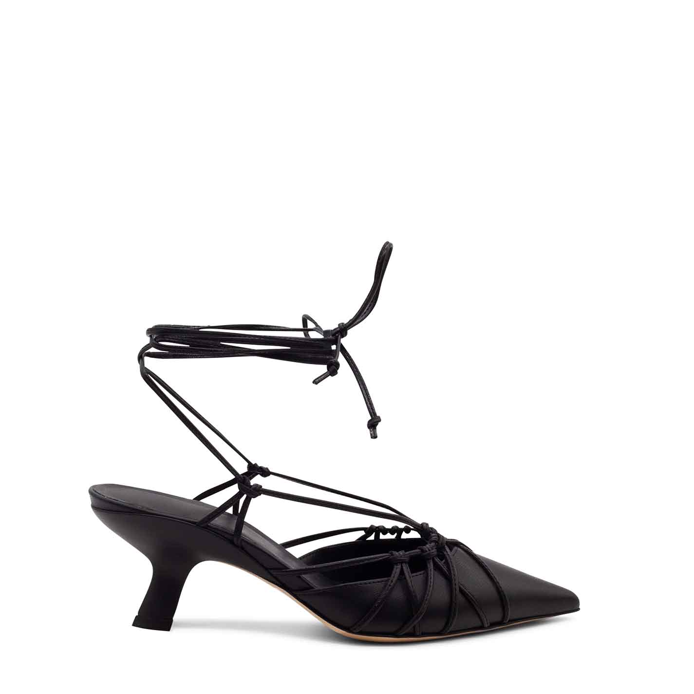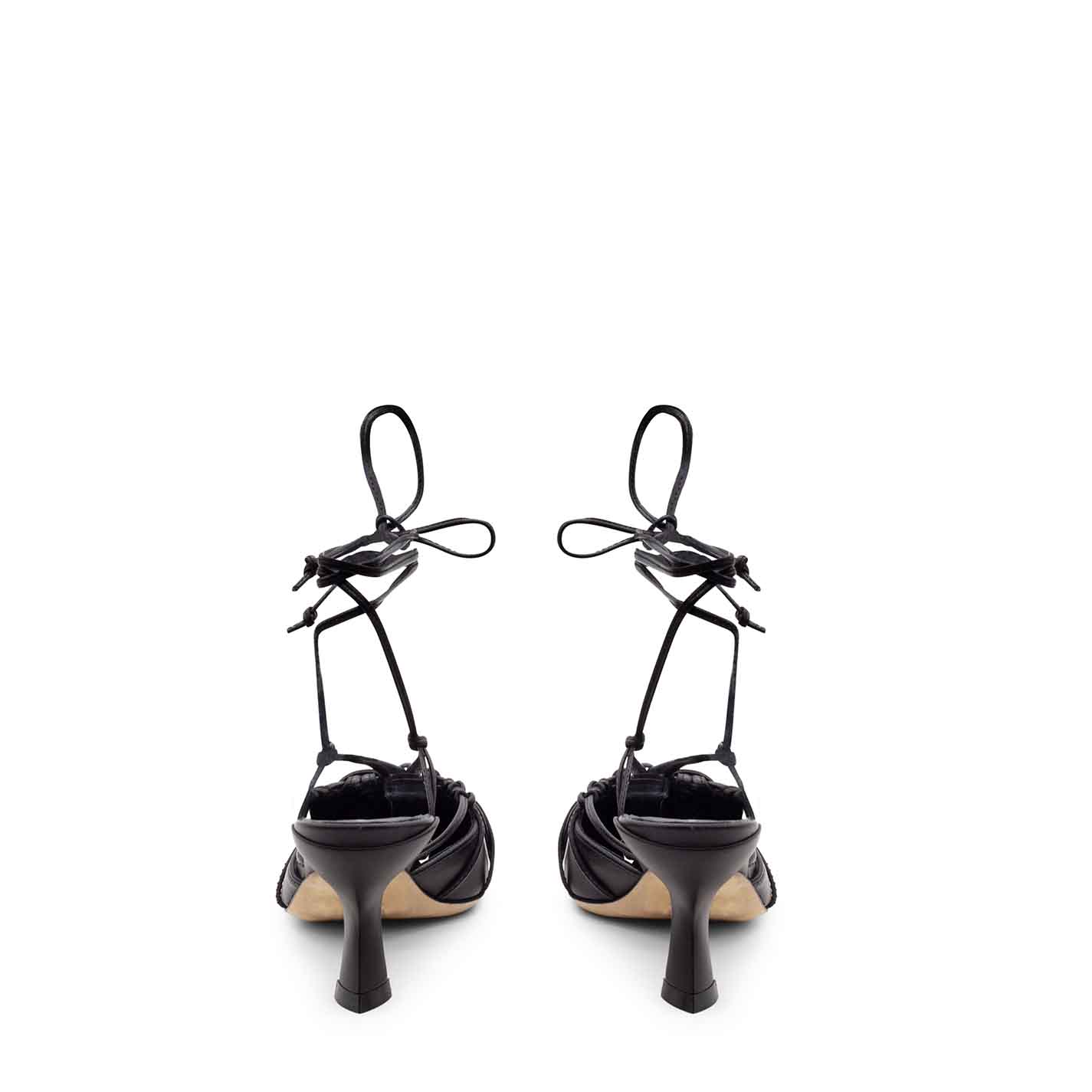Slash sabot intrecciato in morbida nappa nera ,ingabbiato in un intreccio di cappioline di lacci in pelle annodati e liberi da legare poi alla caviglia. Struttura a punta molto femminile, con tacco verniciato matt che ricorda la "slash". Suola in cuoio. Made in Italy.
