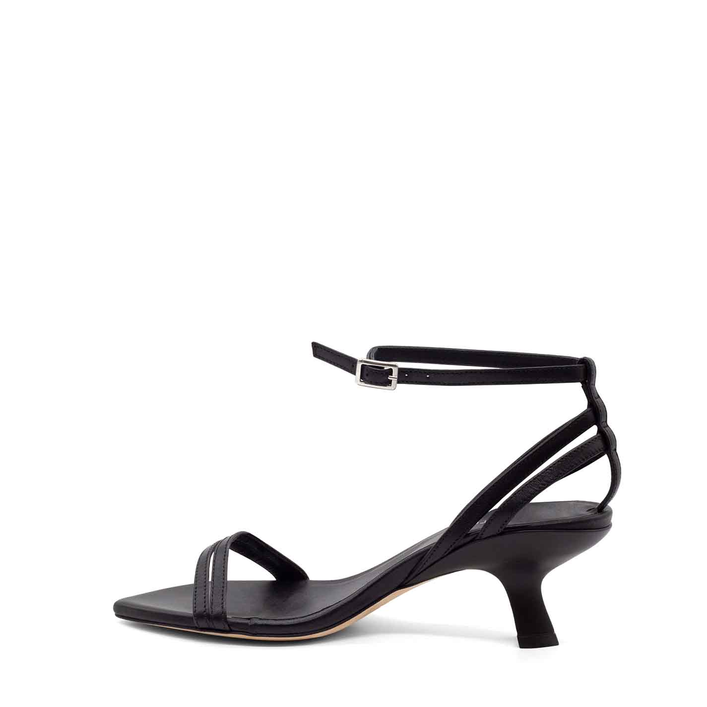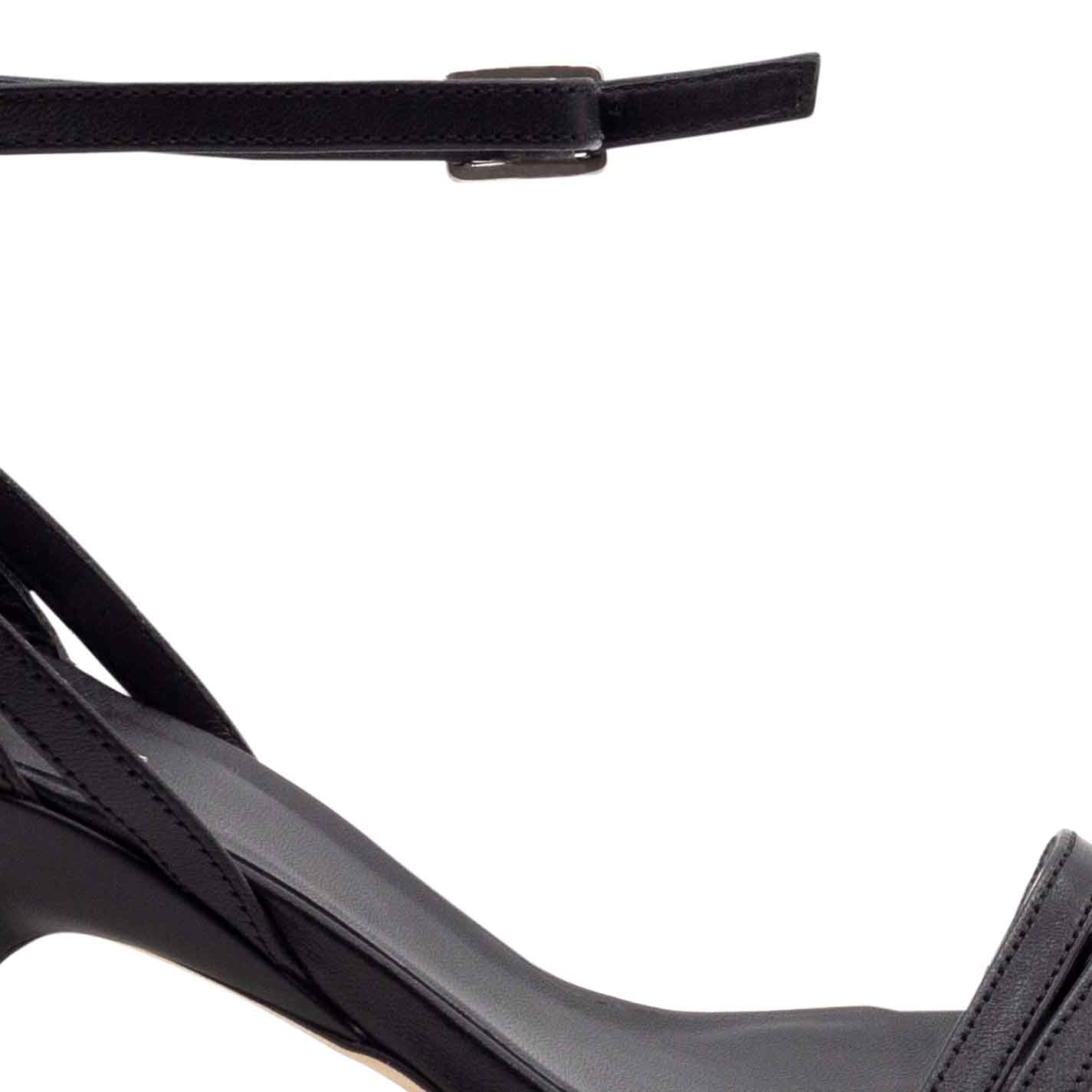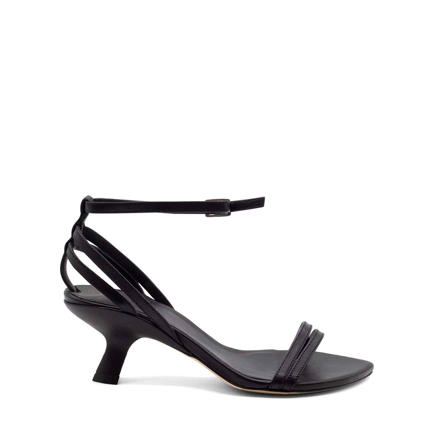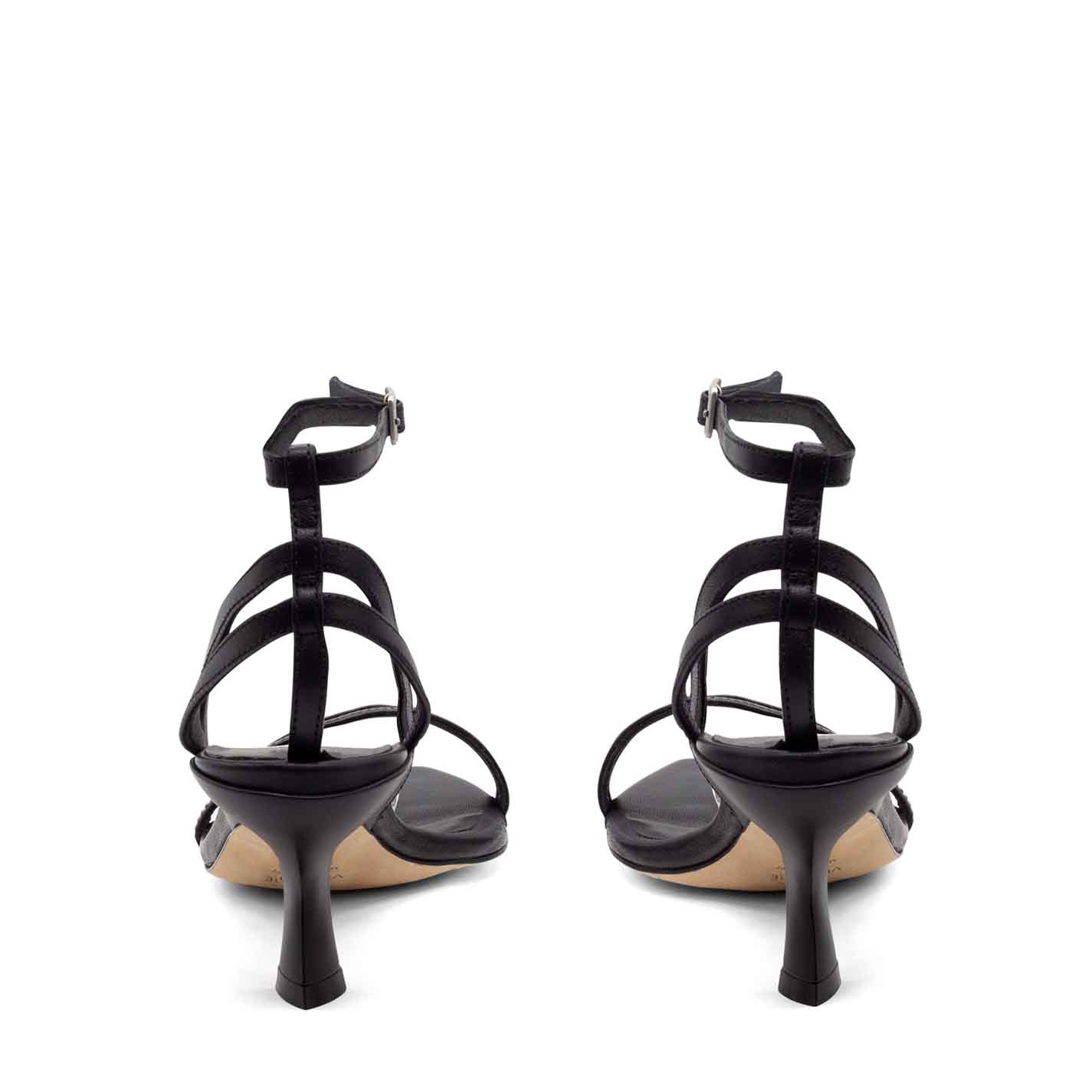 Slash Sandals sandalo listini in nappa nera ,realizzato con gabbia sul tallone e cinturino regolabile alla caviglia. Suola in cuoio dalla punta squadrata, sottopiede ricoperto pelle, tacco verniciato matt. Made in Italy.