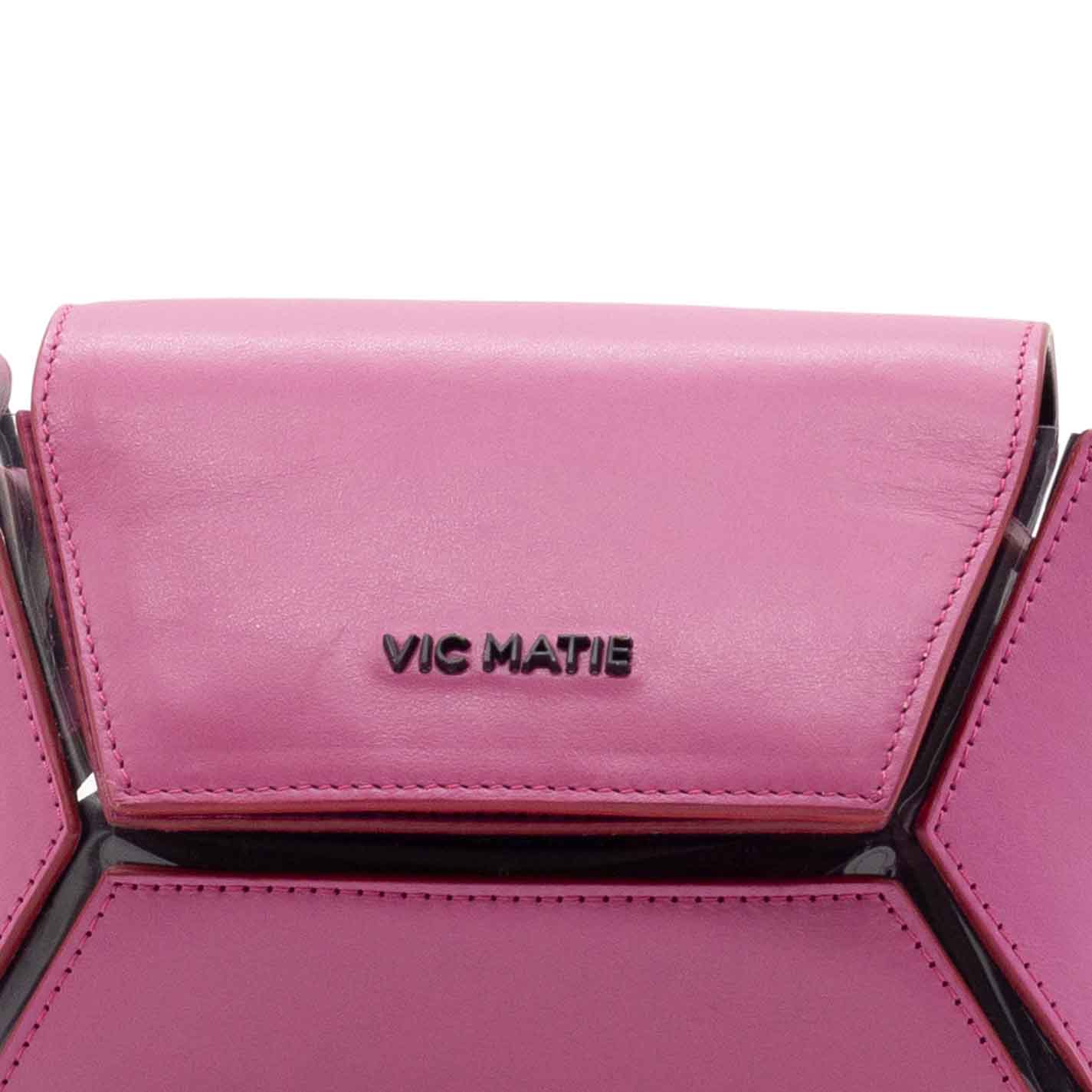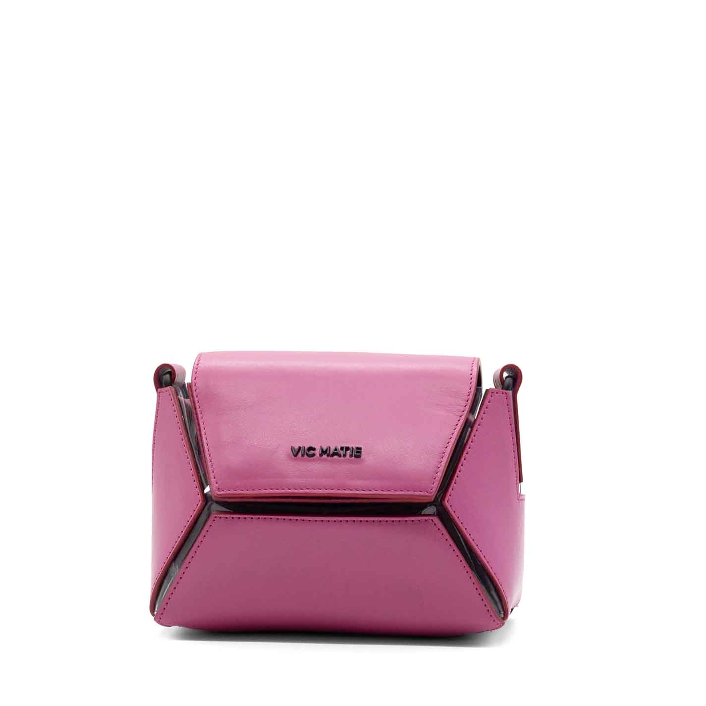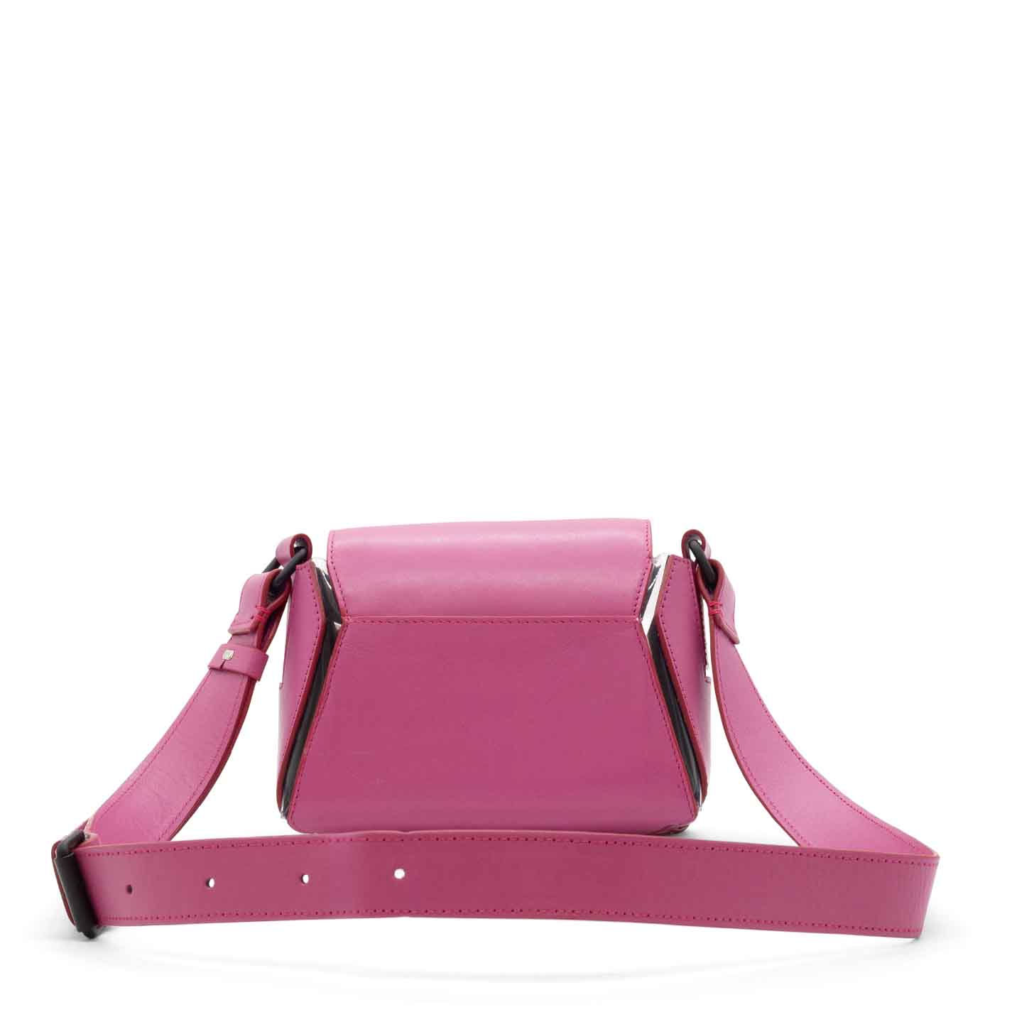 tracollina esagono 3d fuxia/trasparente ,realizzata in pelle di vitello liscio rinforzatole parti geometriche sono cucite su pellame a contrasto;