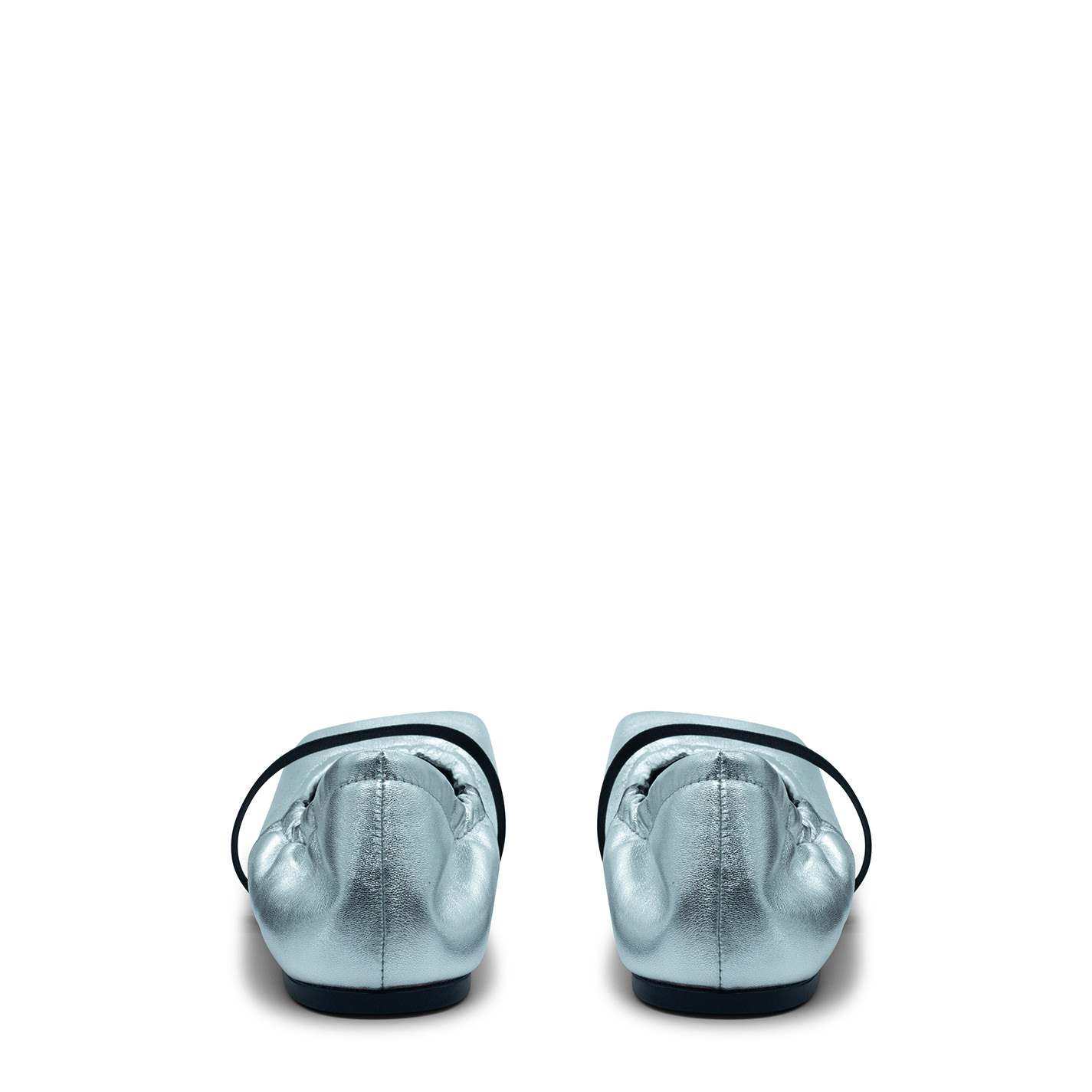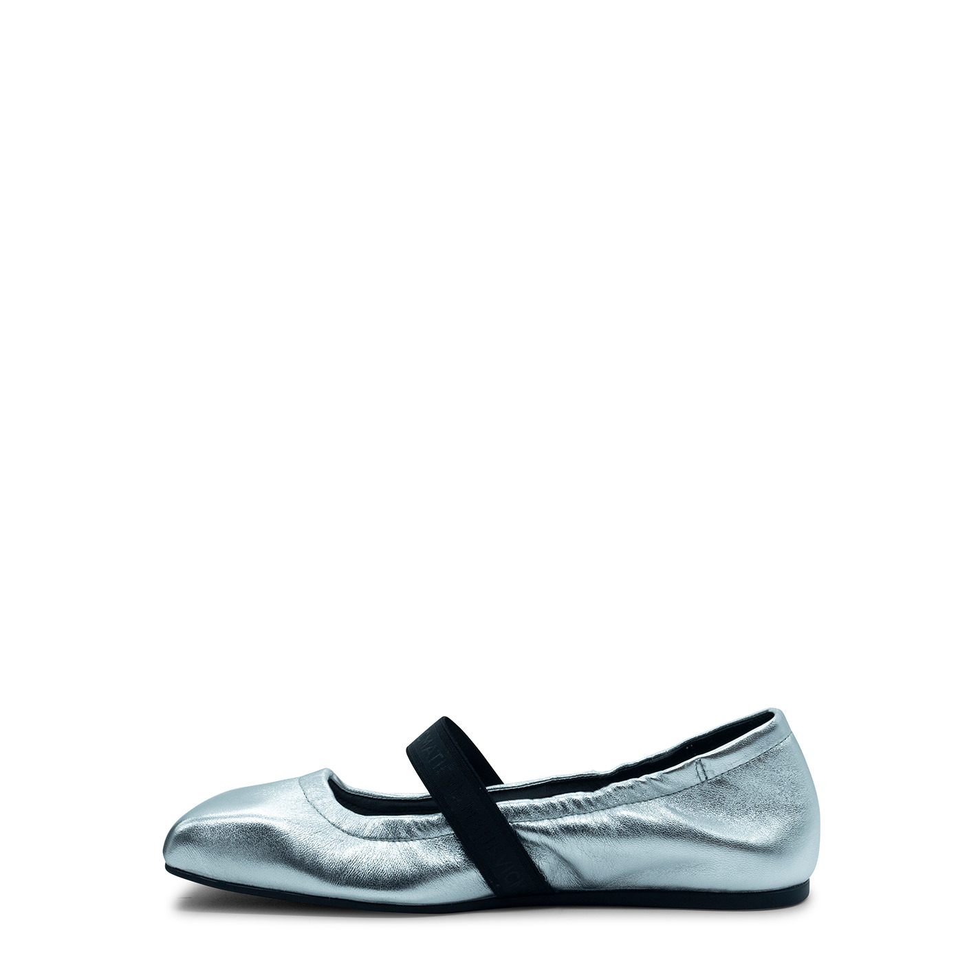 Square closed Ballerina argento, in nappa laminata, con elastico che rende lo scollo arricciato, elastico nero logato sul collo che le permette di avere una maggiore calzabilità. Suola in gomma antiscivolo con maxi logo dalla punta squadrata obliqua;