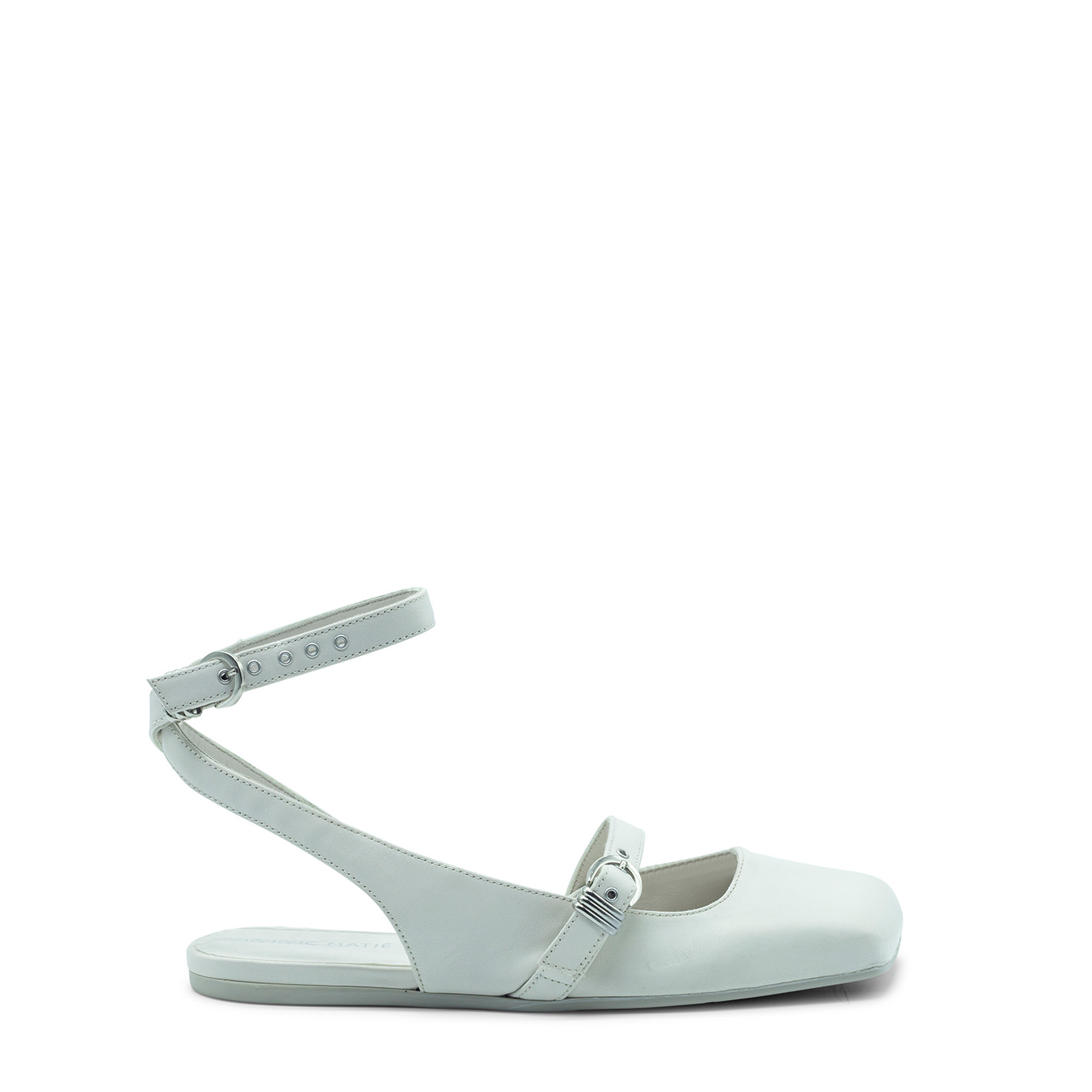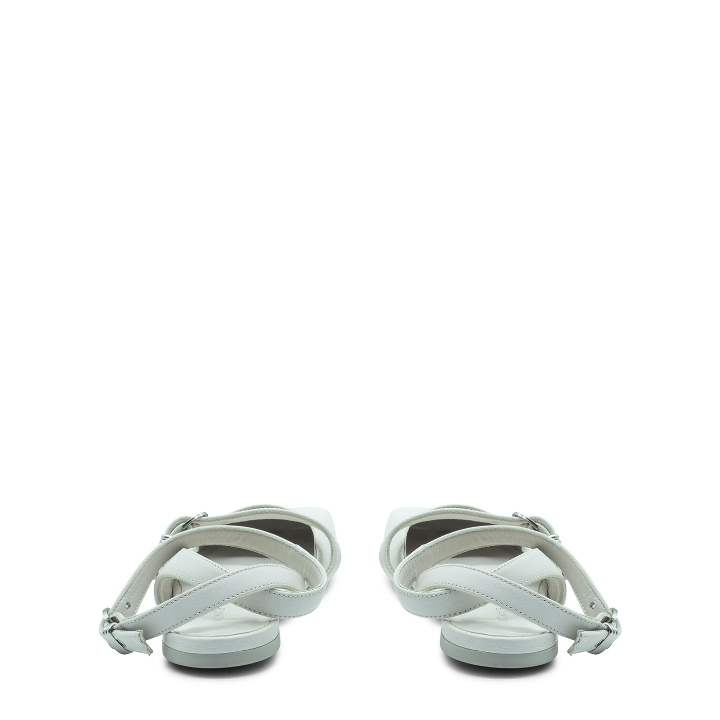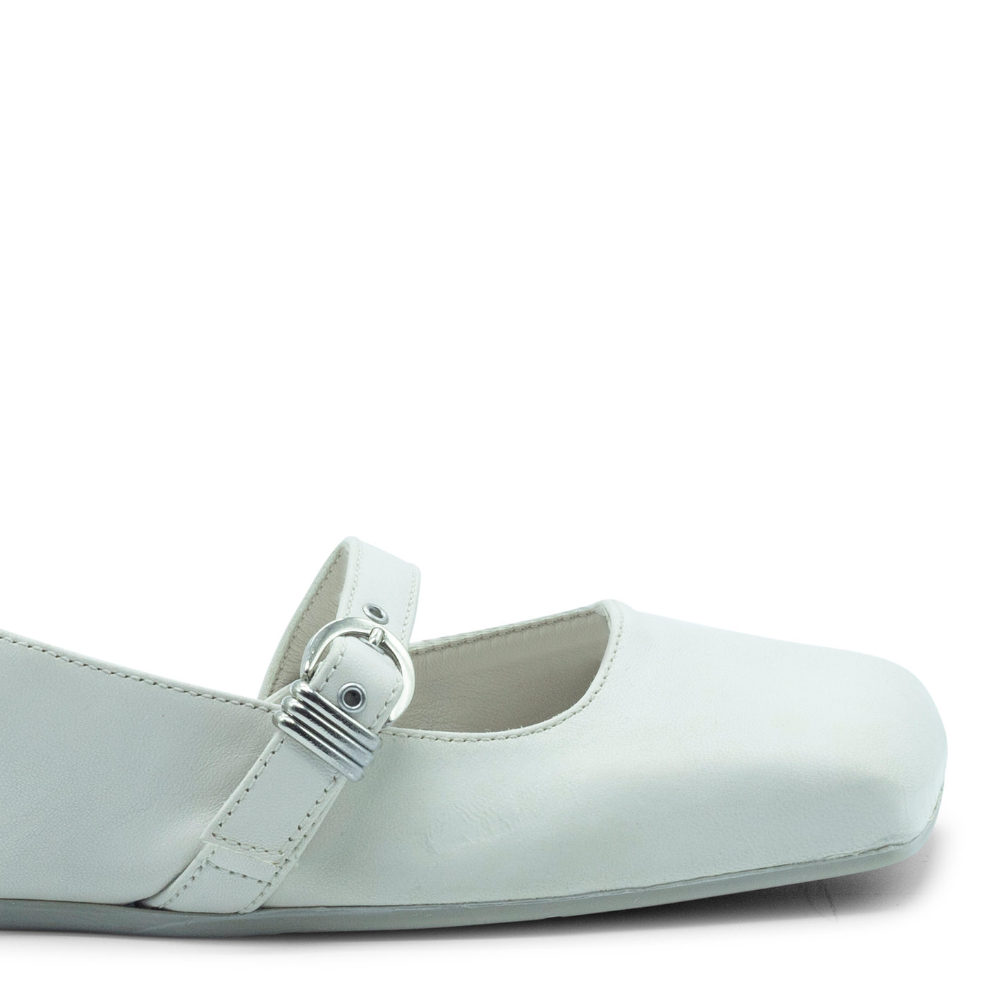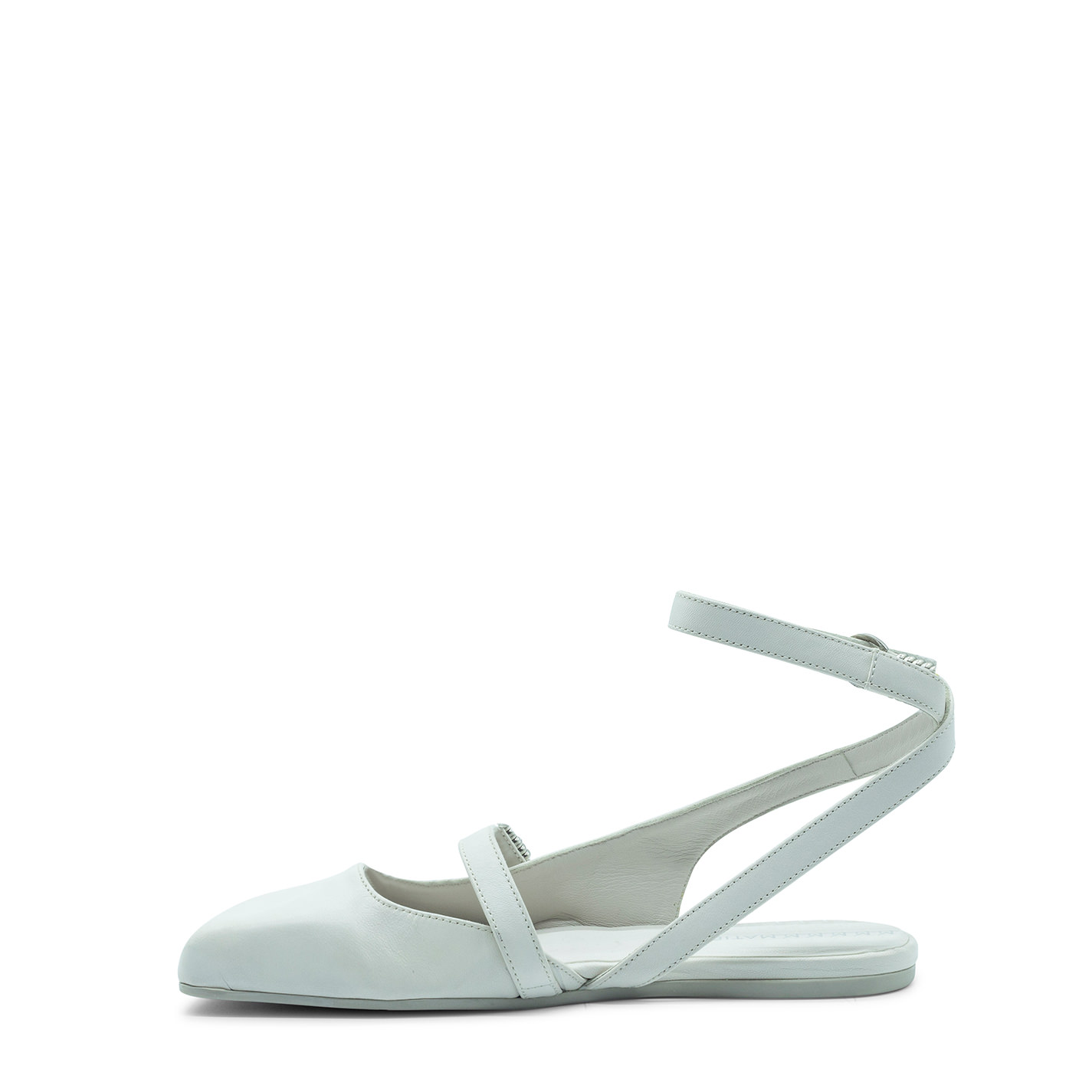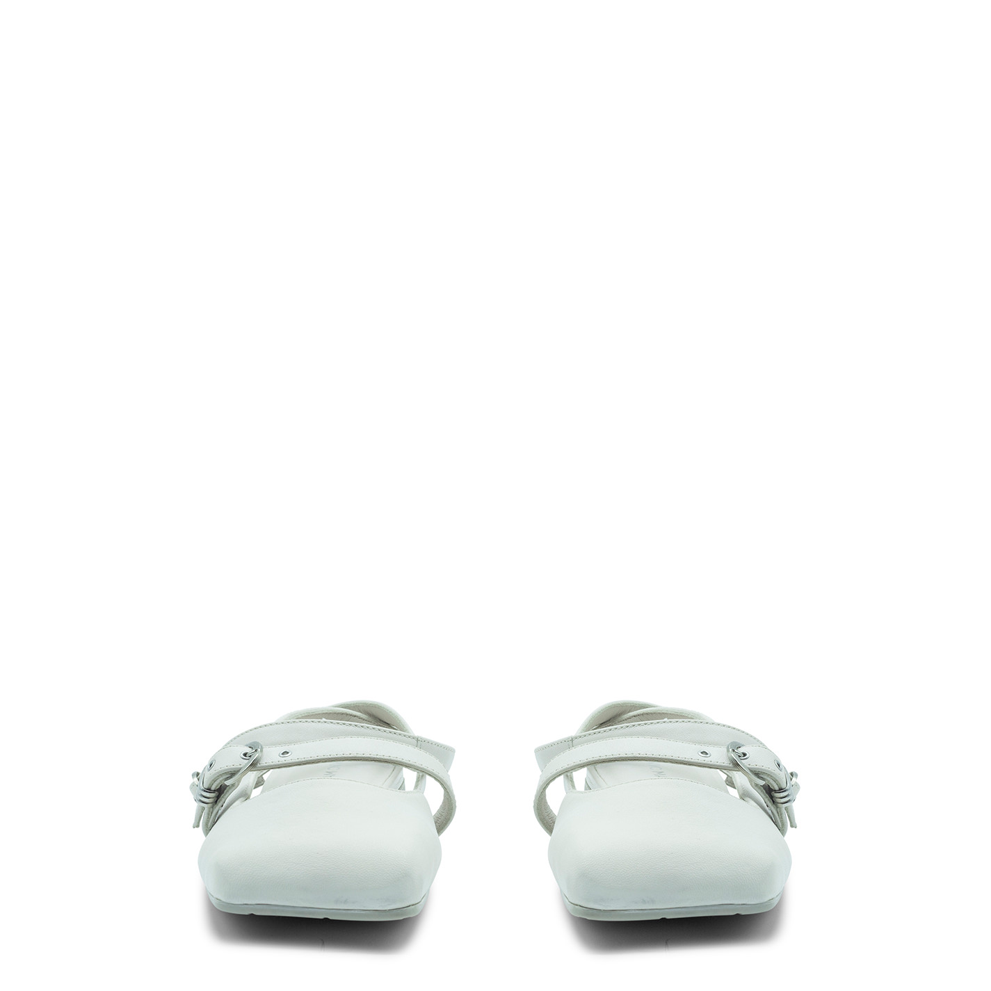 Square closed chanel fibbie panna, in morbida nappa, con scollo asimmetrico, caratterizzata da 2 cinturini che girano rispettivamente alla caviglia e sul collo del piede, allacciate da fibbie regolate da passantine metalliche. Suola in gomma antiscivolo con maxi logo dalla punta squadrata obliqua;