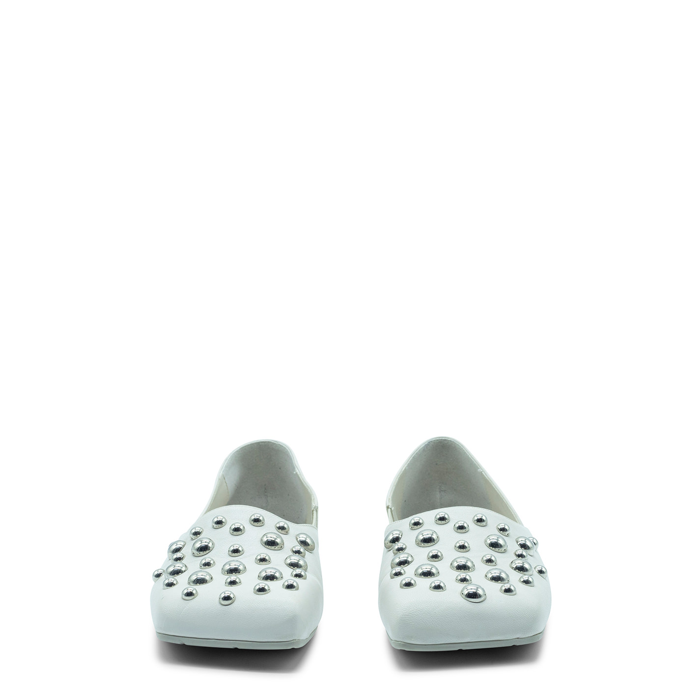 Square closed pantofola panna, in morbida nappa, con borchie semisferiche argento sulla punta. Leggermente accollata, con all'interno un piccolo elastico che le permette di avere una maggiore calzabilità. Suola in gomma antiscivolo con maxi logo dalla punta squadrata obliqua;