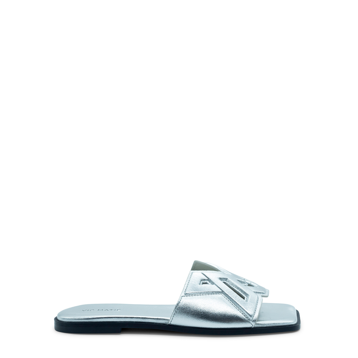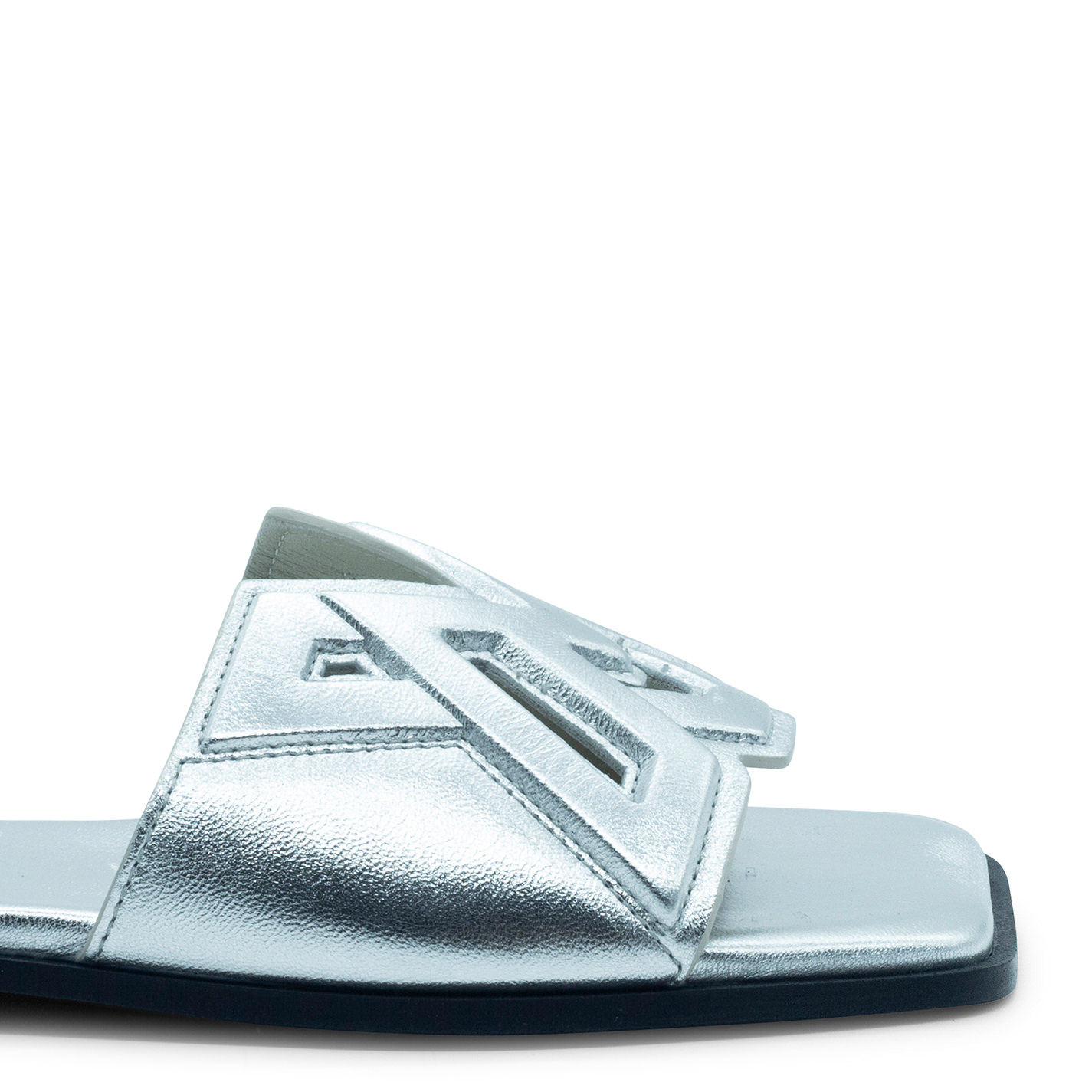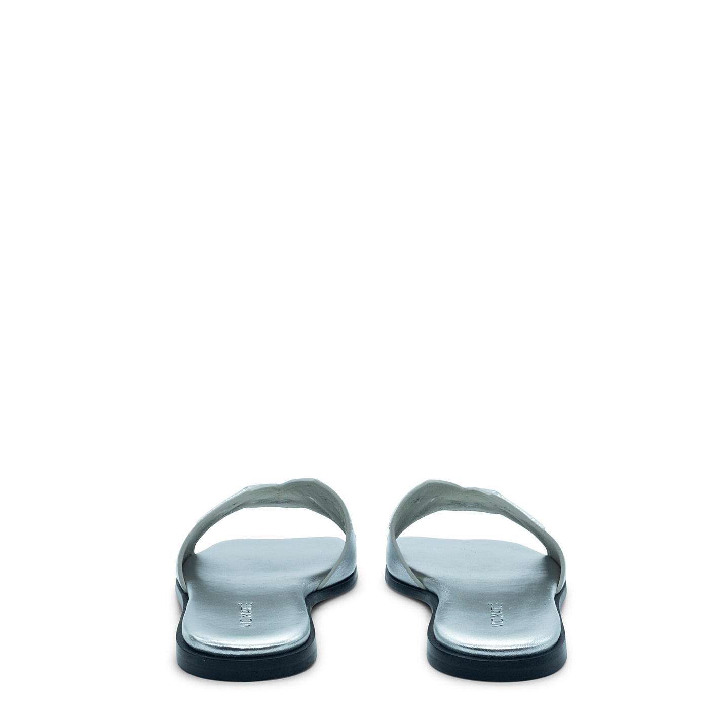 Square open ciabatta monogram argentorealizzato in nappa laminata con lavorazione del logo VM in rilievo, cucito e traforato. Suola in cuoio con tacco antiscivolo in gomma. Sottopiede leggermente imbottito e rivestito in pelle. Made in Italy.