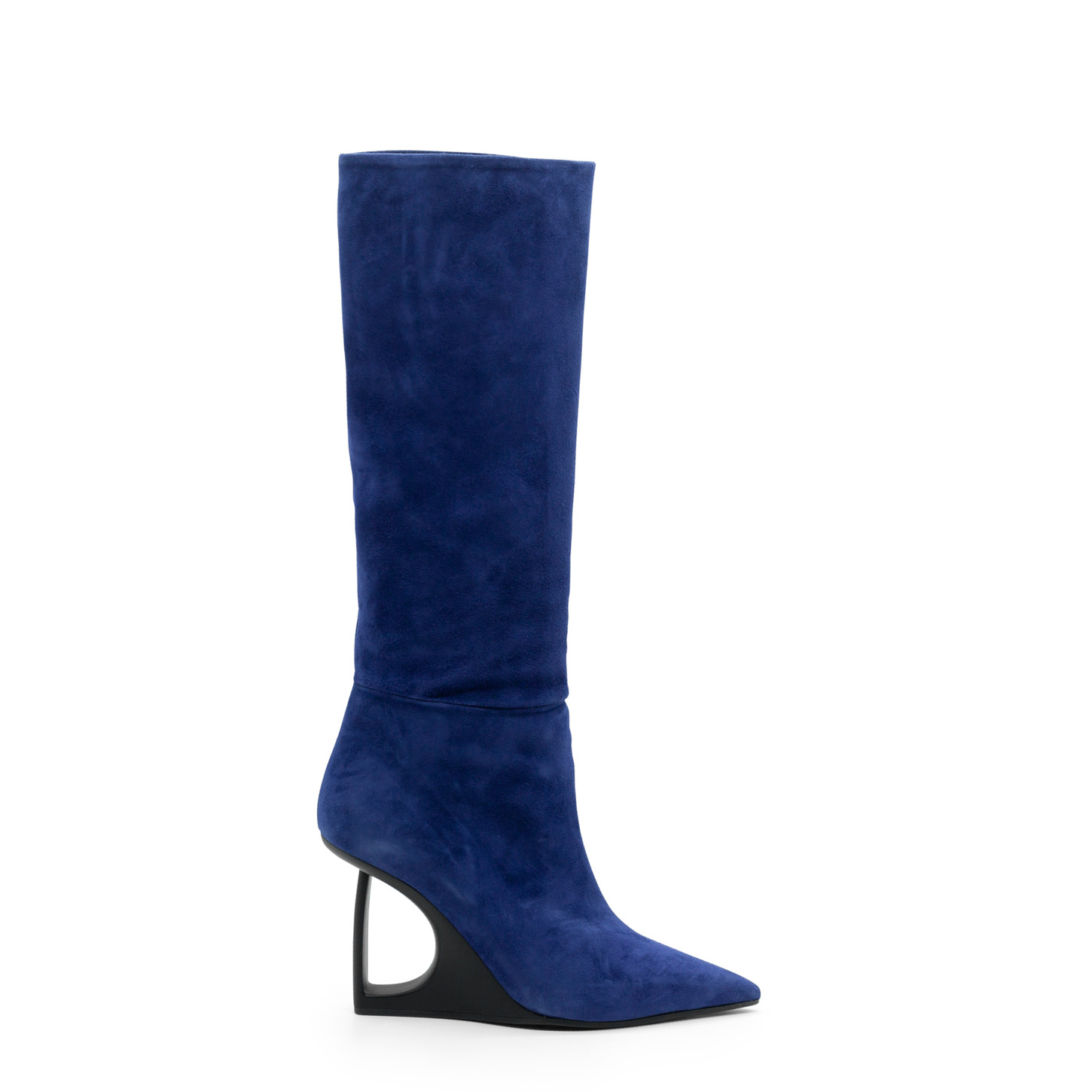 Stivale "D" a tubo zaffiro realizzato in morbido camoscio. Tacco zeppa in abs verniciato, la design che interpreta la "D "di donna. Suola in gomma antiscivolo. Made in Italy.