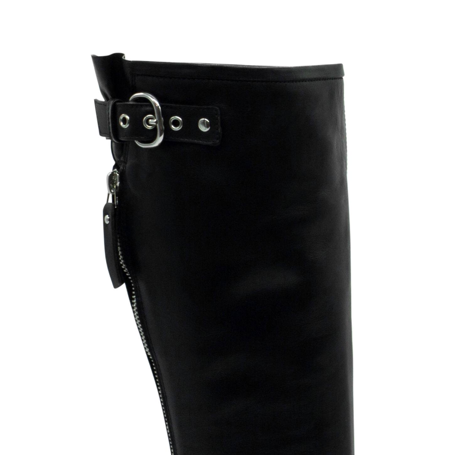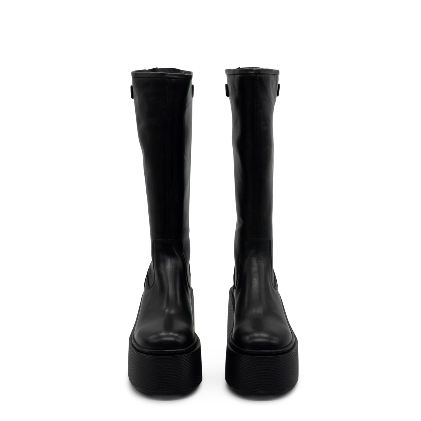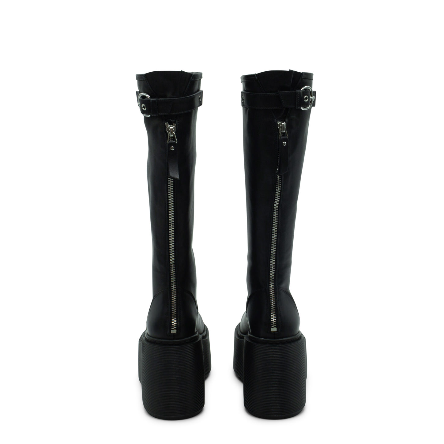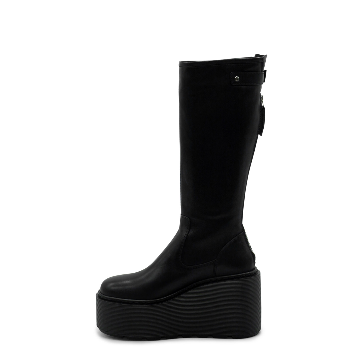 Stivale zeppa Stripy nero dal gusto biker in pelle di vitello liscia, con zip di metallo sul retro e cinturino con fibbia regolabile. Zeppa in gomma effetto rigato, con battistrada a tacche antiscivolo. Made in Italy.