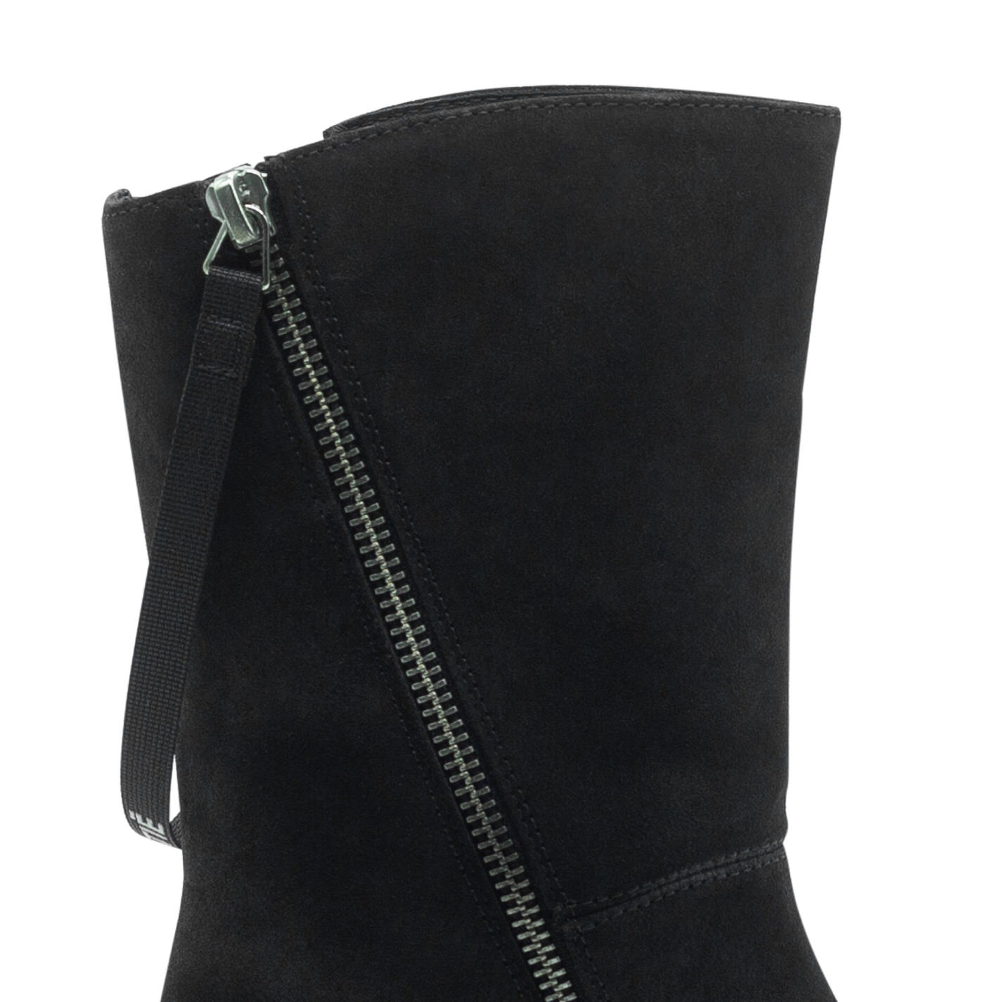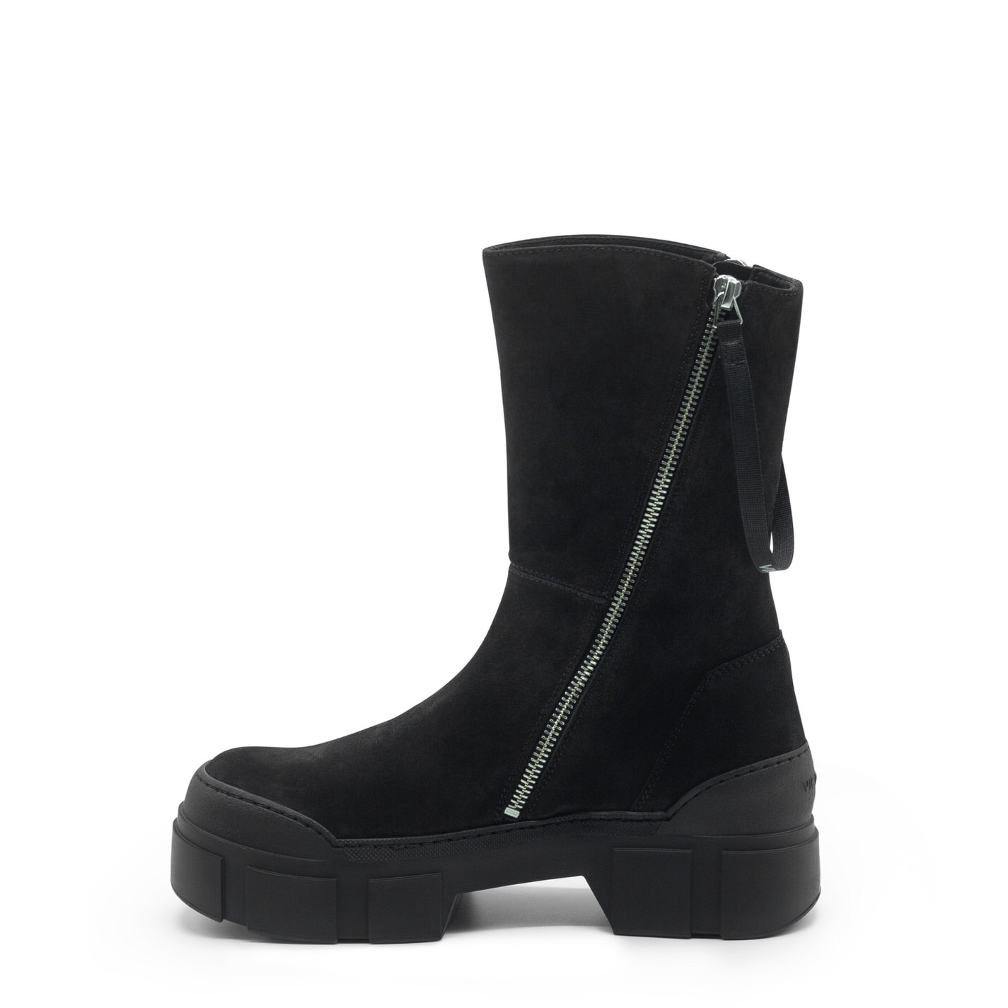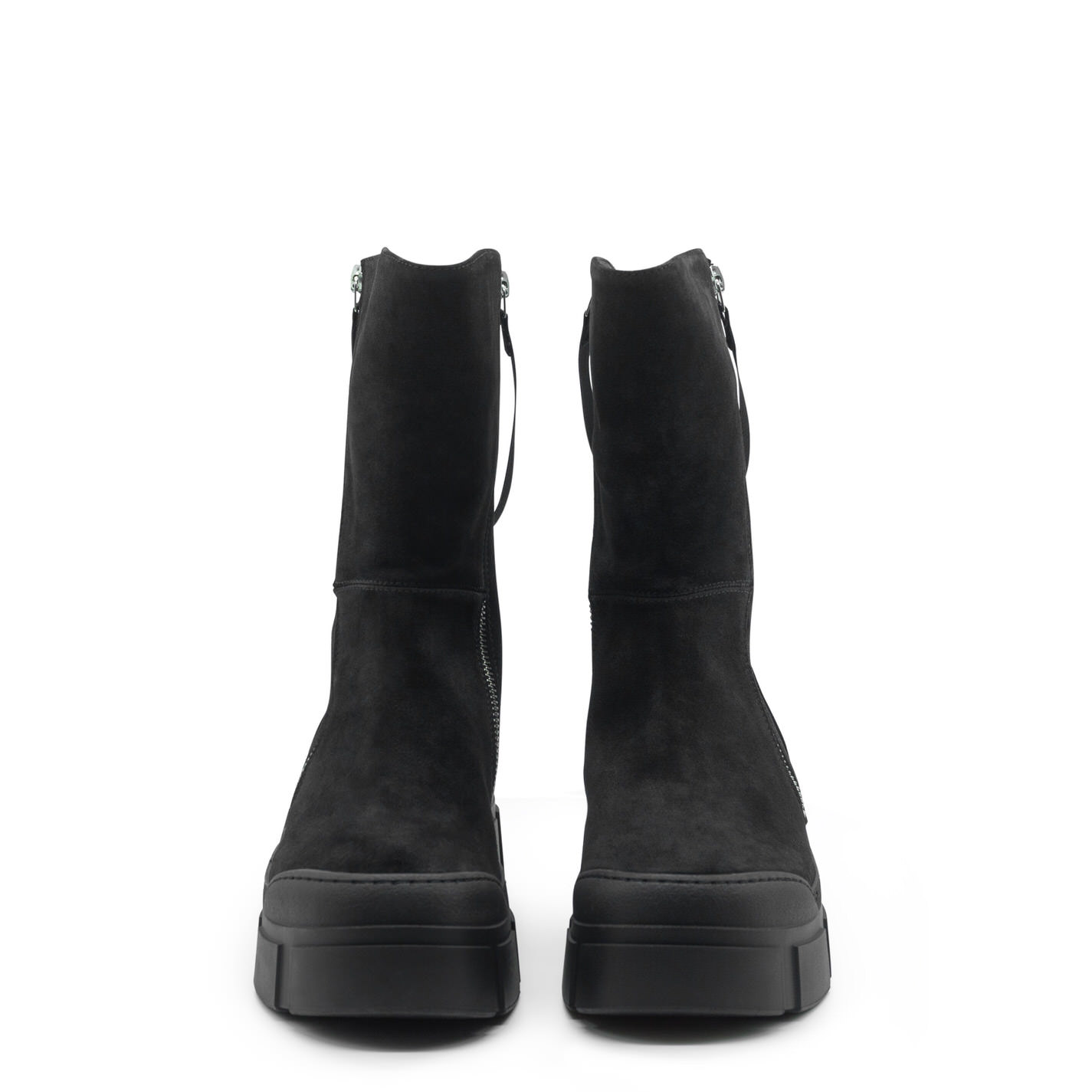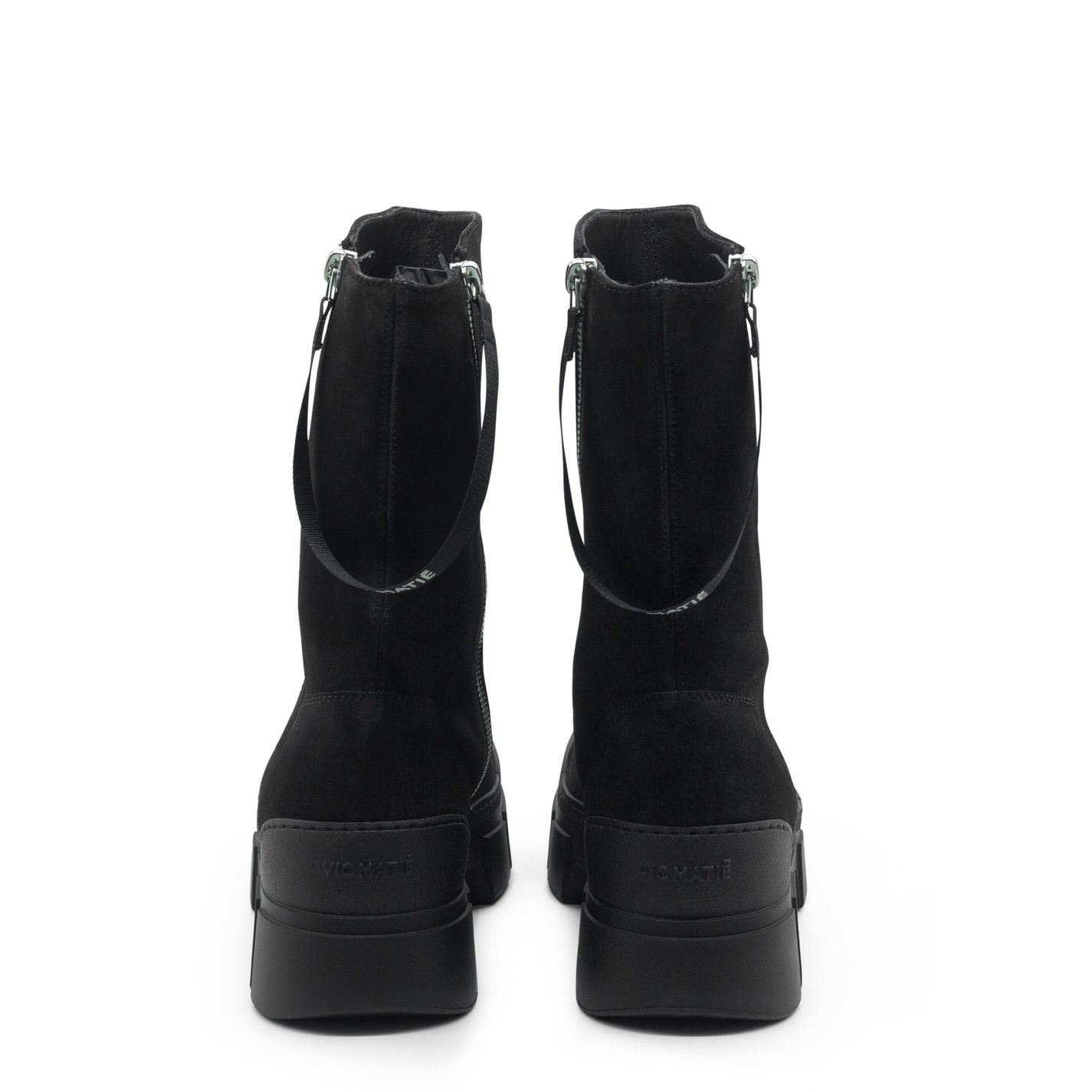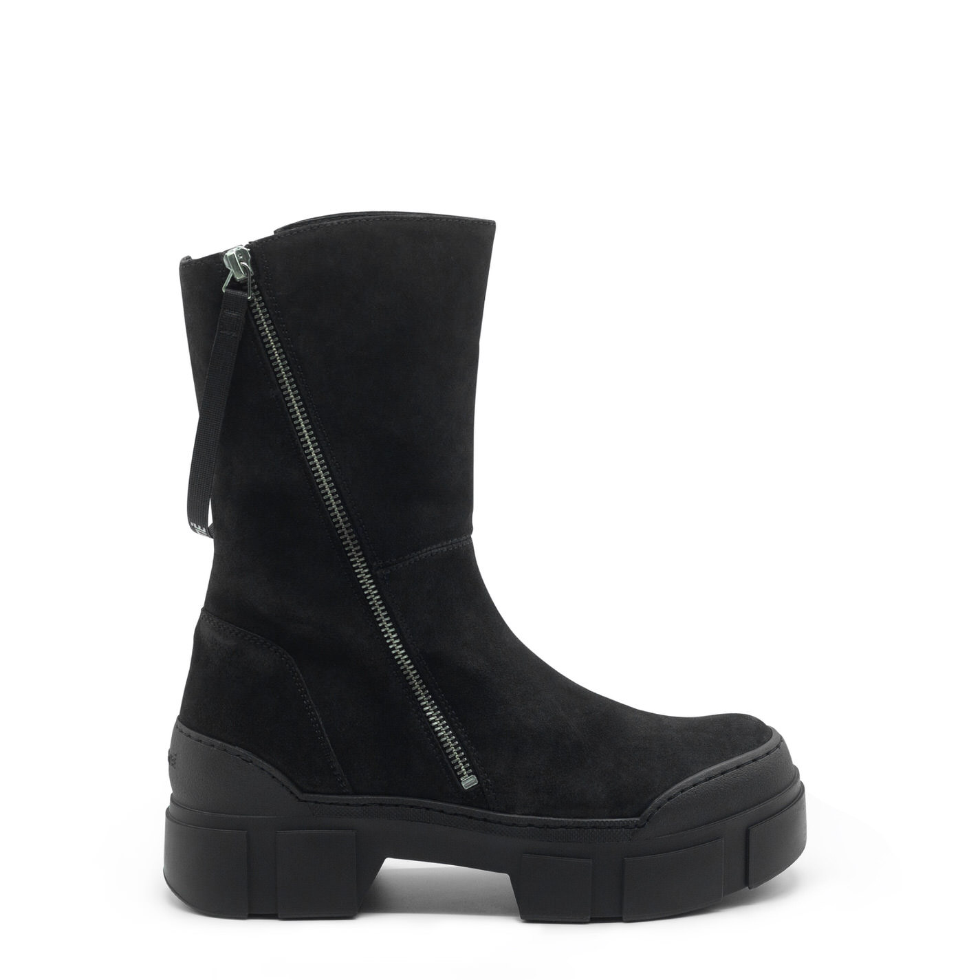 Stivaletto Roccia in crosta nera effetto lavato, doppie zip di metallo con tirante in gros grain logato, collegato tra loro. Suola guscio in TPU con tacche a rilievo e plantare TAG morbido ricoperto in pelle di vitello. Made in Italy.