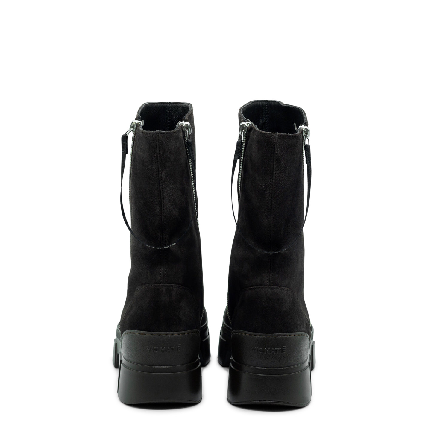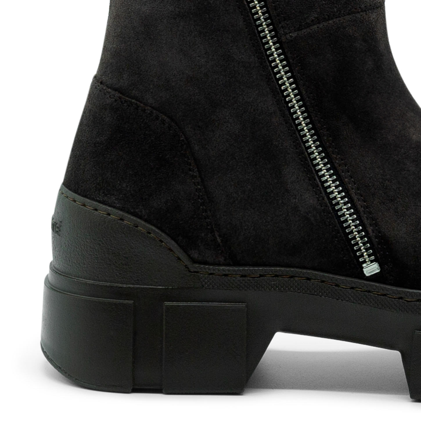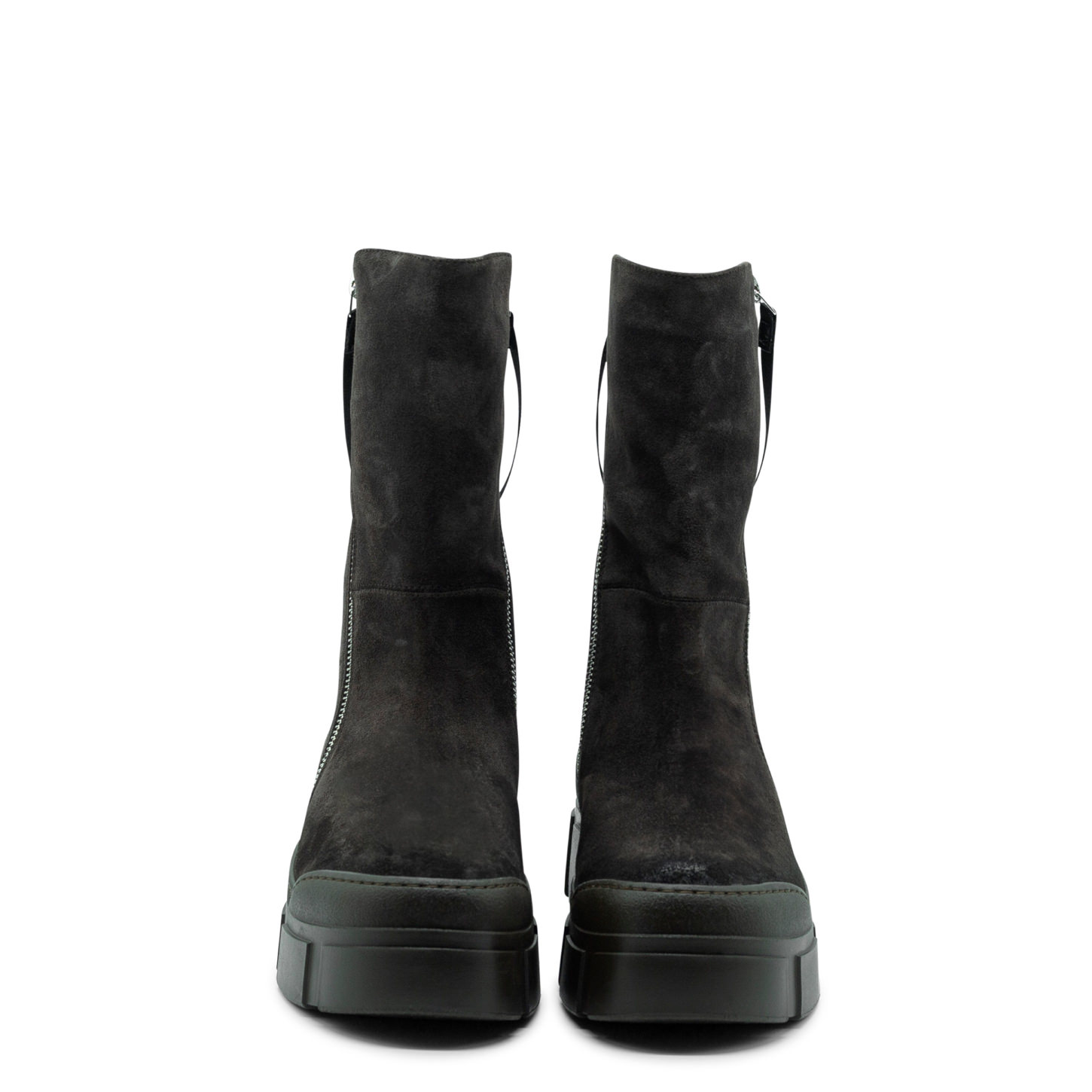 Stivaletto Roccia in crosta testa di moro effetto lavato, doppie zip di metallo con tirante in gros grain logato, collegato tra loro. Suola guscio in TPU con tacche a rilievo e plantare TAG morbido ricoperto in pelle di vitello. Made in Italy.