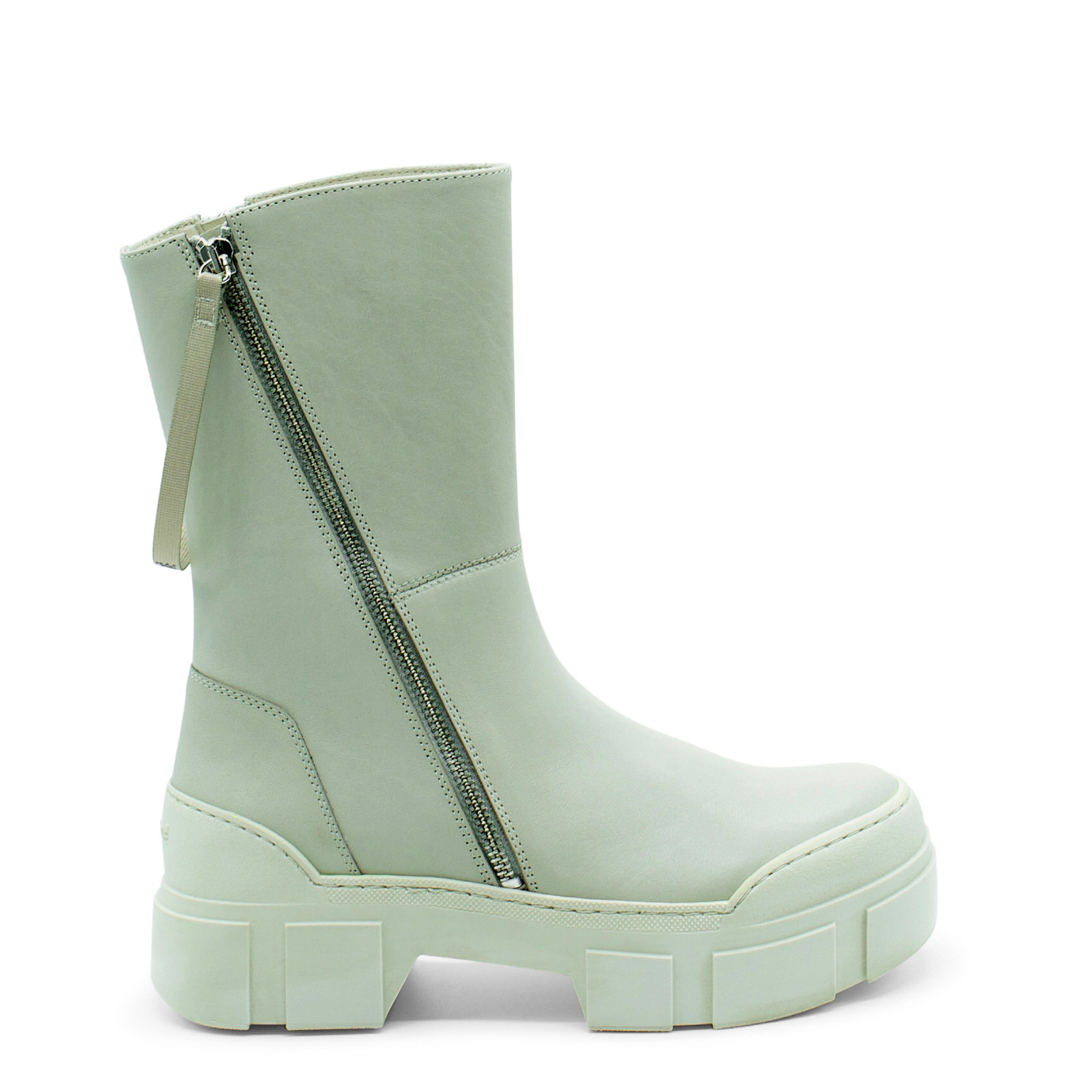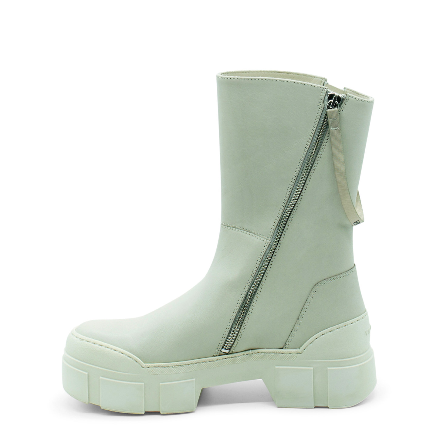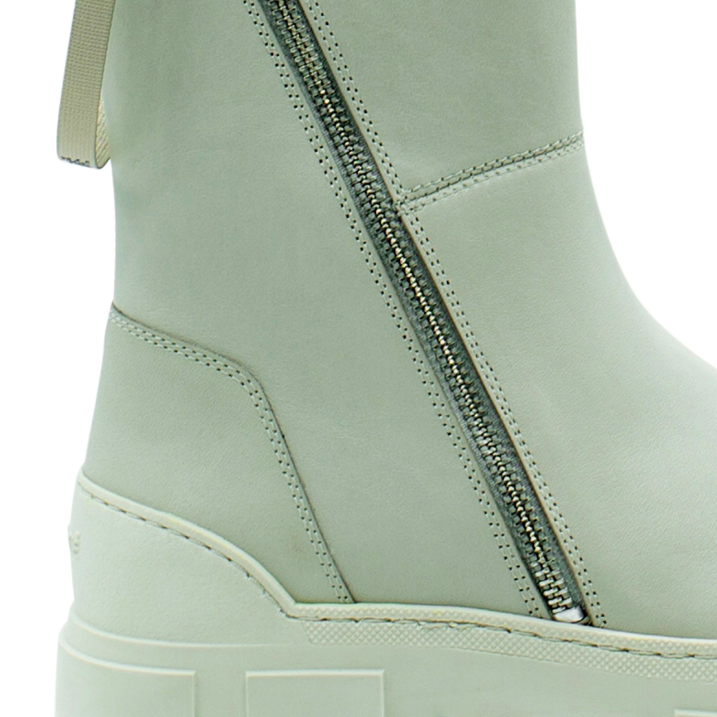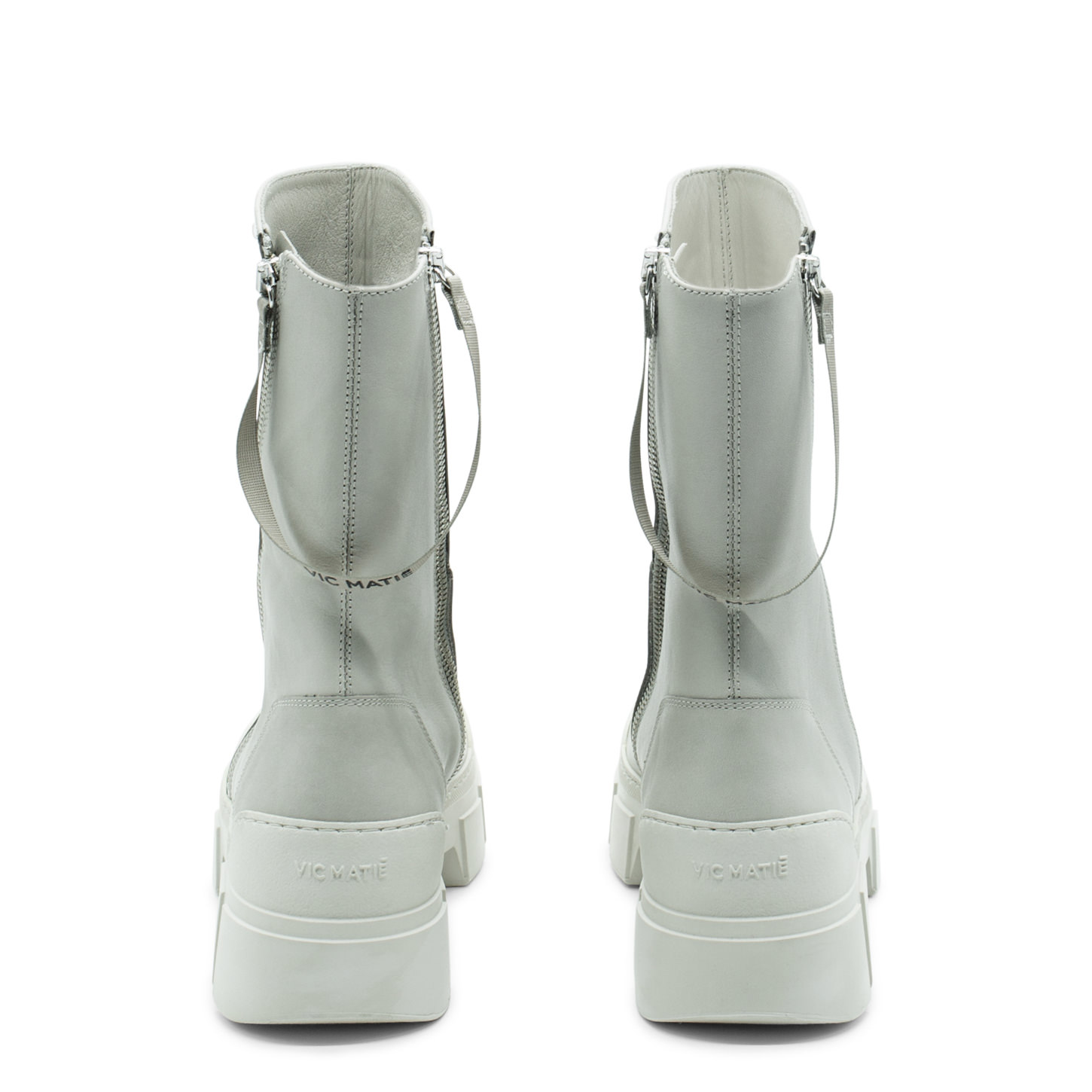 Stivaletto Roccia osso in pelle di vitello opaco nappato, doppie zip di metallo con tirante in gros grain logato, collegato tra loro. Suola guscio in TPU con tacche a rilievo e plantare TAG morbido ricoperto in pelle di vitello. Made in Italy.
