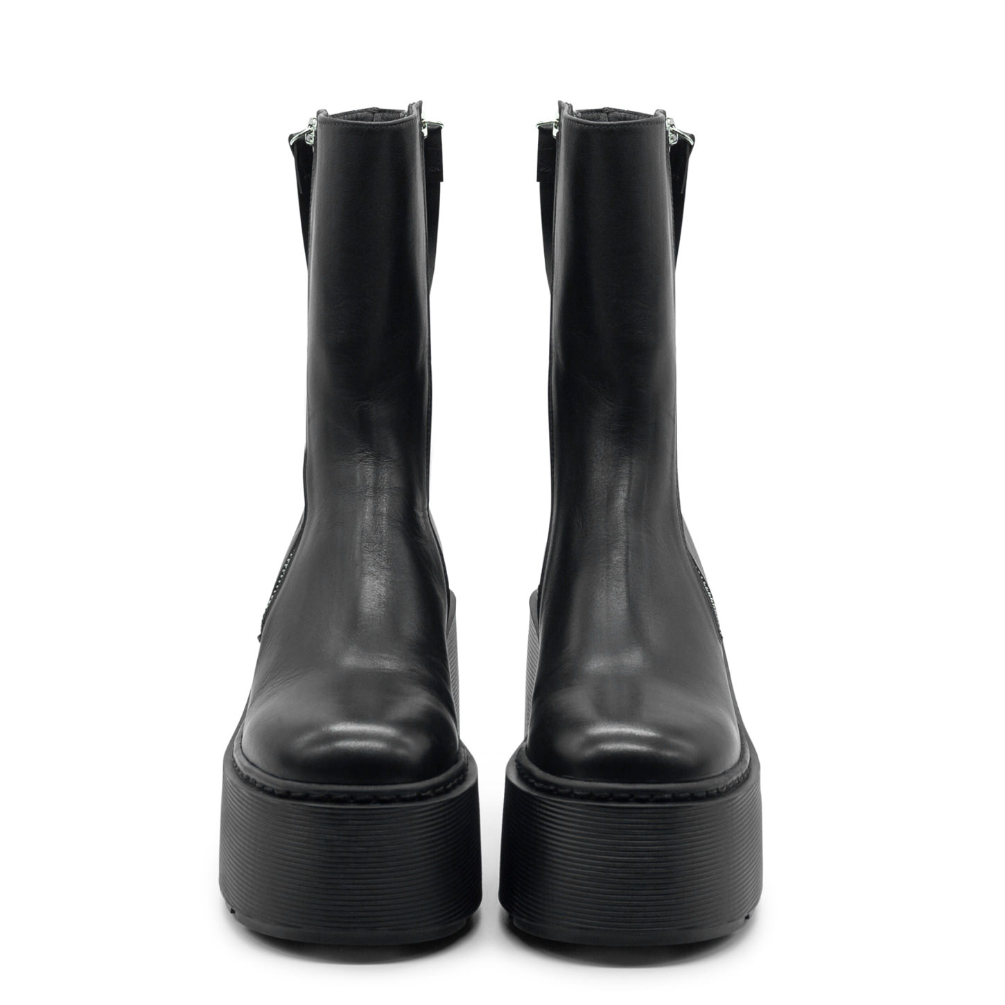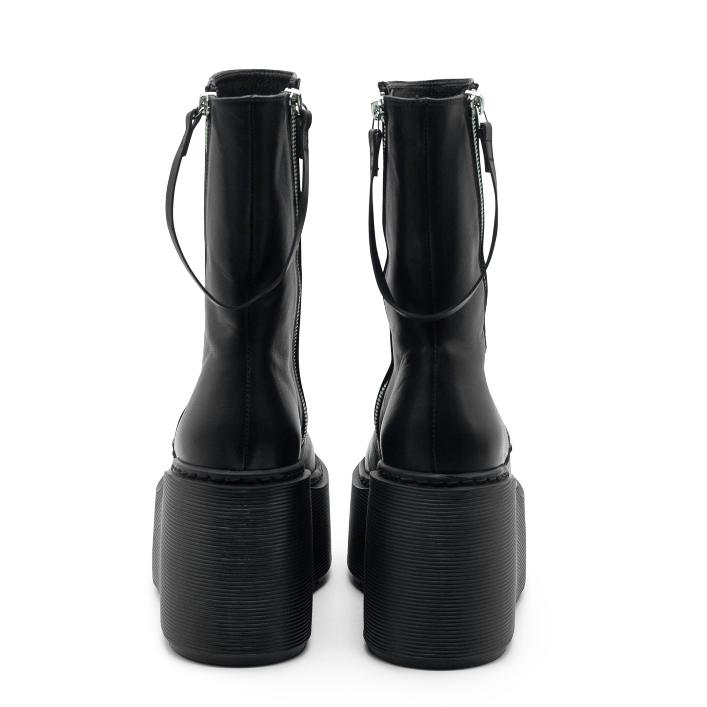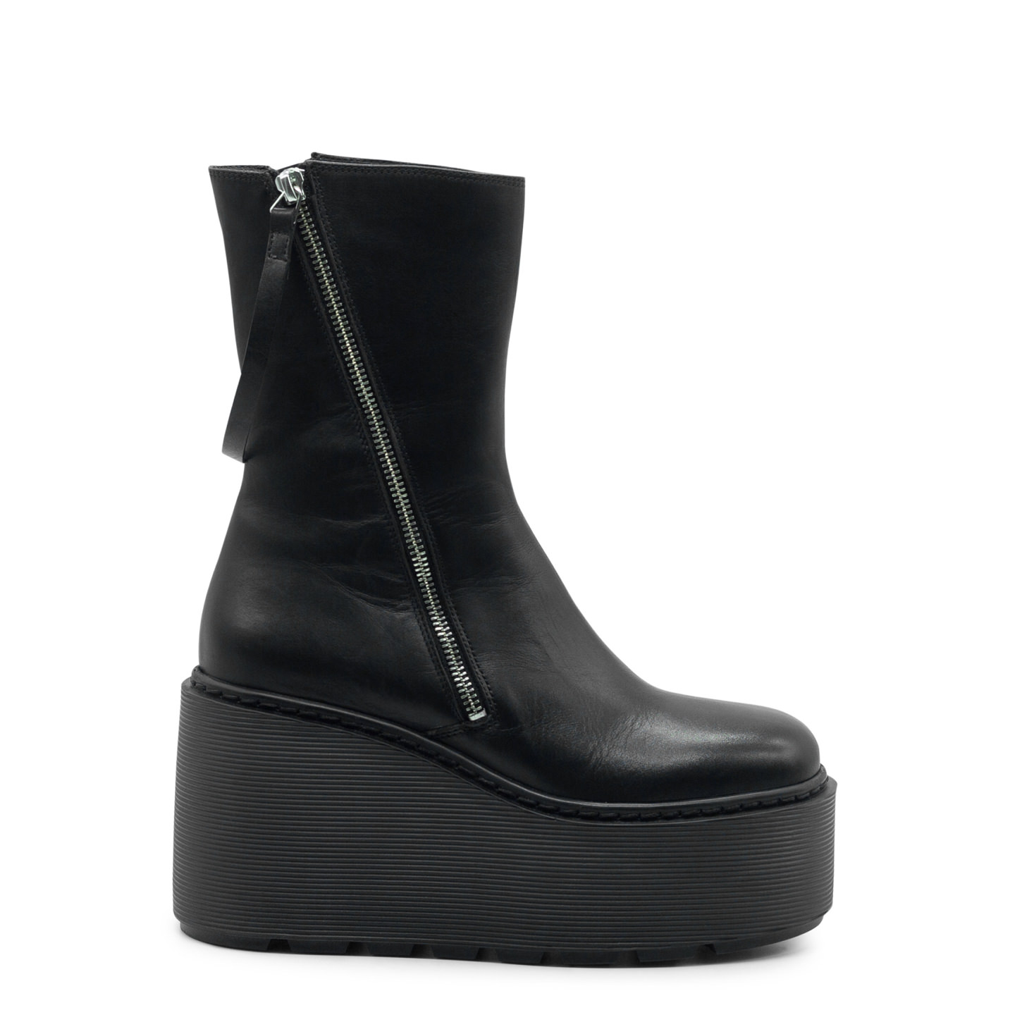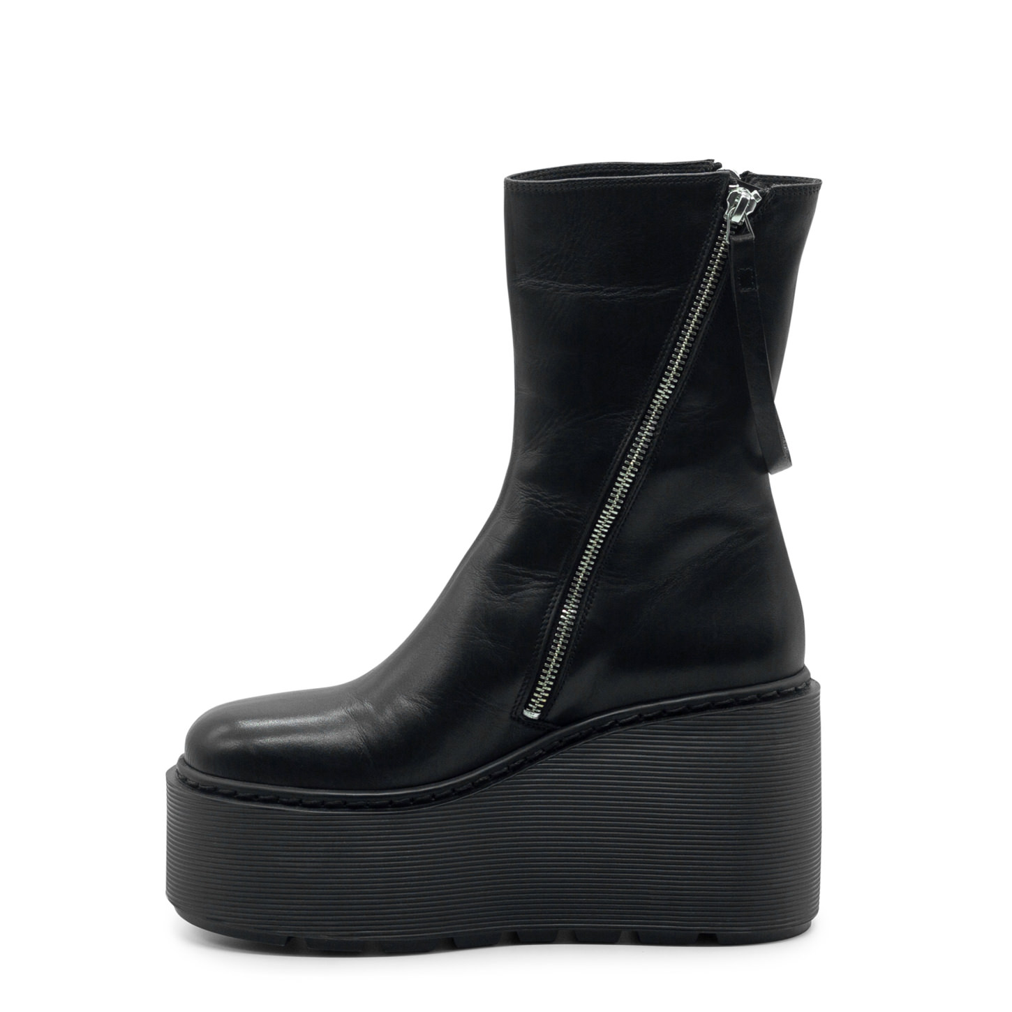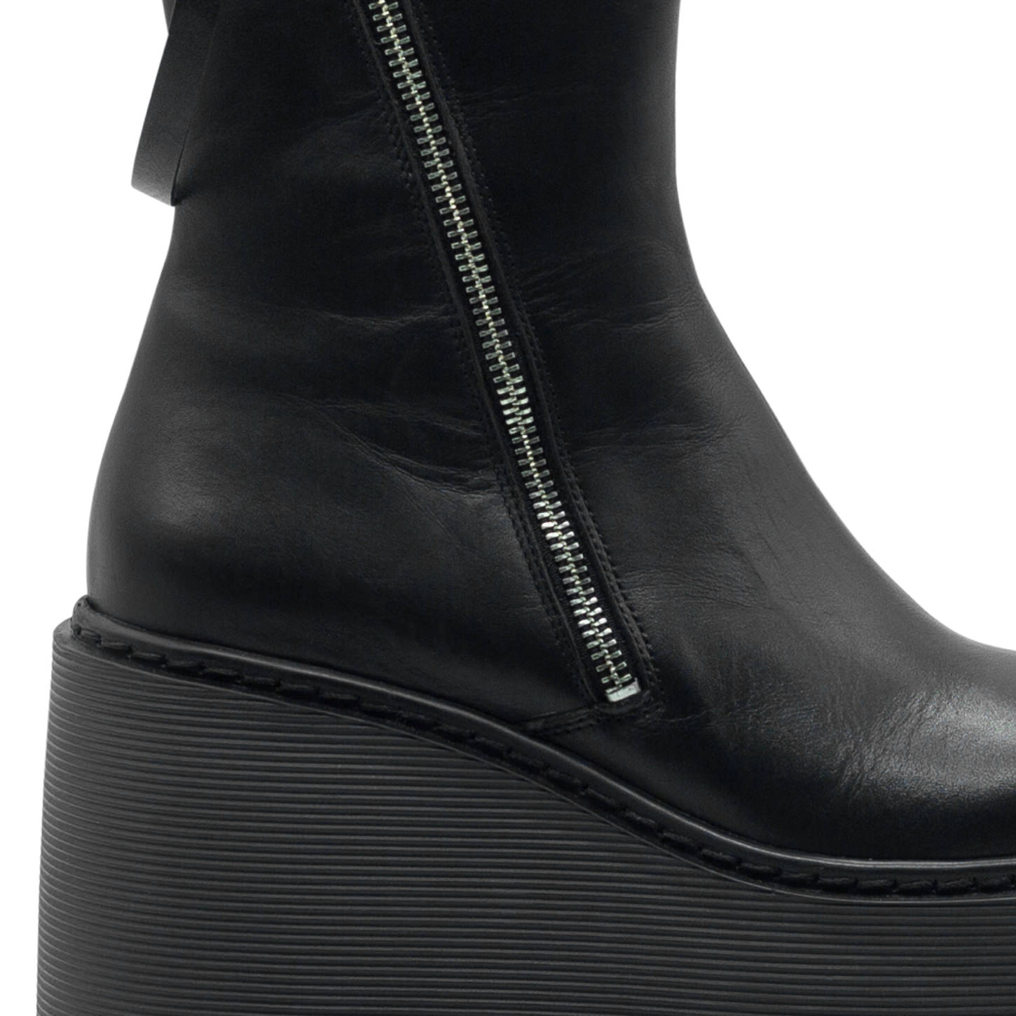 Stivaletto zeppa Stripy nero in pelle di vitello liscia, doppie zip di metallo collegate tra loro dal tirante in pelle. Zeppa in gomma effetto rigato, con battistrada a tacche antiscivolo. Made in Italy.