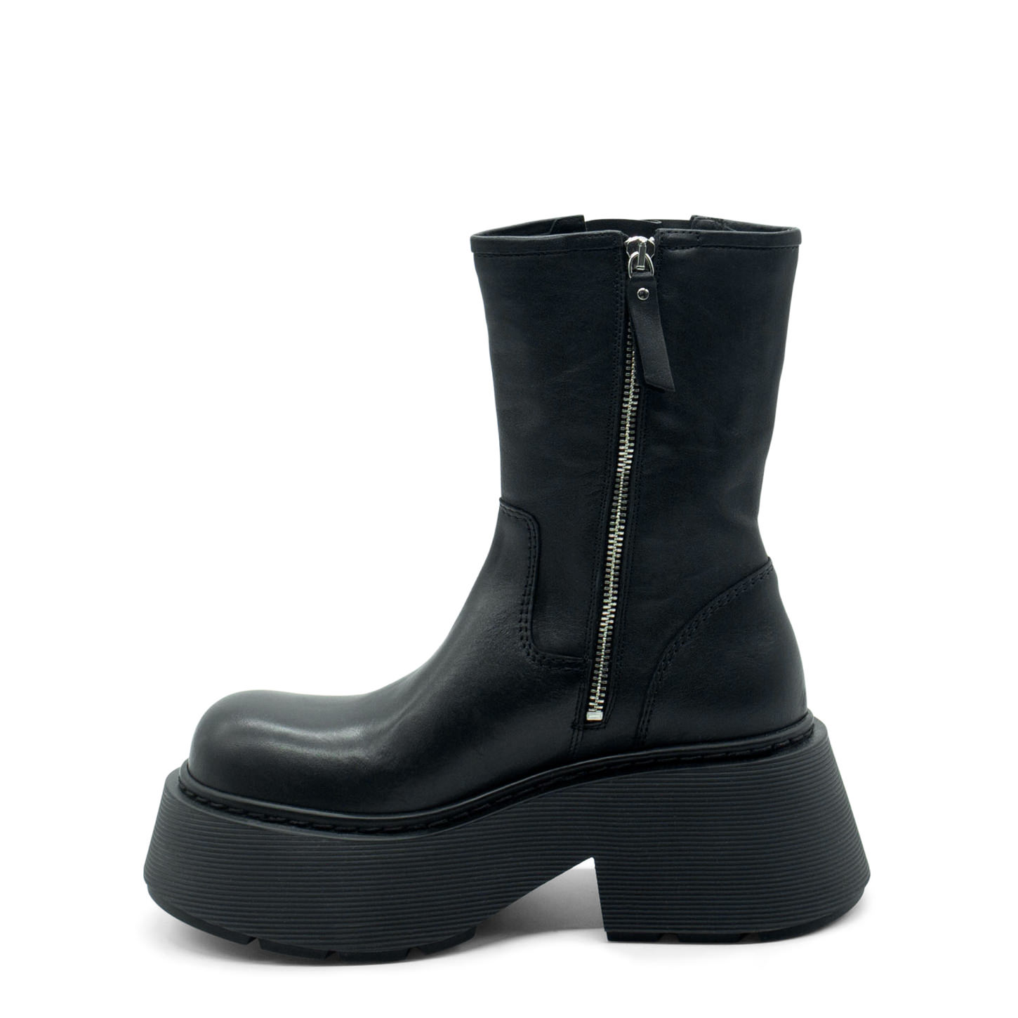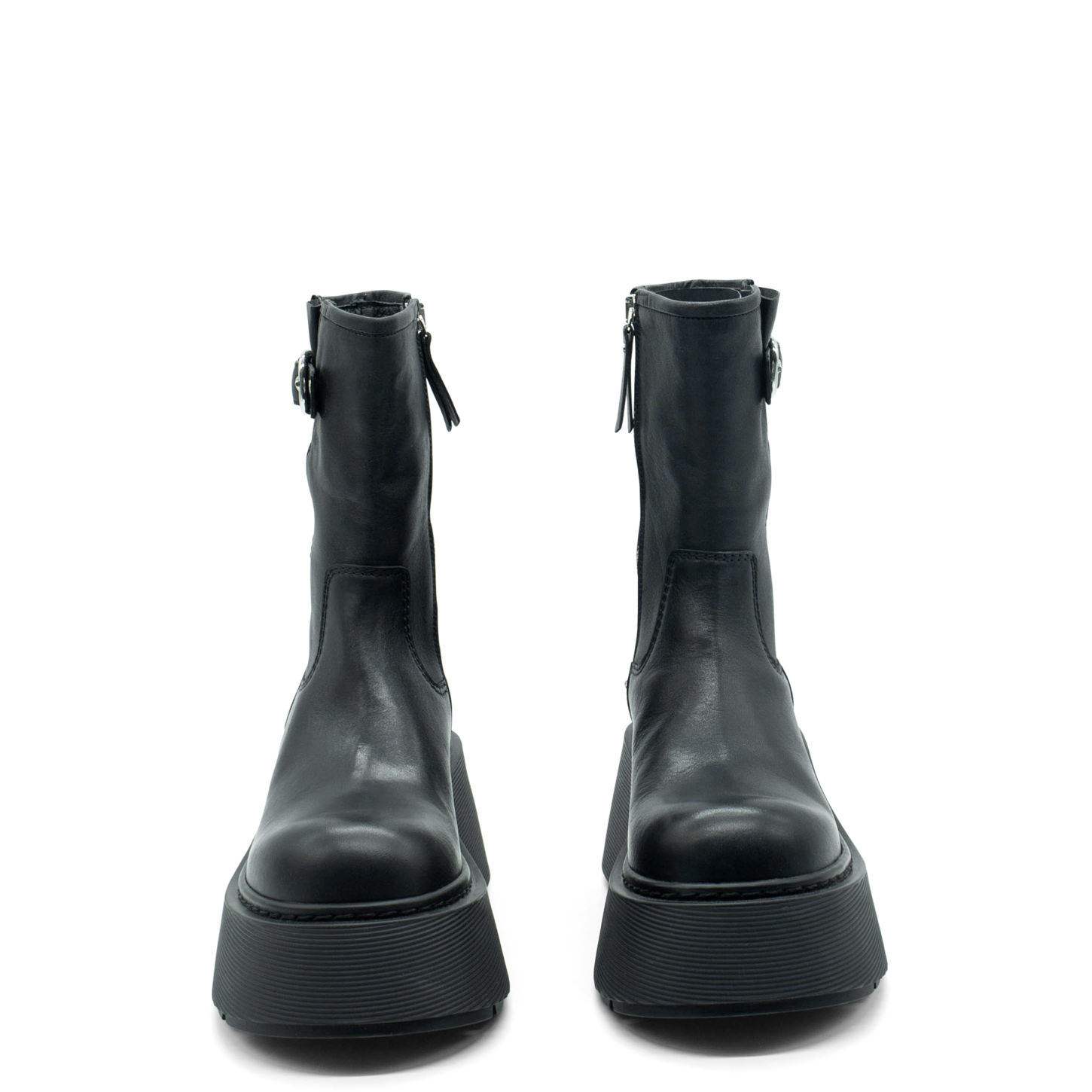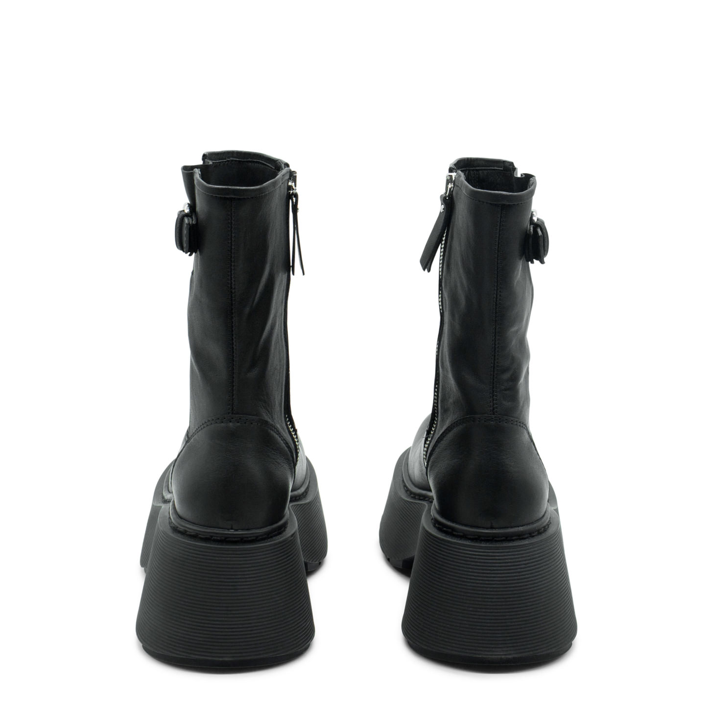 Stripy biker nero in pelle di vitello opaca nappata, fibbia sul cinturino esterno per regolare il soffietto.Il gambale rimane aderente con zip di metallo internala suola è over in gomma con cucitura e texture rigata. Morbido plantare ricoperto pelle. Made in Italy.