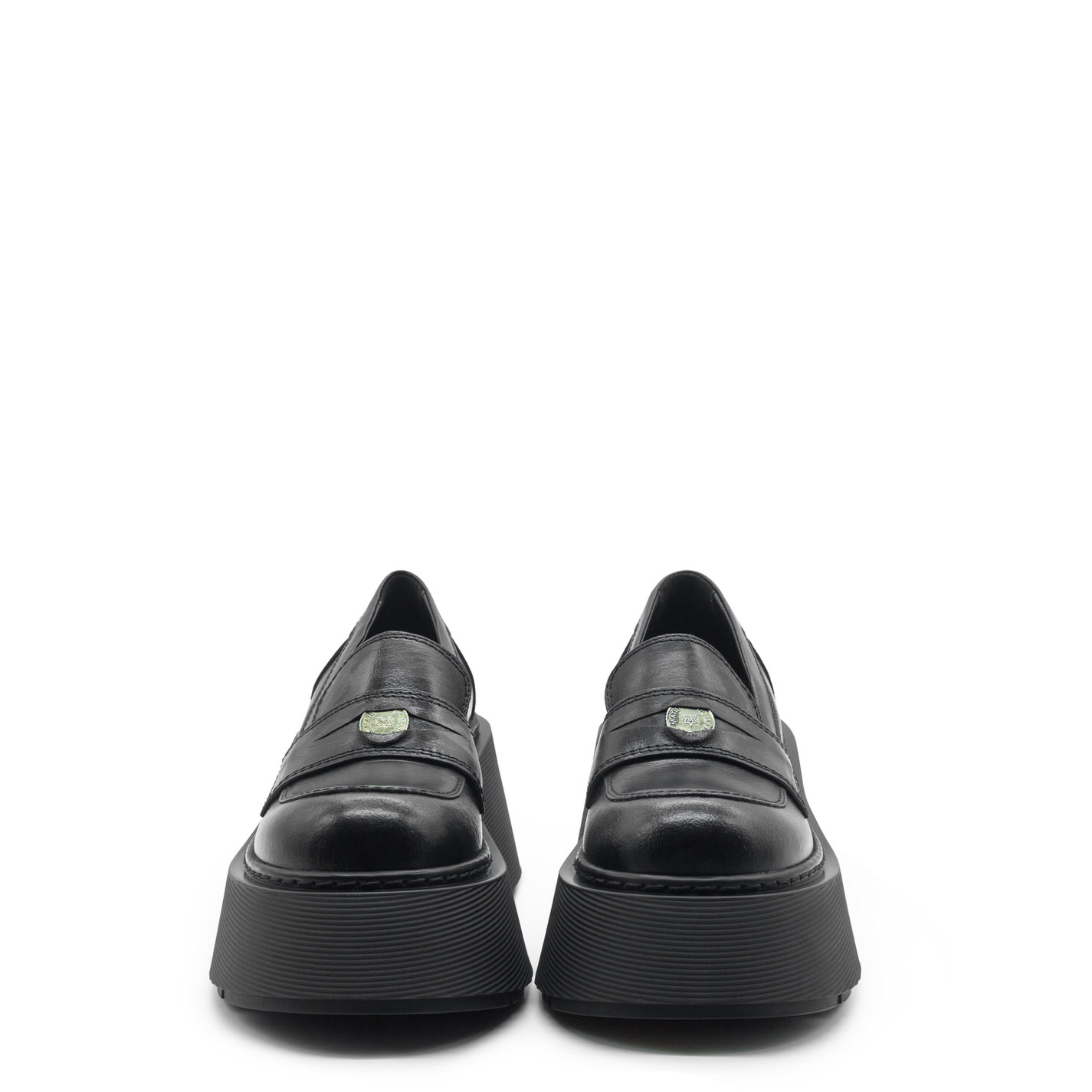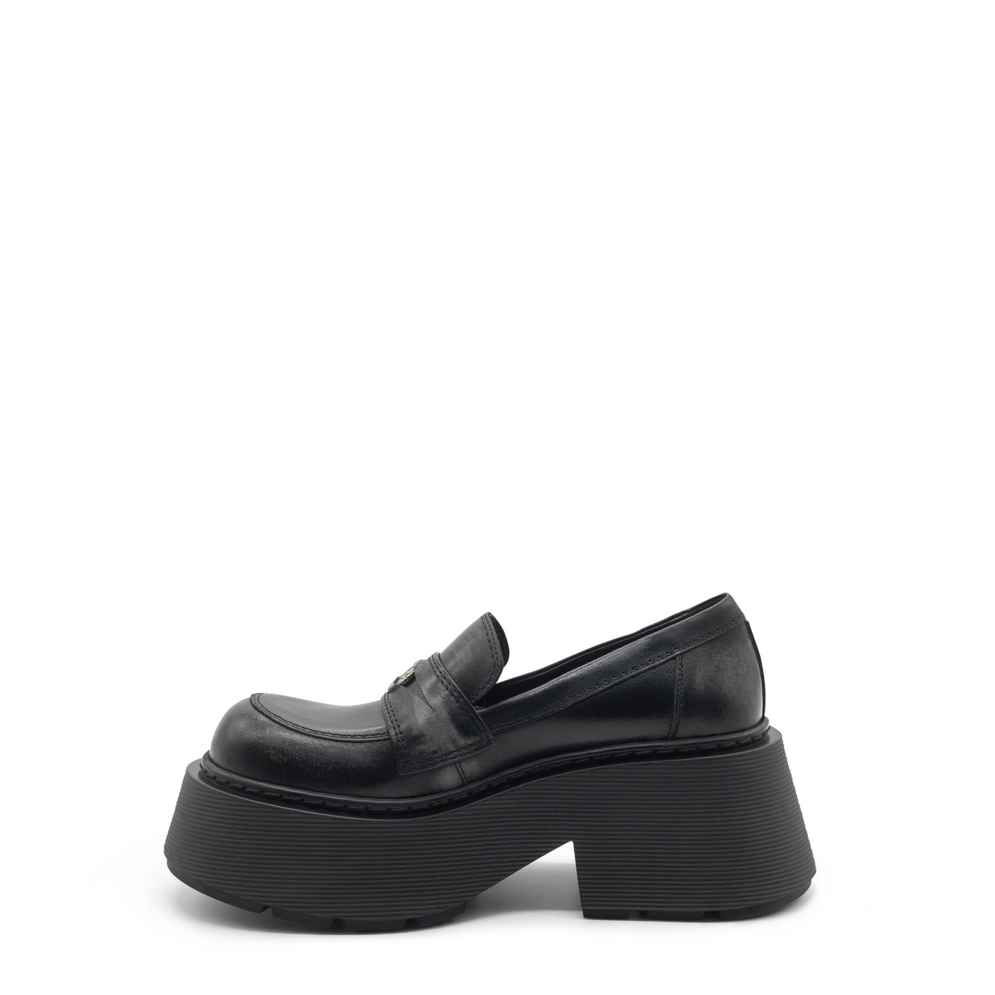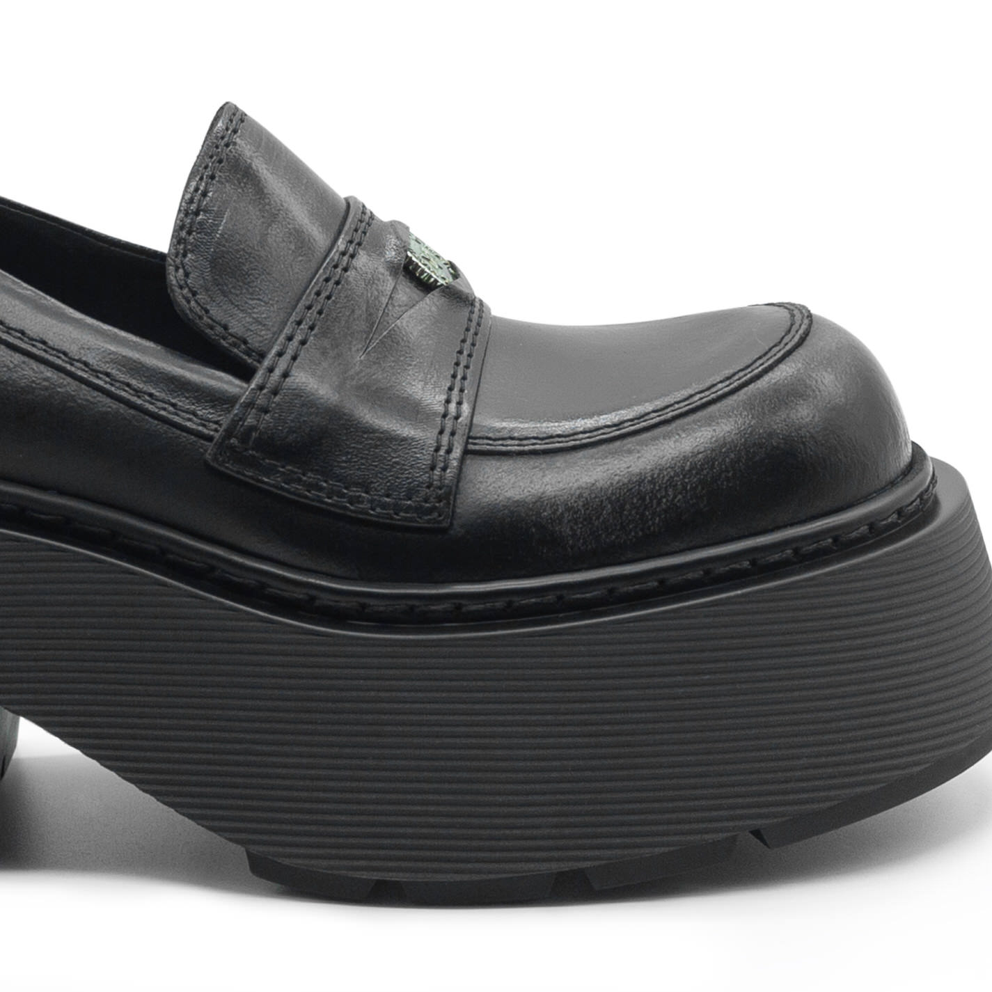 Stripy mocassino penny nero in pelle invecchiata effetto annerito, con moneta logata Vic Matié inserita all'interno della fessura del traversino. La suola è over in gomma con cucitura e texture rigata. Morbido plantare ricoperto pelle. Made in Italy.