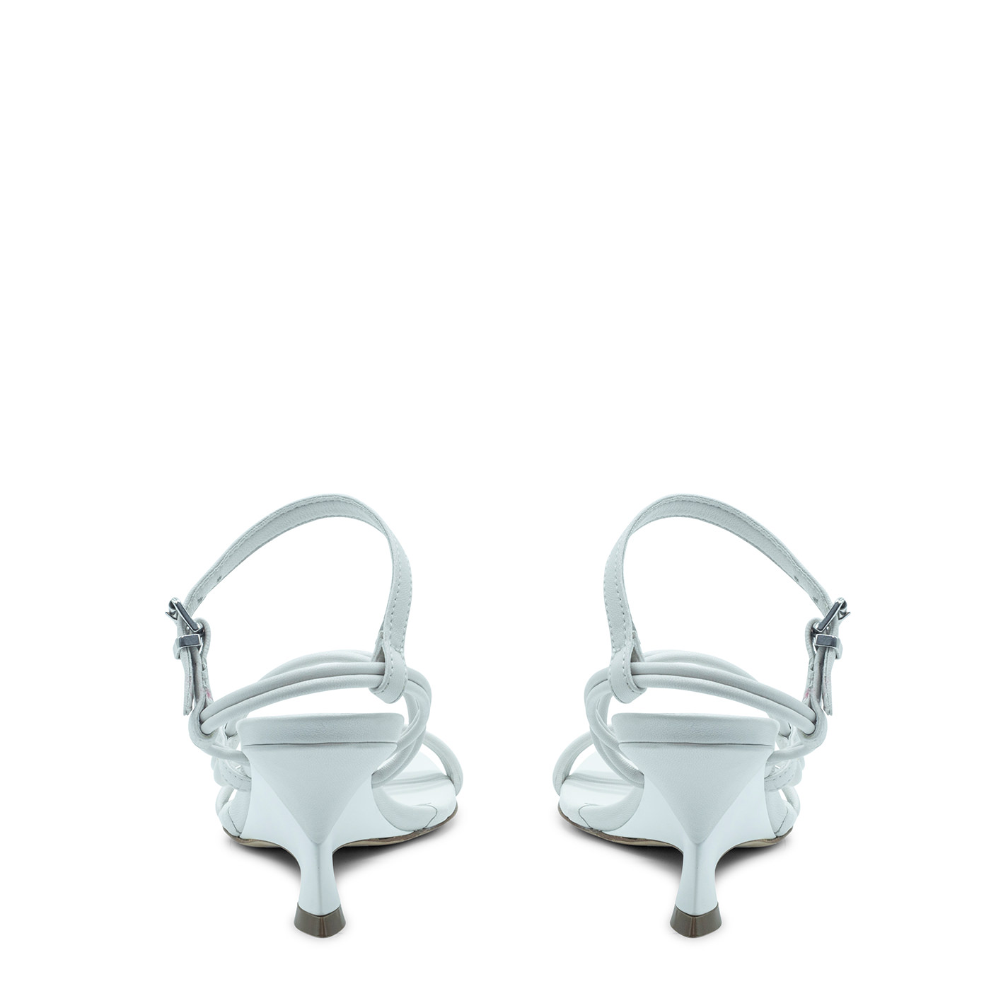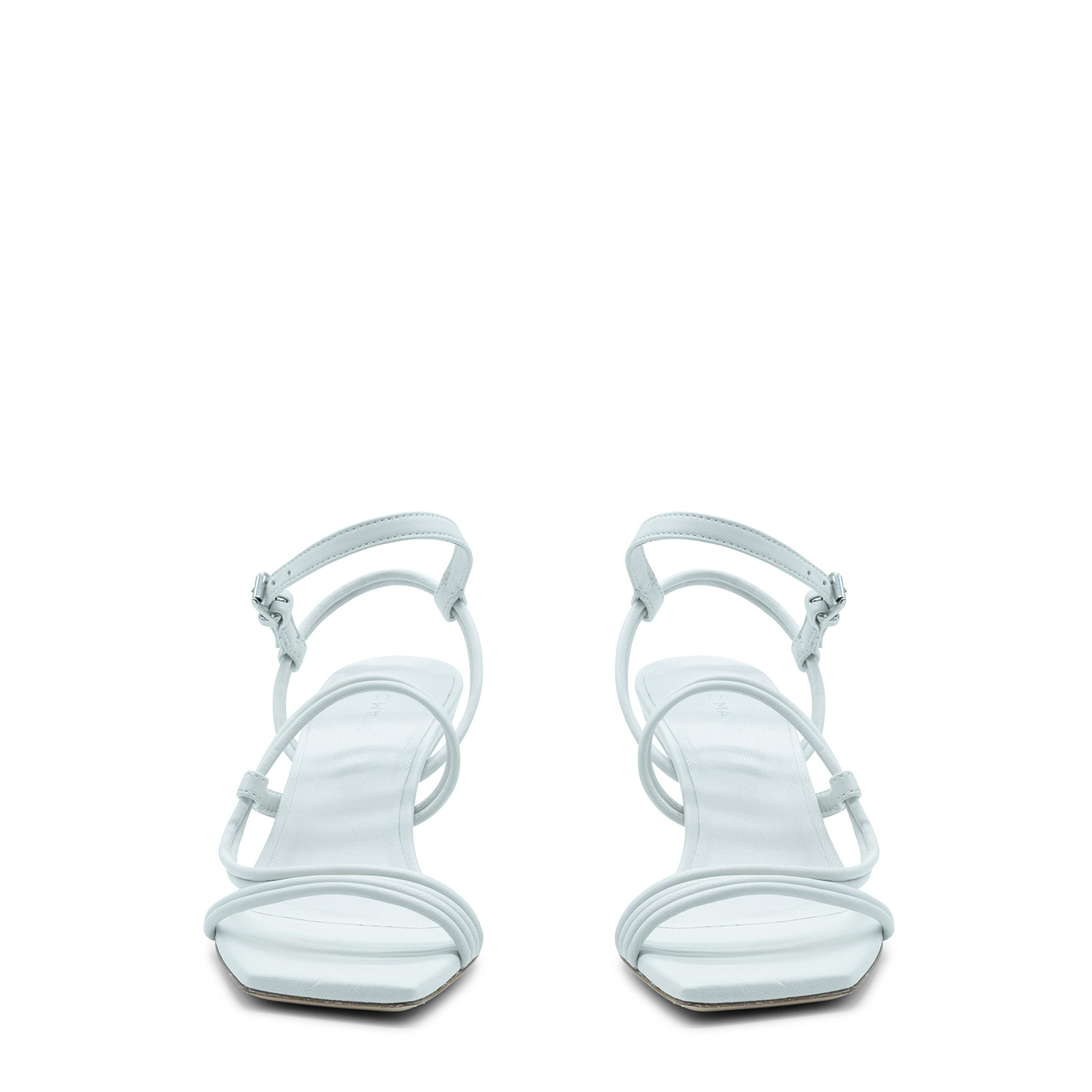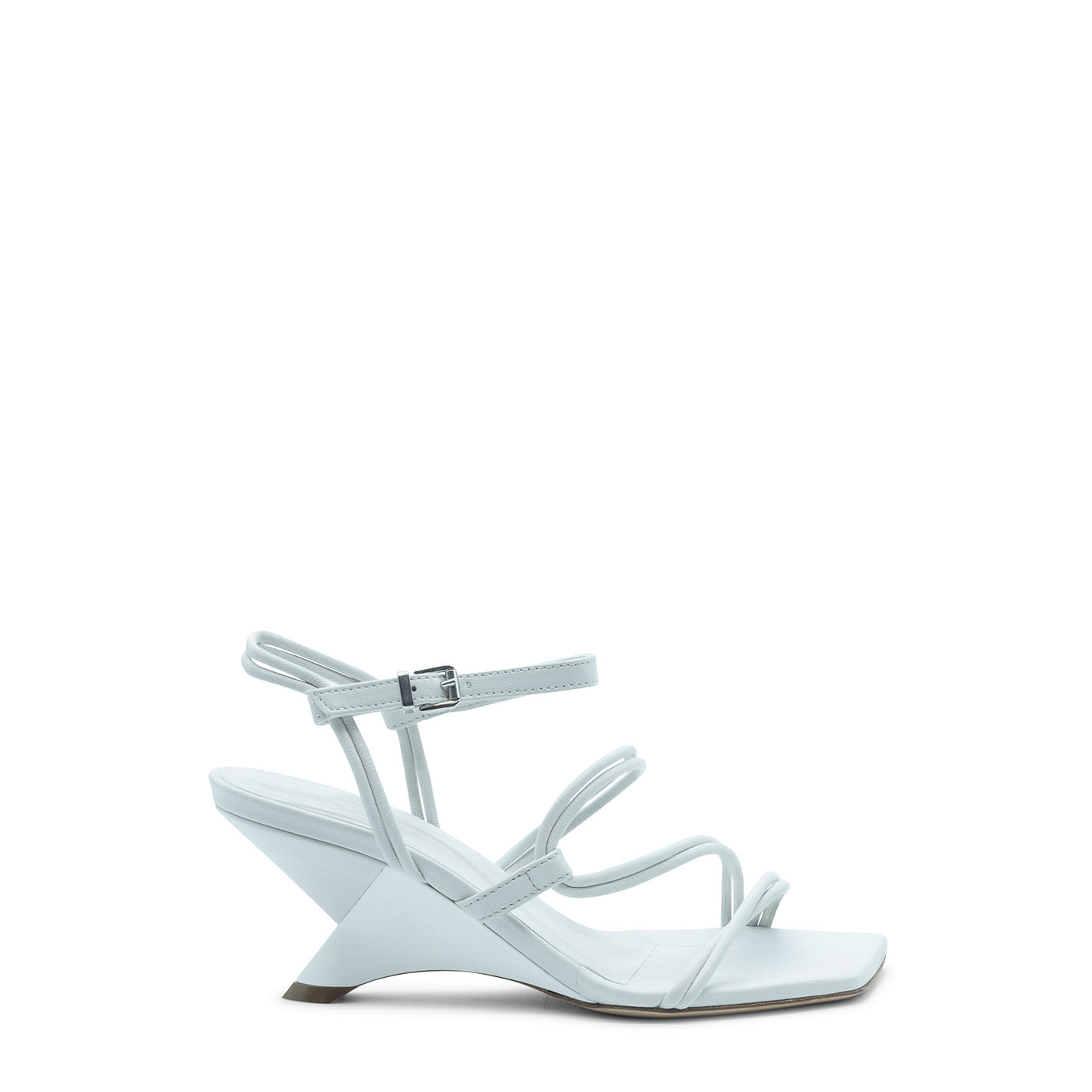 Swam open sandalo asimmetrico biancorealizzato in morbida nappa. Composto da mignon tondo che avvolge il piede dita al tallone, cinturino scorrevole, con fibbia regolabile alla caviglia. Forma minimal dalla dima squadrata, dove si valorizza la particolarità del tacco zeppa verniciato mat tono su tono e ricoperto pelle. Suola in cuoio. Made in Italy.