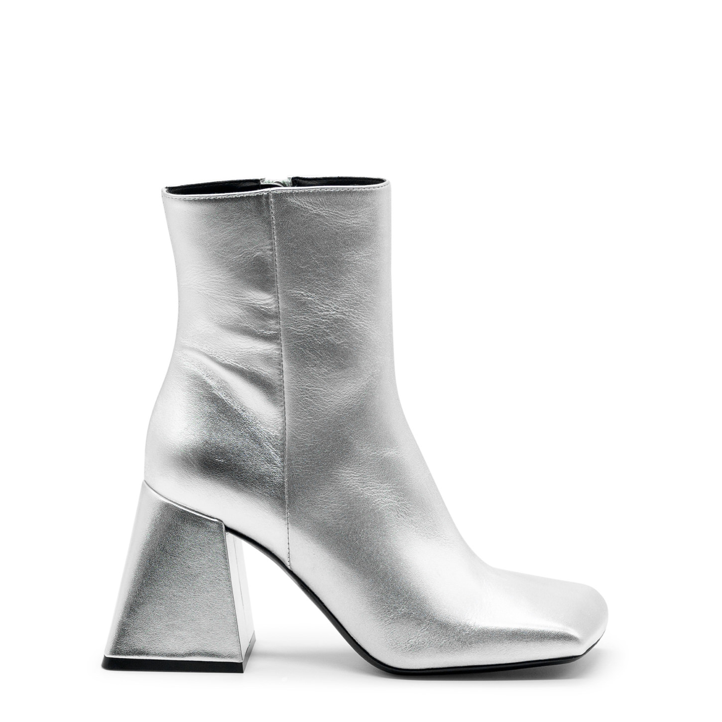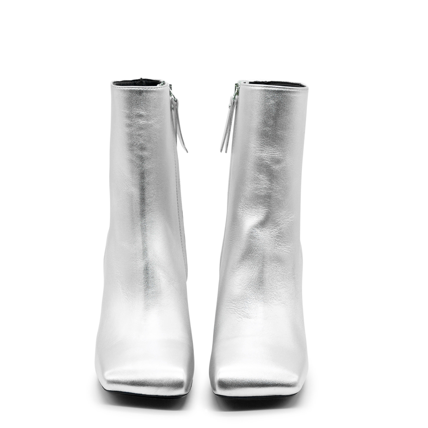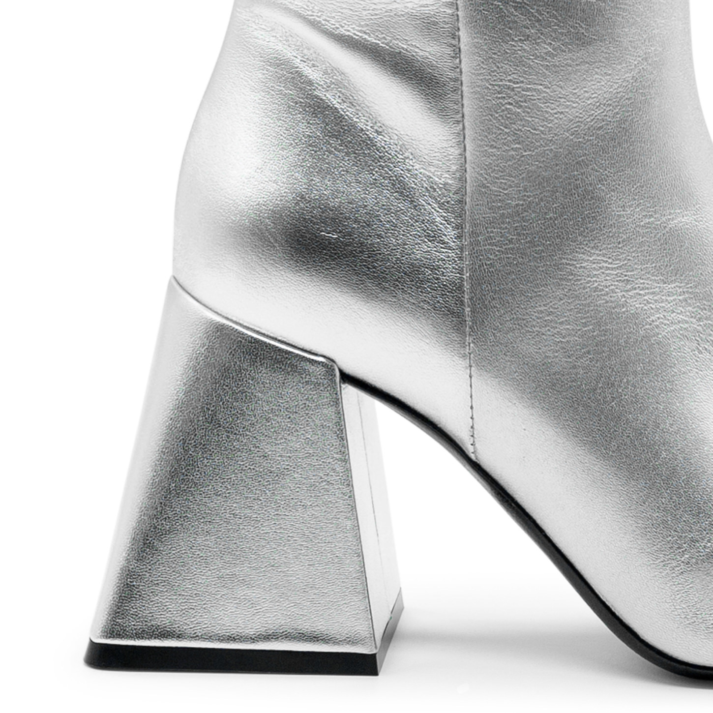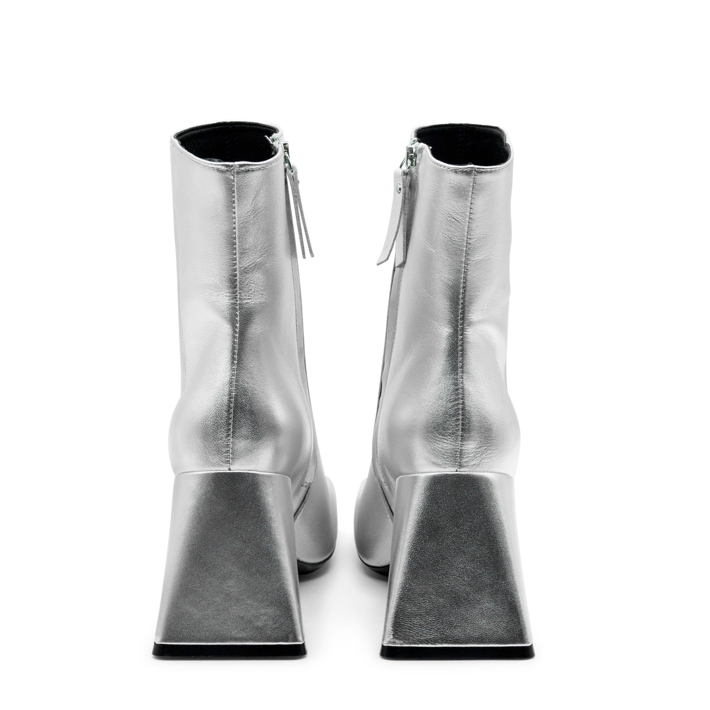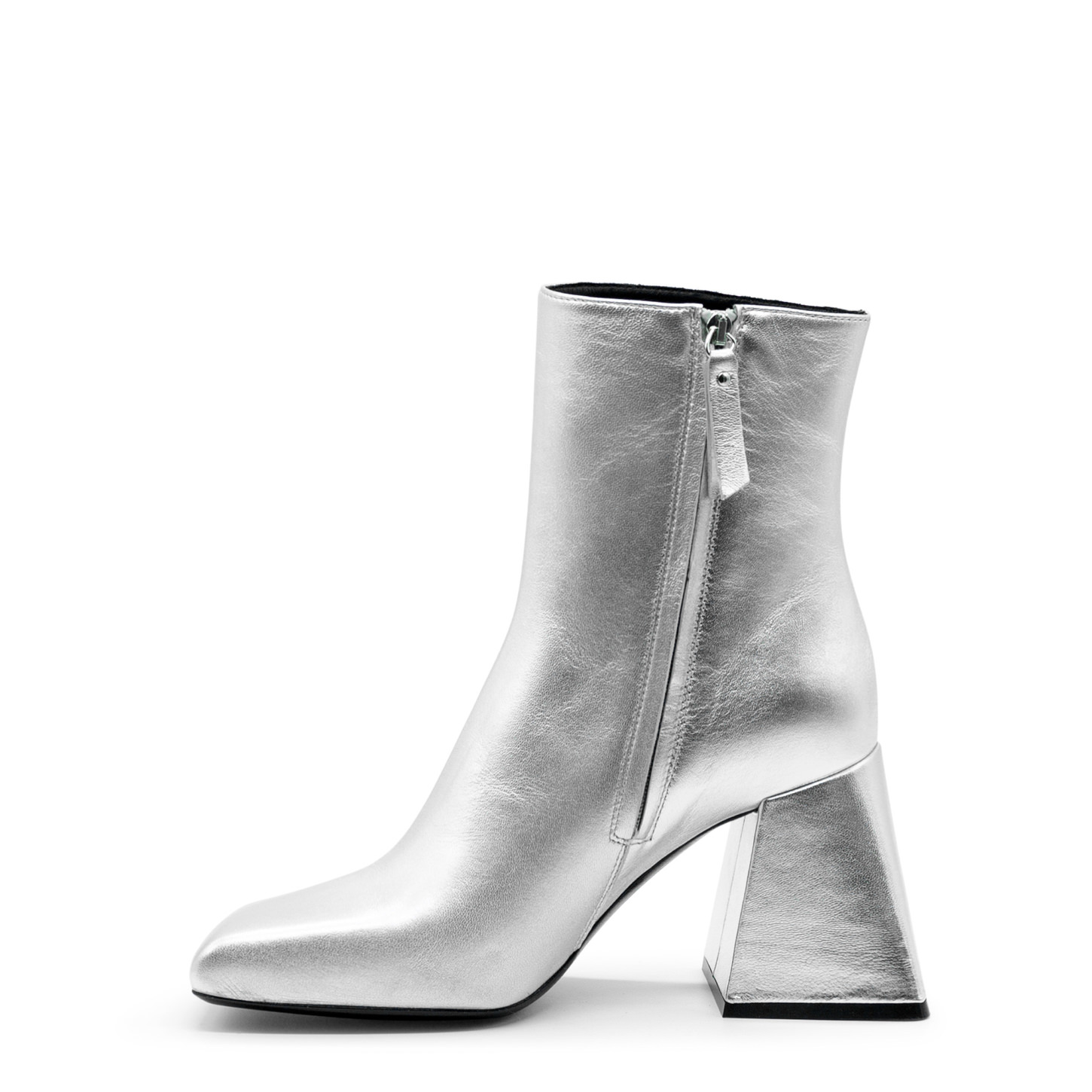 Tronchetto ming minimal argento realizzato in morbida nappa laminata, con zip interna per facilitare la calzata.Suola in cuoio, tacco squadrato a campana fasciato pelle, punta assimmetrica.Made in Italy.