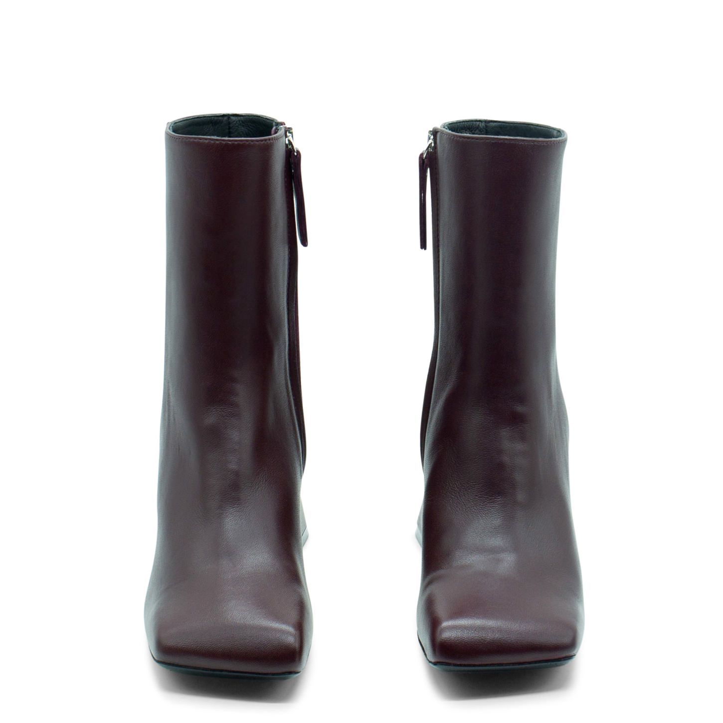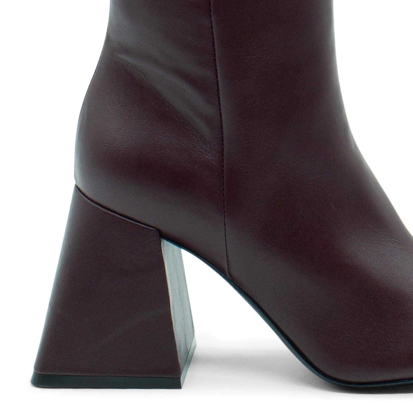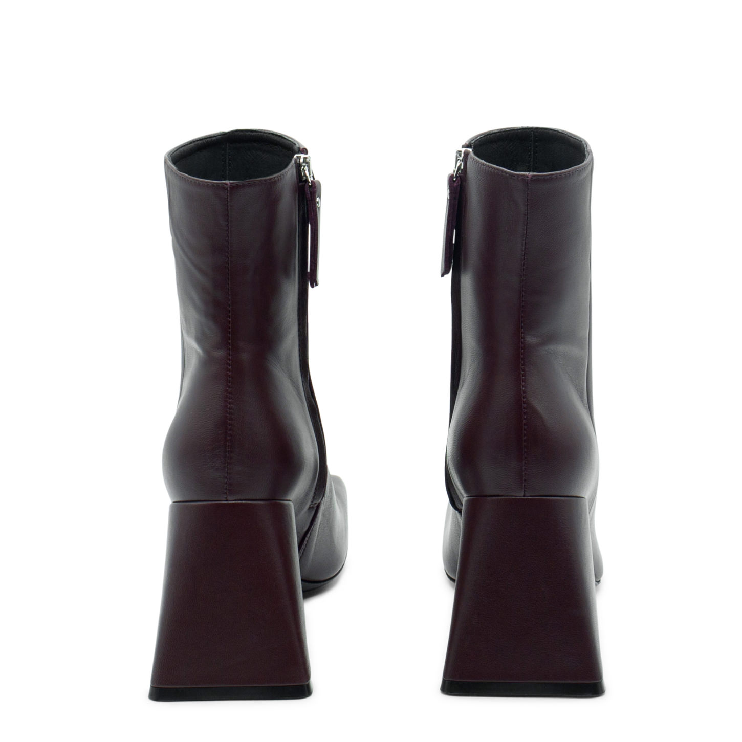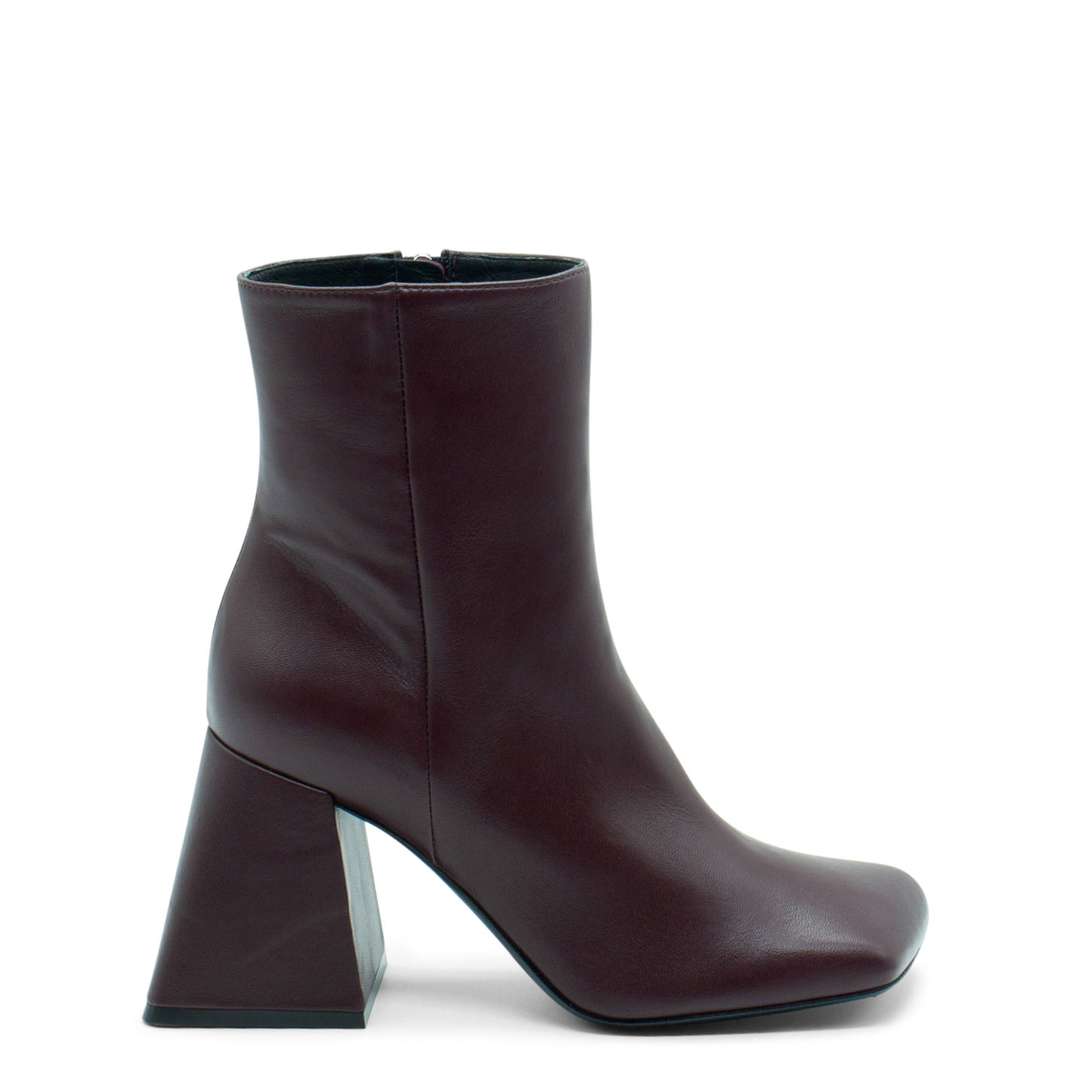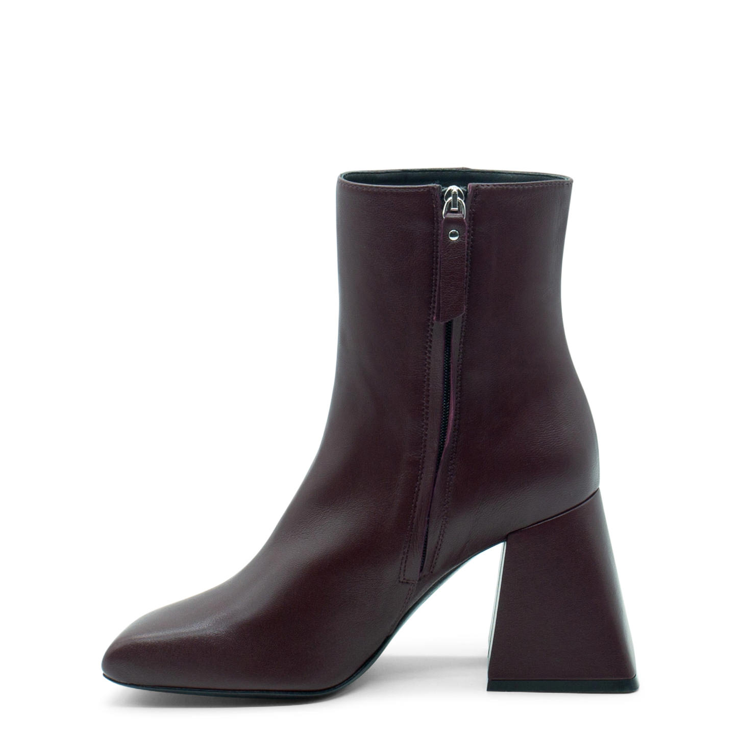 Tronchetto ming minimal bordeaux realizzato in morbida nappa lucida, con zip interna per facilitare la calzata.Suola in cuoio, tacco squadrato a campana fasciato pelle, punta assimmetrica.Made in Italy.