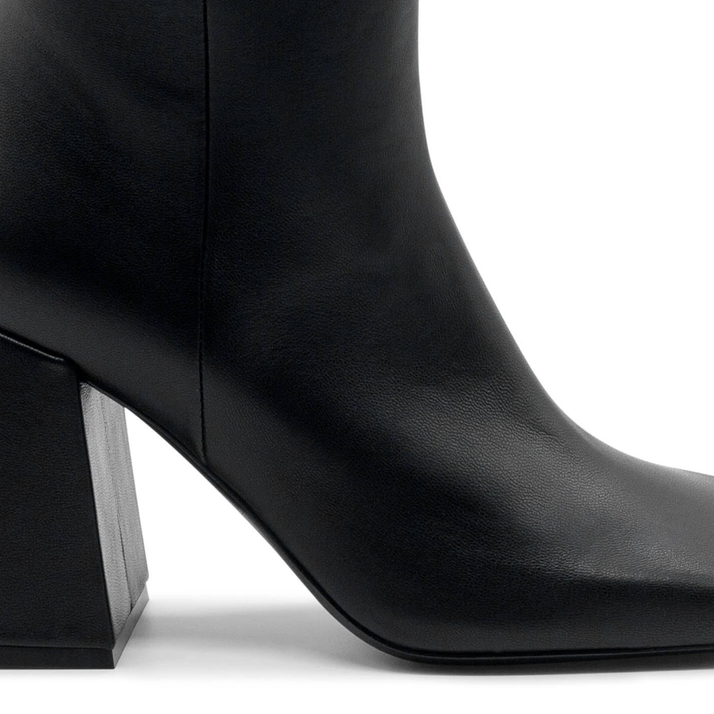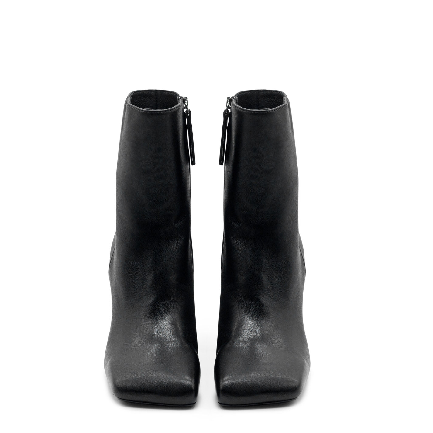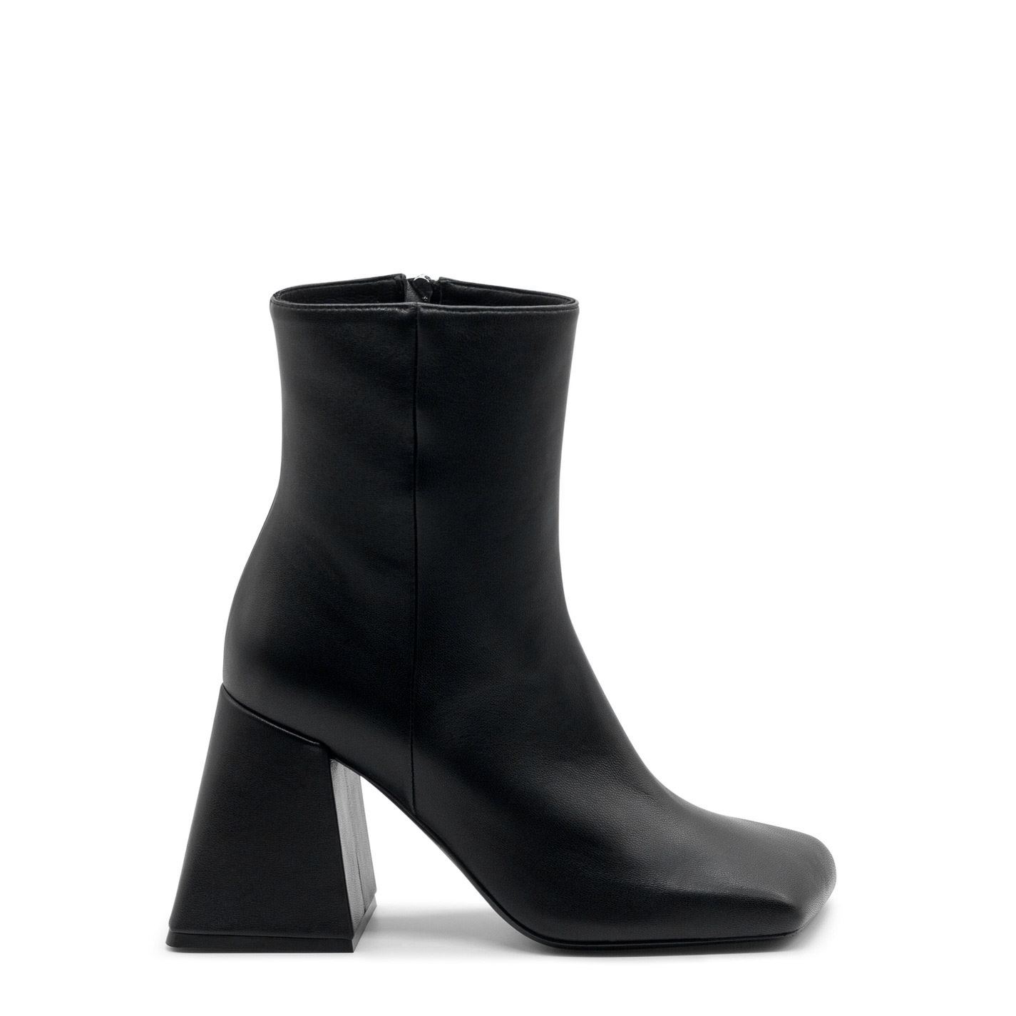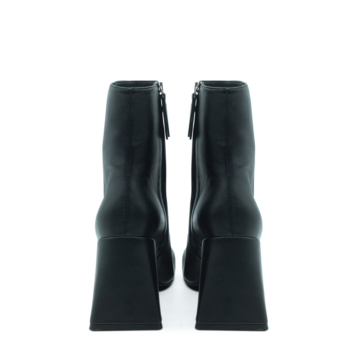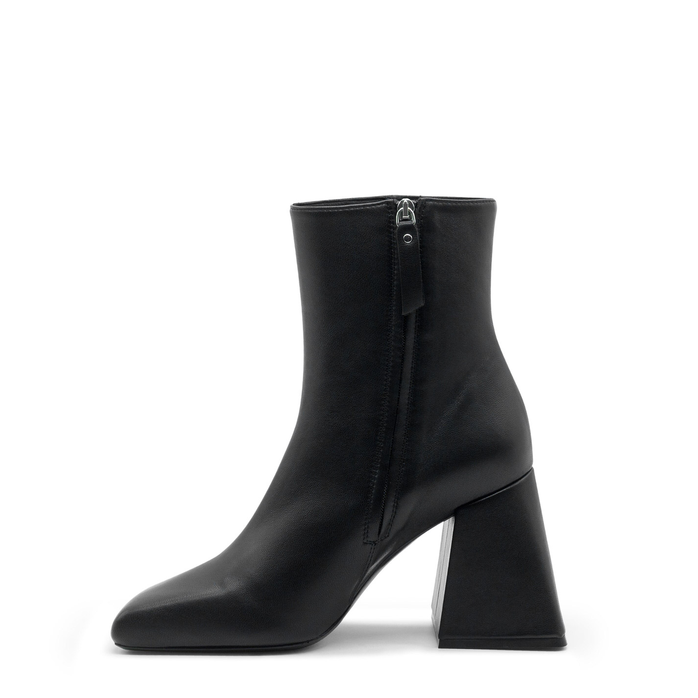 Tronchetto ming minimal nero realizzato in morbida nappa lucida, con zip interna per facilitare la calzata.Suola in cuoio, tacco squadrato a campana fasciato pelle, punta assimmetrica.Made in Italy.