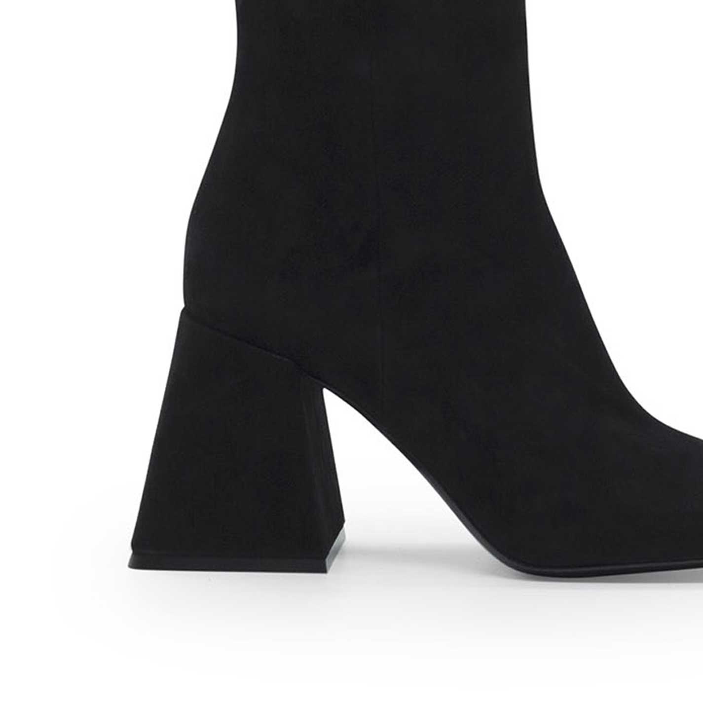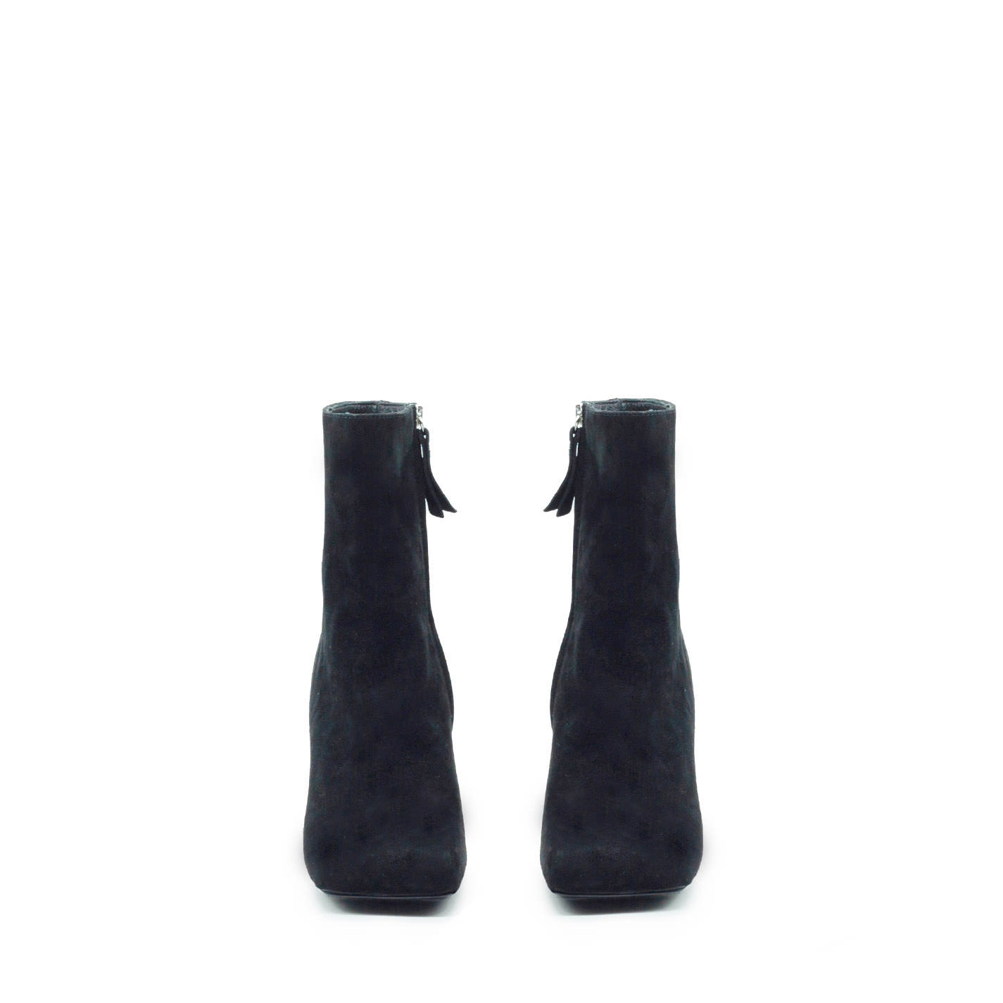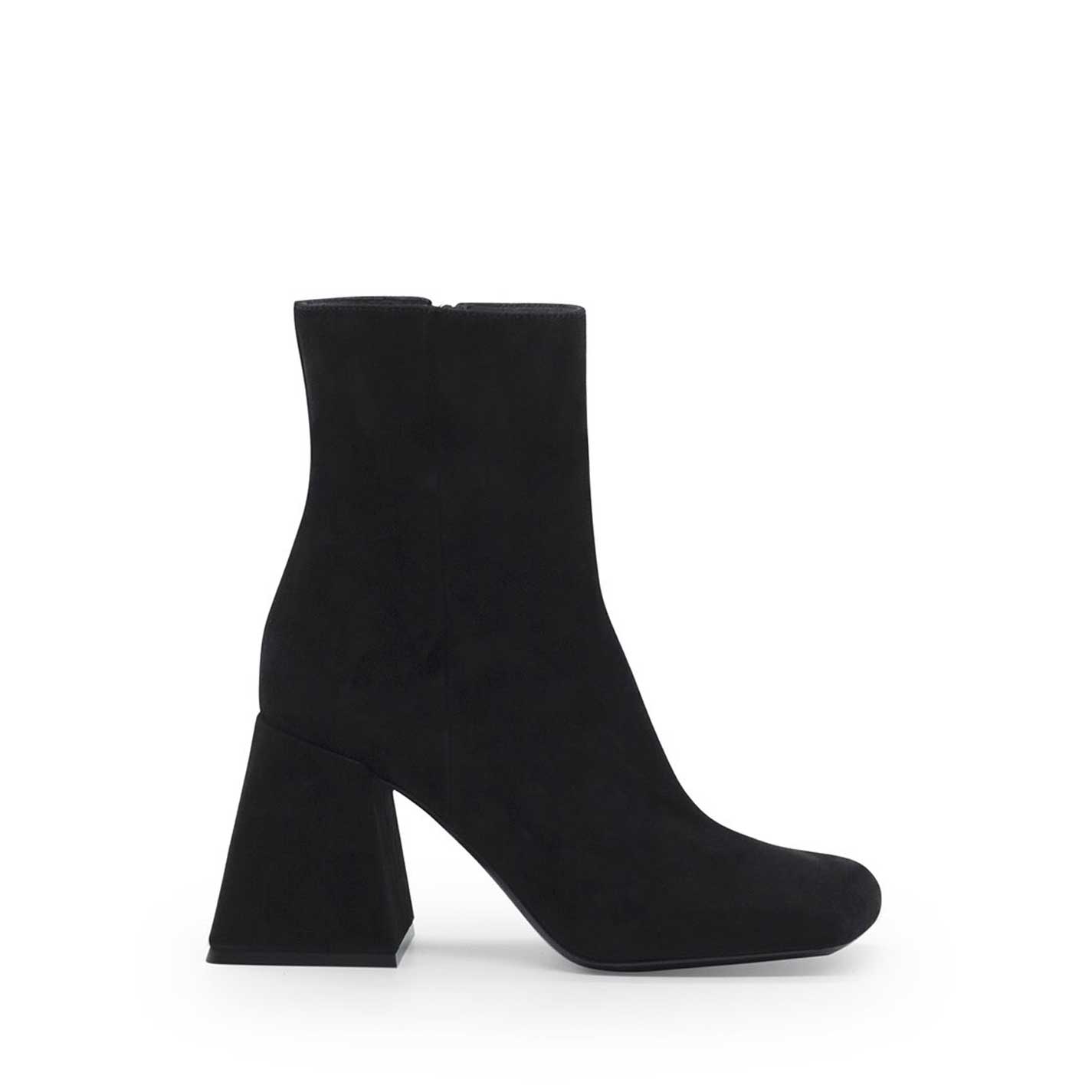 Tronchetto ming minimal nero in pelle scamosciata ,con zip interna per facilitare la calzata.Suola in cuoio, tacco squadrato a campana fasciato pelle, punta assimmetrica.Made in Italy.
