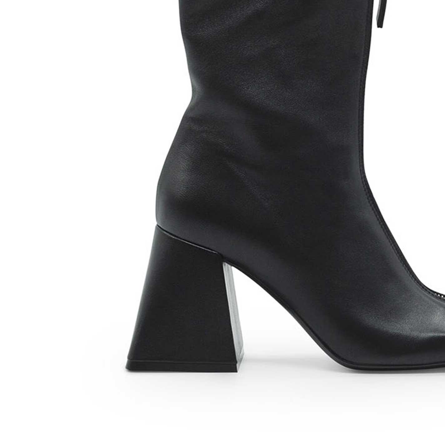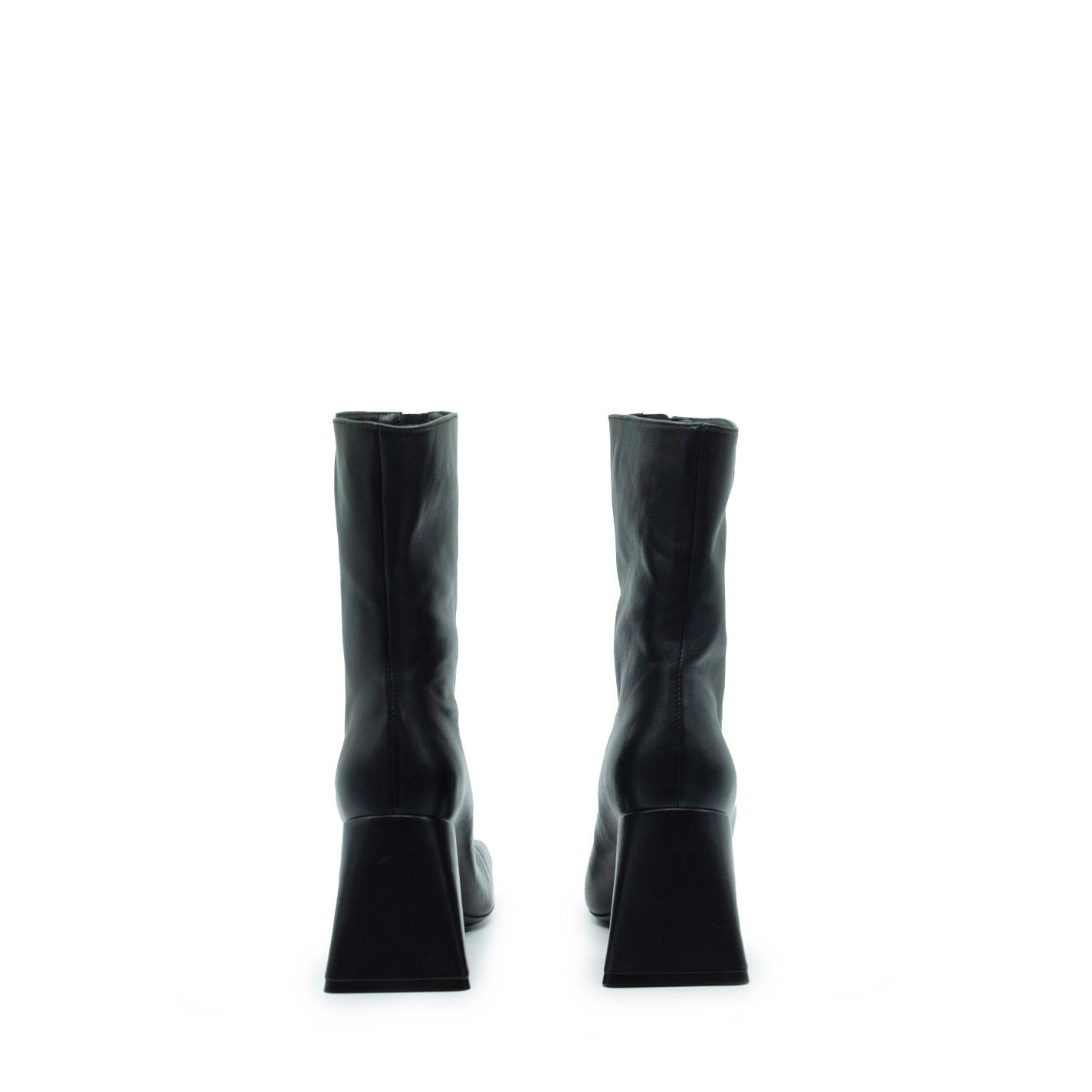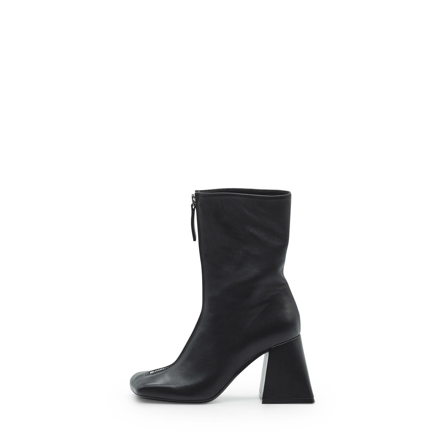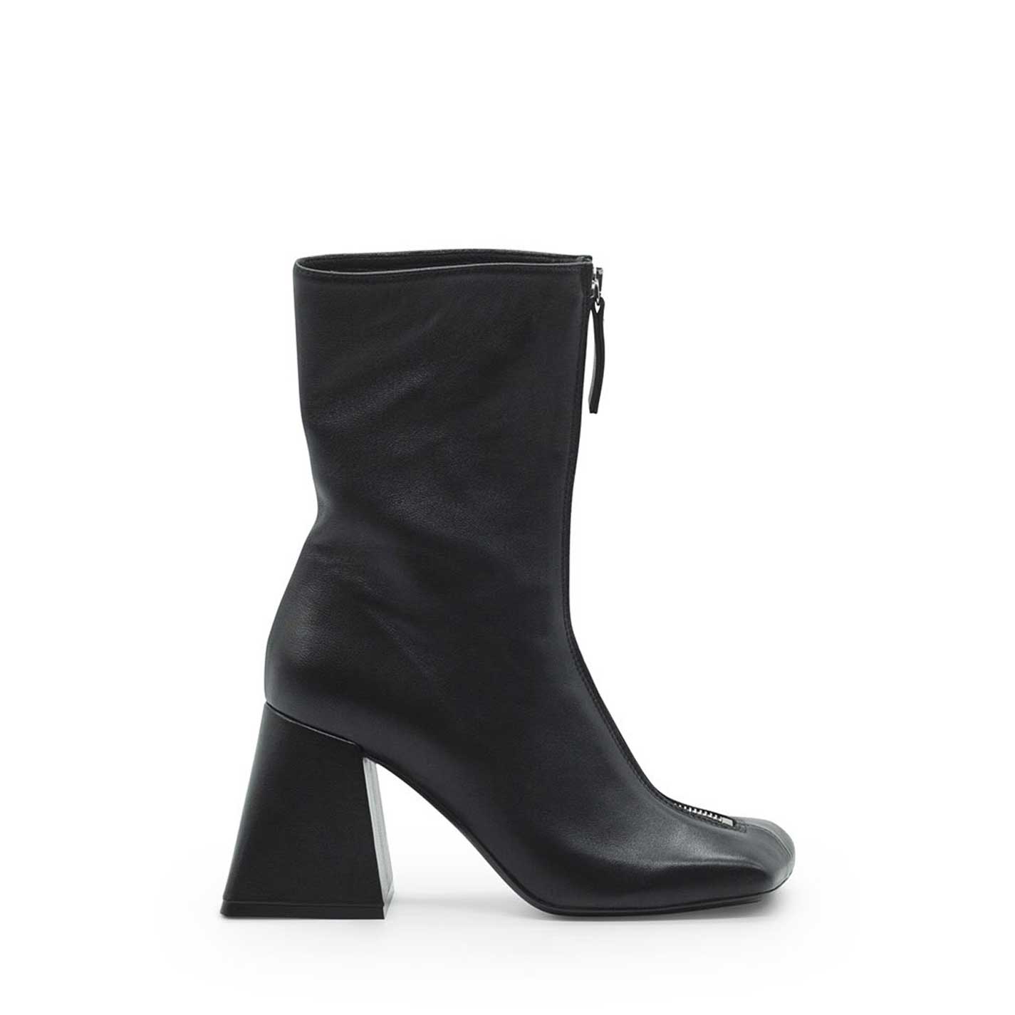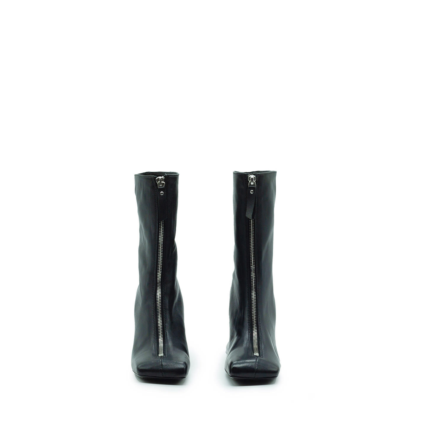 Tronchetto ming nero realizzato in morbida nappa lucida, con zip di metallo sul davanti. Suola in cuoio, tacco squadrato a campana fasciato pelle, punta assimmetrica.Made in Italy.