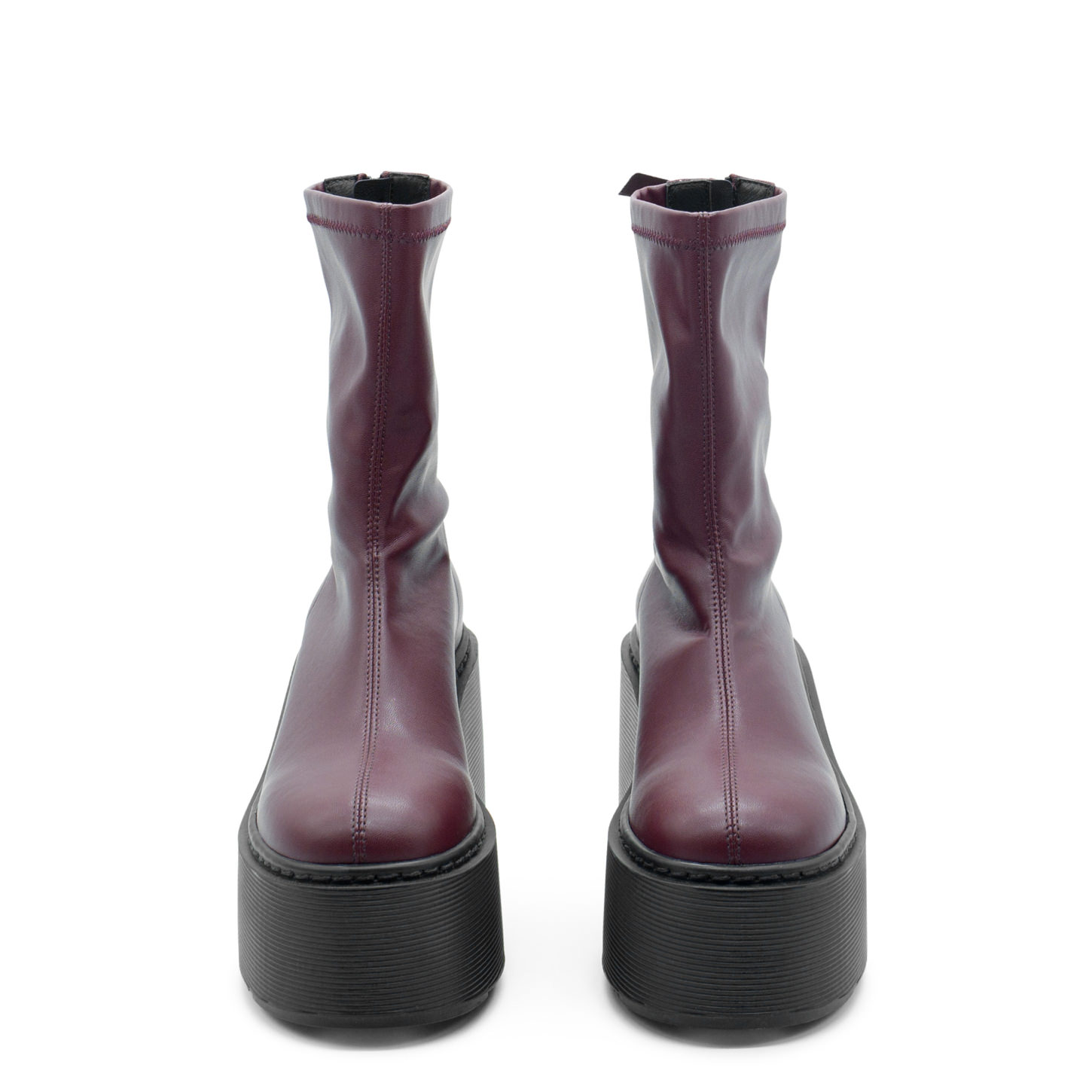 Tronchetto zeppa Stripy bordeaux in ecopelle stretch, con zip logata dietro. Zeppa in gomma effetto rigato, con battistrada a tacche antiscivolo. Made in Italy.
