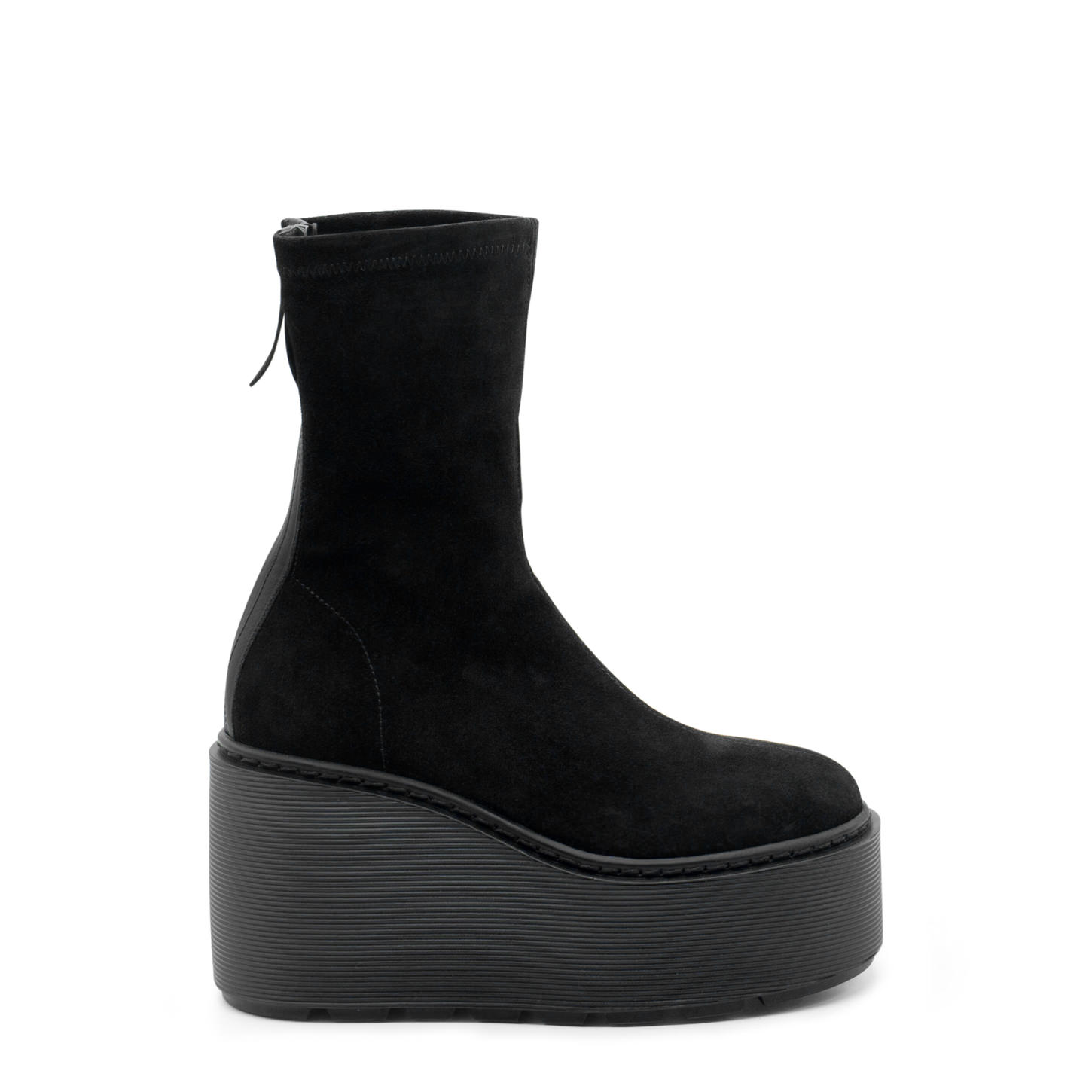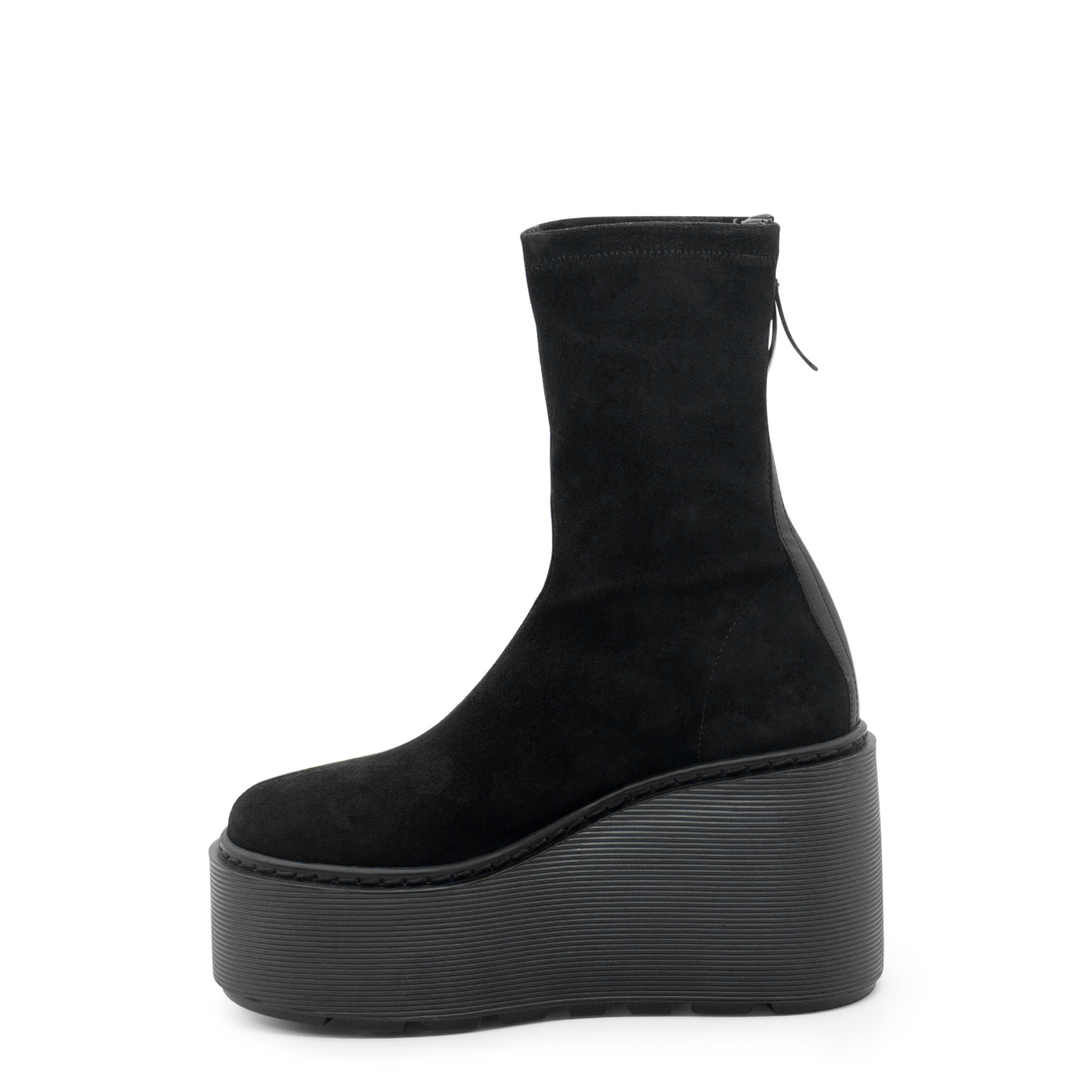 Tronchetto zeppa Stripy in crosta elasticizzata nera ,con zip posteriore tono su tono perlata. Zeppa in gomma effetto rigato, con battistrada a tacche antiscivolo. Made in Italy.