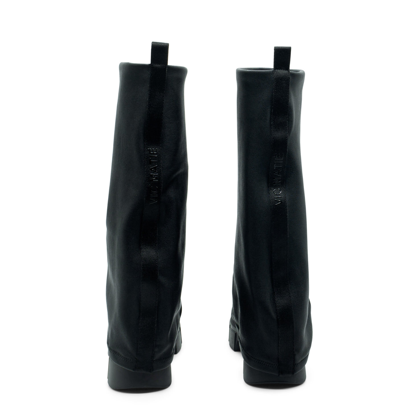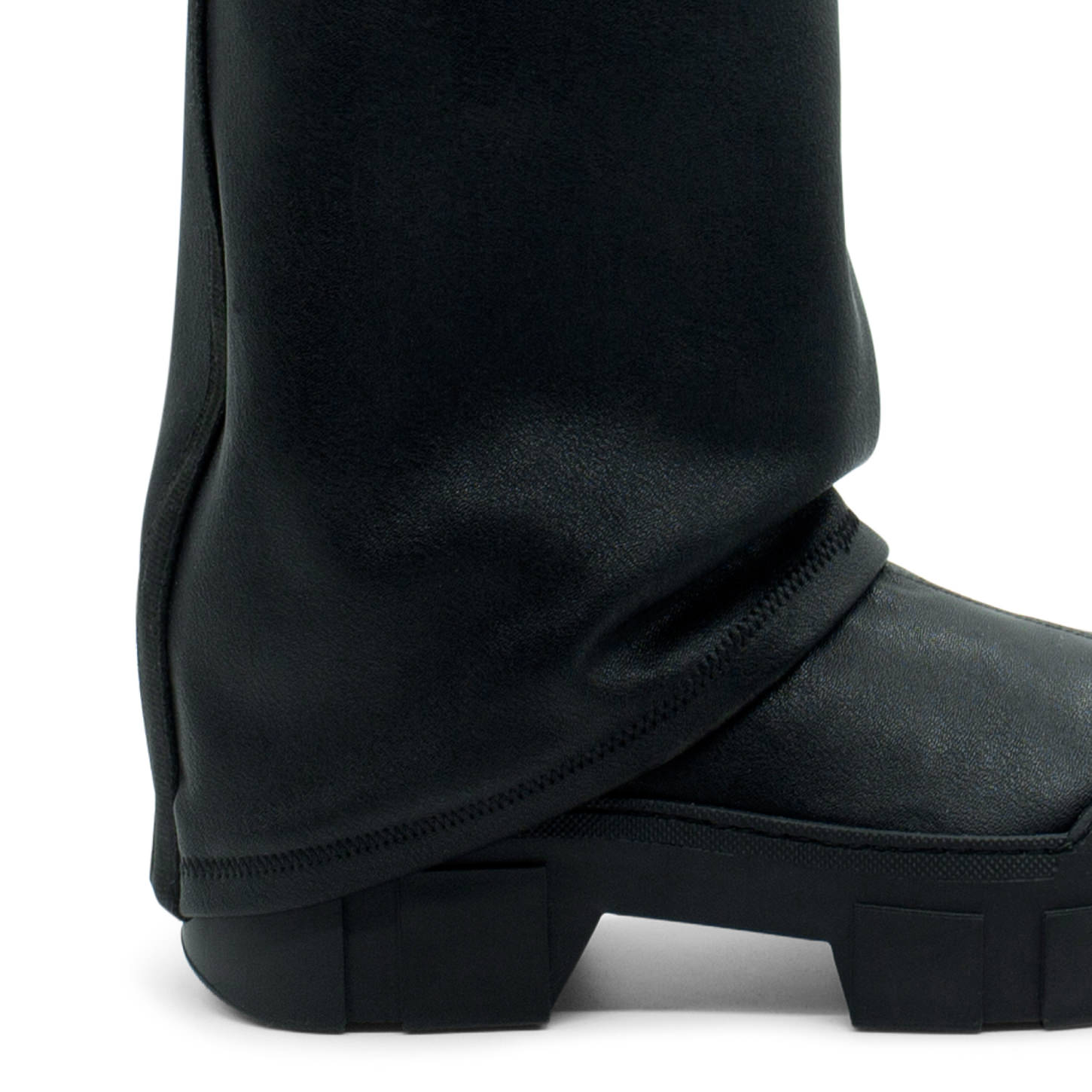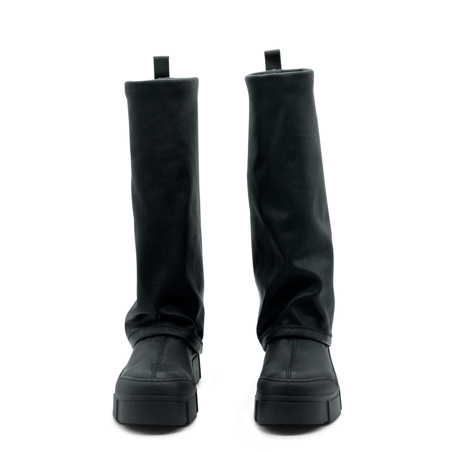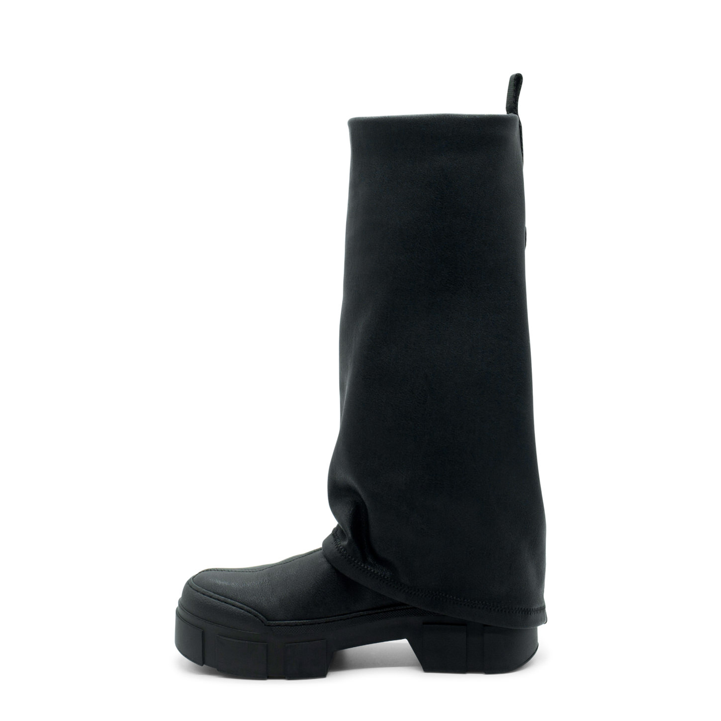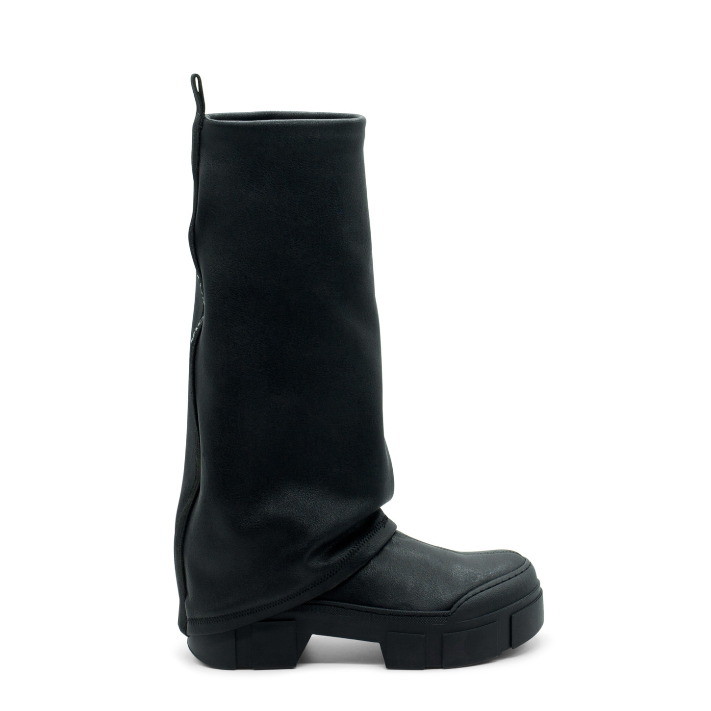 Tubo roccia nero in ecopelle stretch, con maxi risvolto che ricopre il tacco, nastro logato nel retro. Suola guscio in TPU con tacche a rilievo e plantare TAG morbido ricoperto in pelle di vitello. Made in Italy.