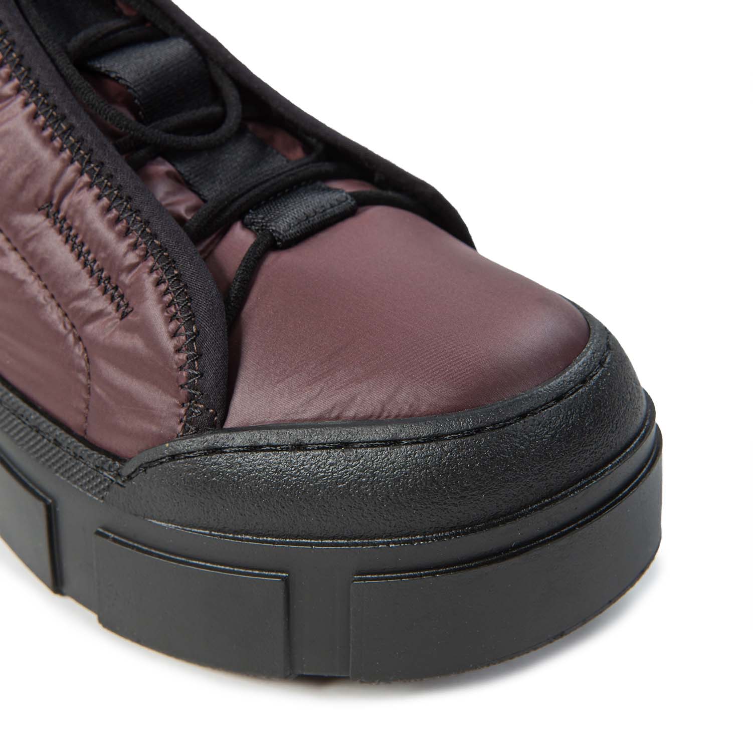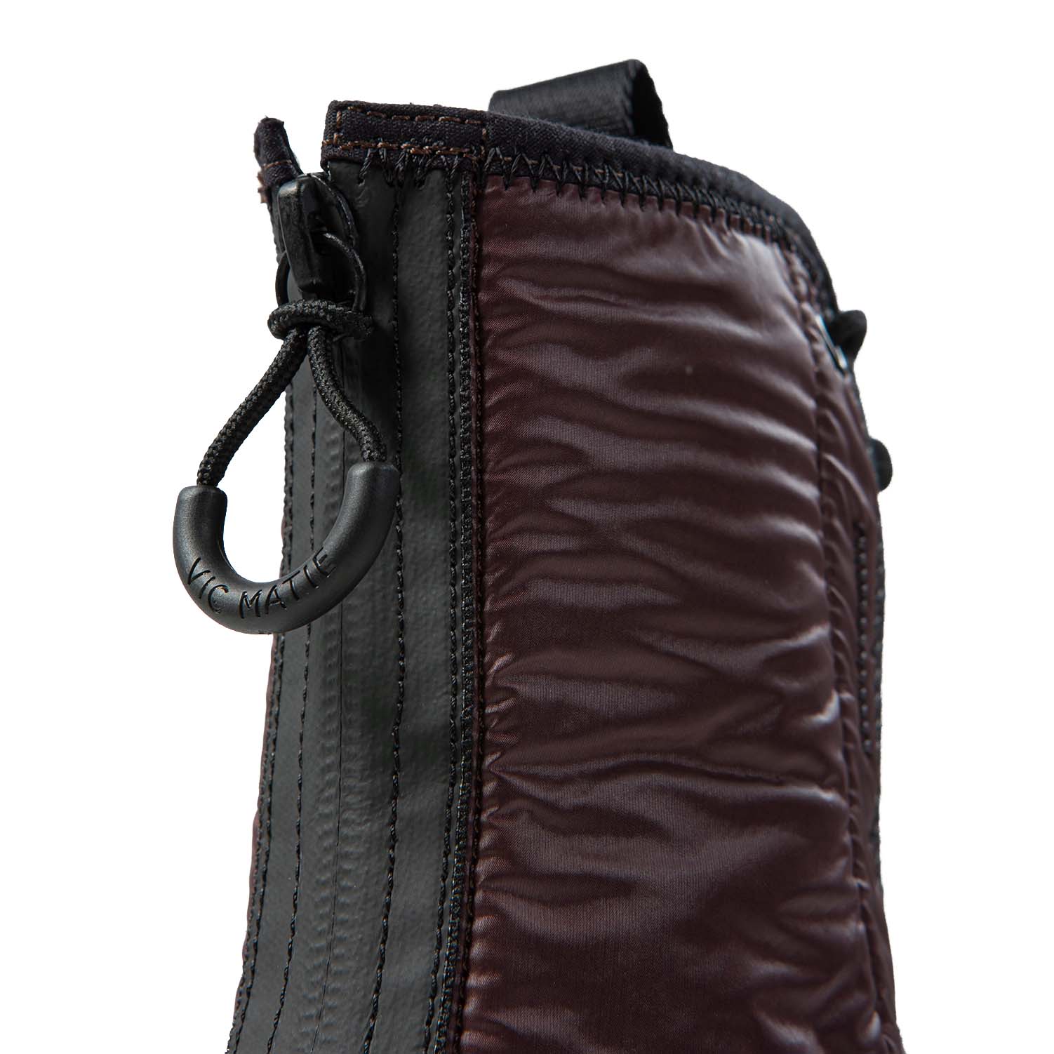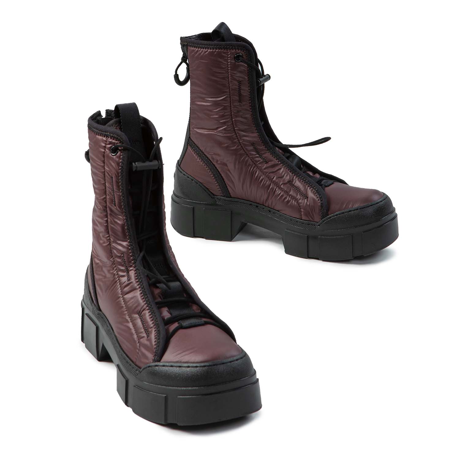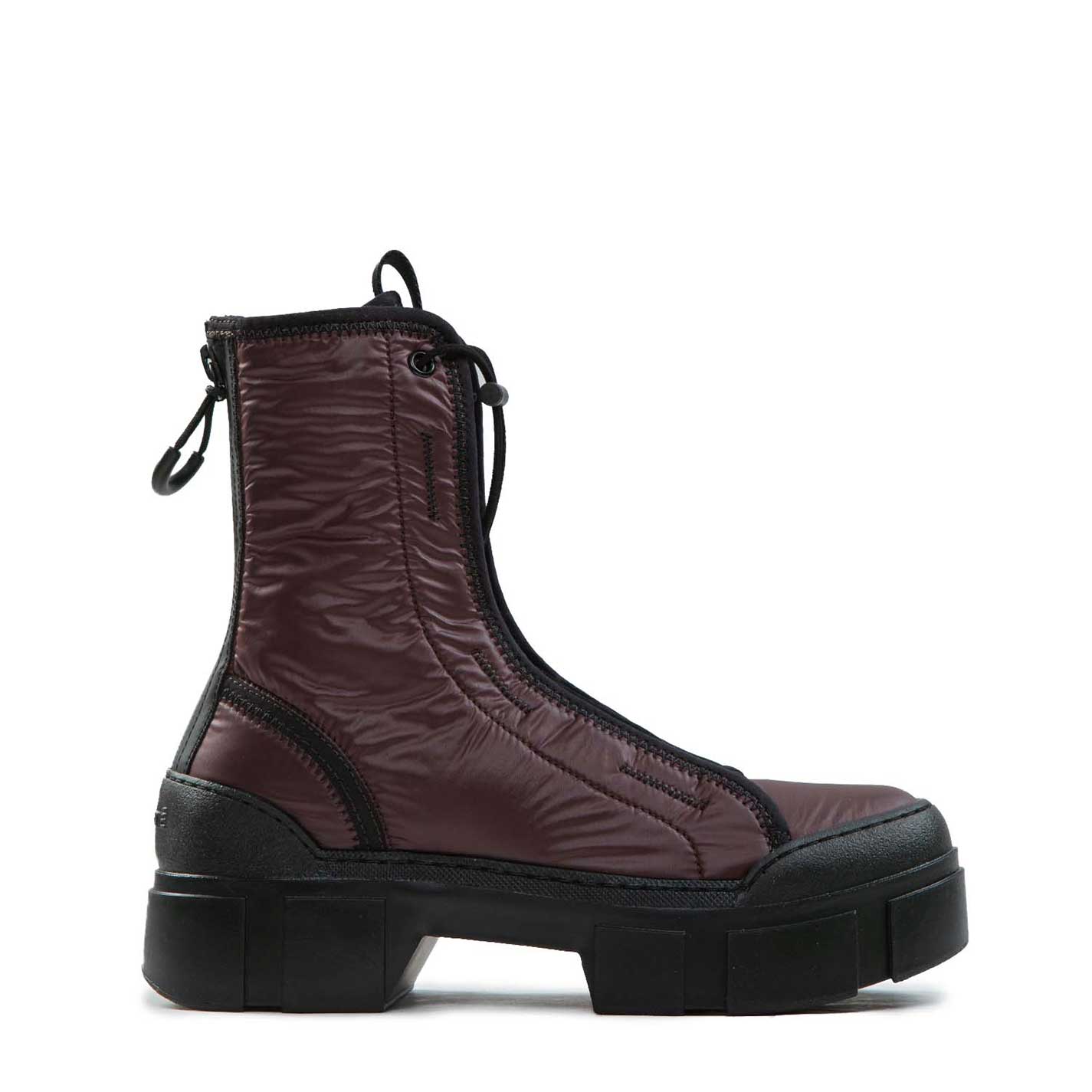 V14 Roccia-Anfibio testa di moro realizzato in nylon lucido imbottito, bordature e dettagli zig zag neri, stringa elastica regolabile con tira coulisse;