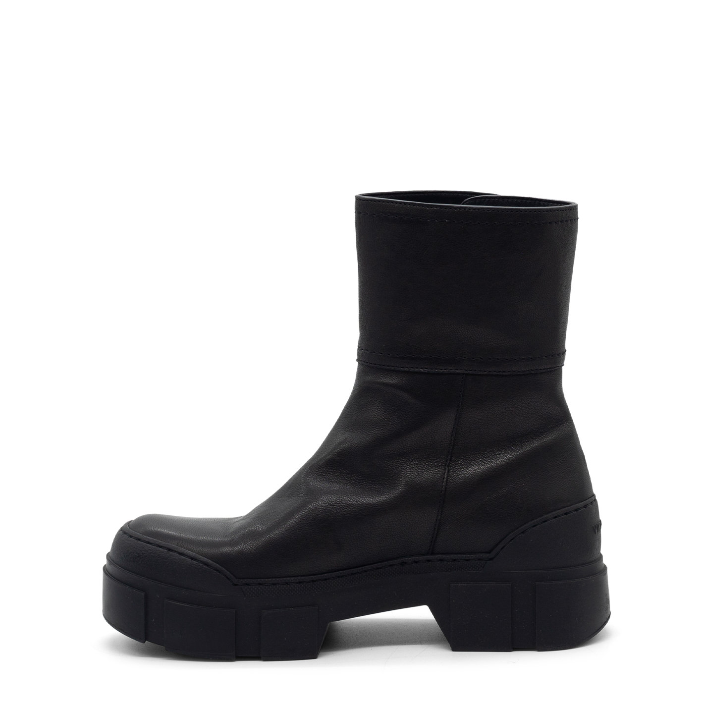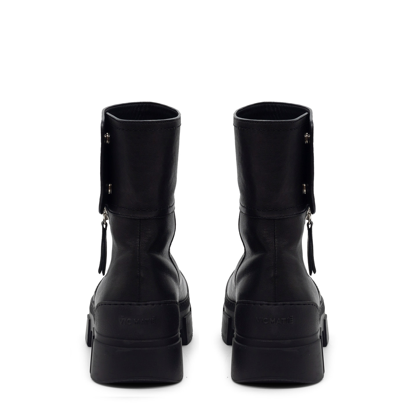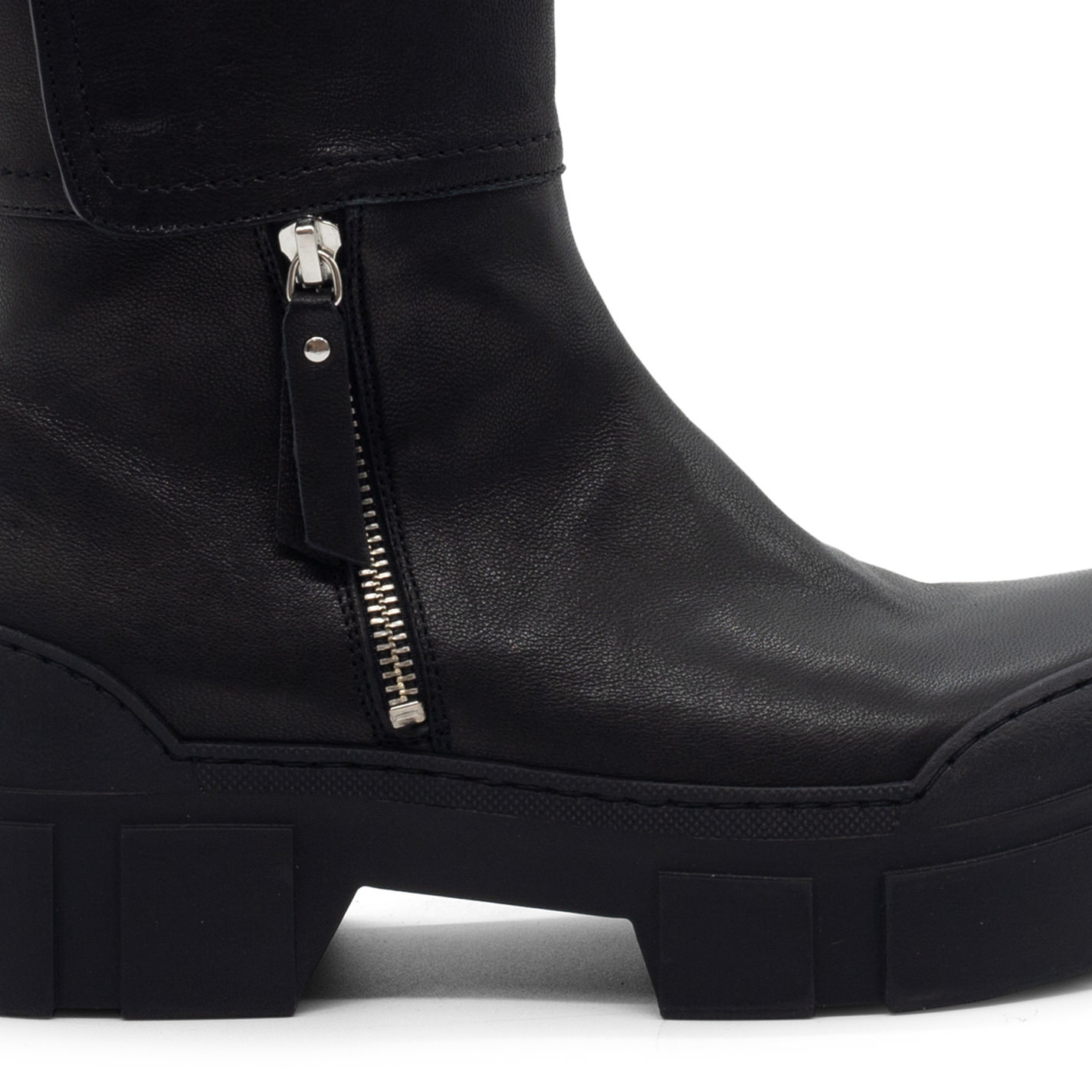 V14 Roccia-Tronchetto biker nero in morbida nappa washed e vintage, con zip di metallo esterna e patta staccabile ed apribile da automatici nascosti. Suola guscio in TPU con tacche a rilievo e plantare TAG morbido ricoperto in pelle di vitello. Made in Italy.