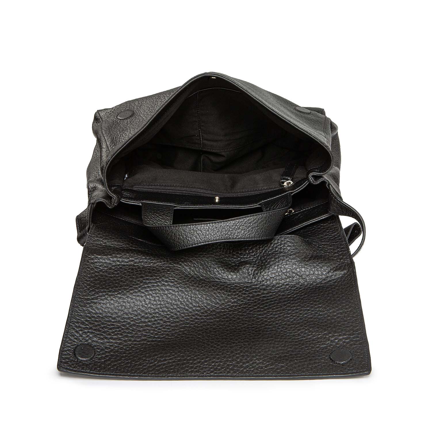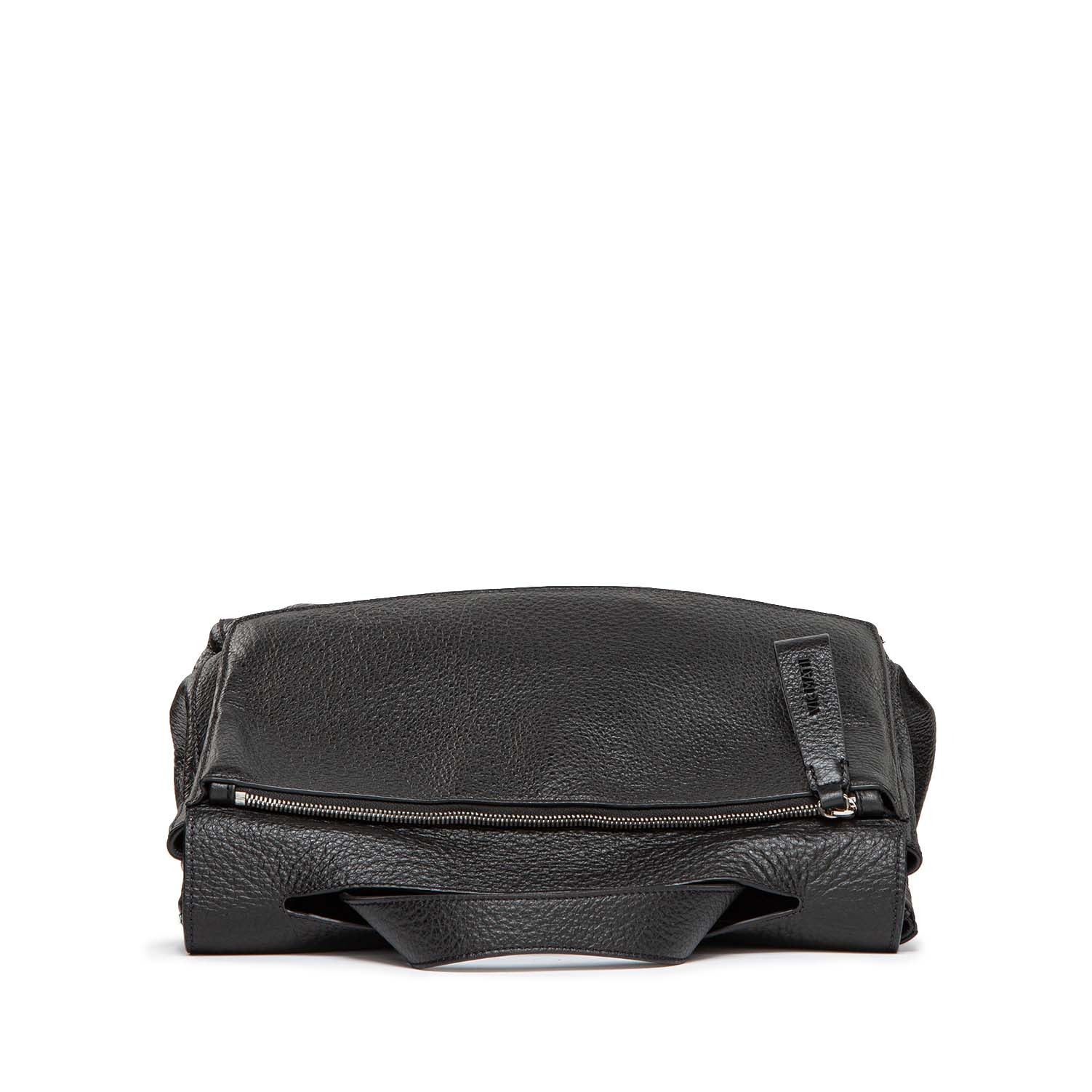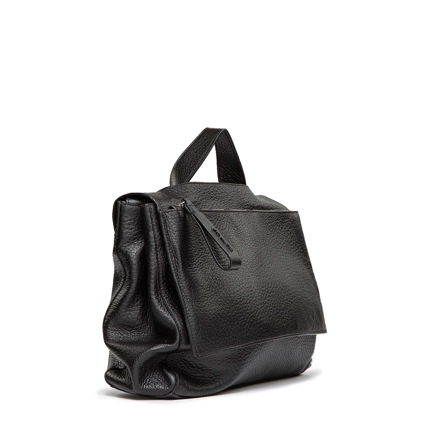 Borsa midì nerarealizzata in pelle di vitello a grana grande, con doppio scomparto e patta con tasca zippata da dove esce il manico. Chiusura patta con magneti nascosti, tracolla in pelle regolabile e staccabile. Portachiavi logato in dotazione.