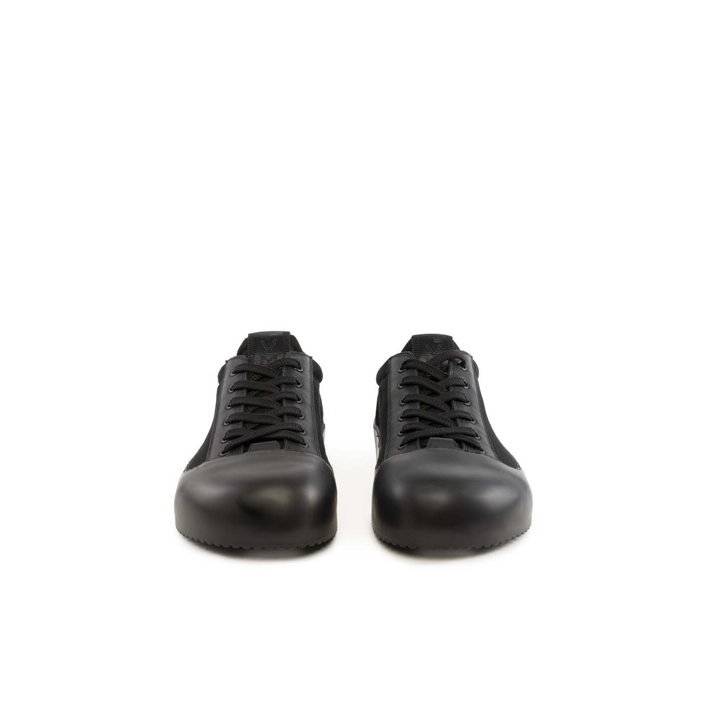 Waders man sneakers tessuto/pelle nera realizzata in cotone e con riporti in nappa di vitello , con motivo di imbottitura lungo lo scollo e l'allacciatura. Occhielli e stringa tono su tono. Fondo gomma avvolgente, leggerissime tacche sul battistrada; morbido fusbet ricoperto in pelle. Made in Italy.