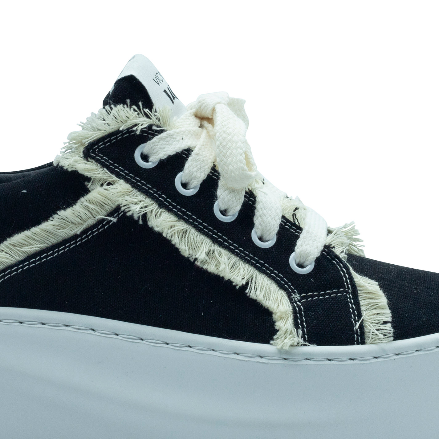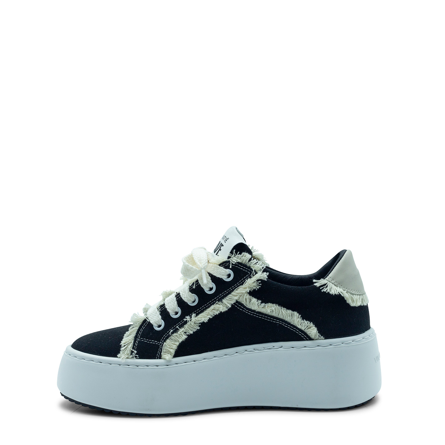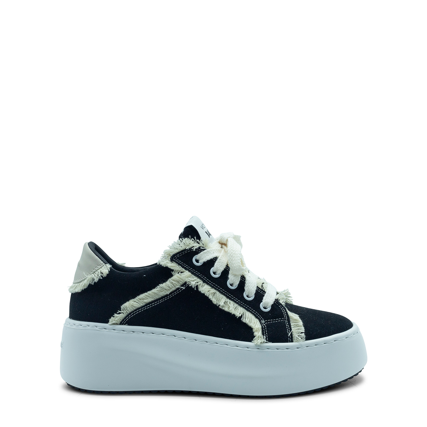 Wawe Scarpa fringes nerain cotone con spoiler di pelle logato, interamente profilata da frangette , stringa in cotone. Platform in gomma dal design futurista con leggera angolatura esterna, che garantisce comfort e modernità alla scarpa, plantare ricoperto in pelle di vitello. Made in Italy.