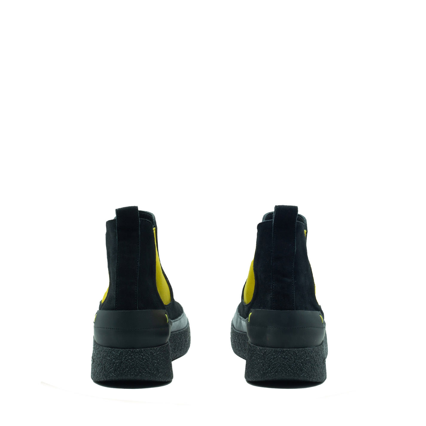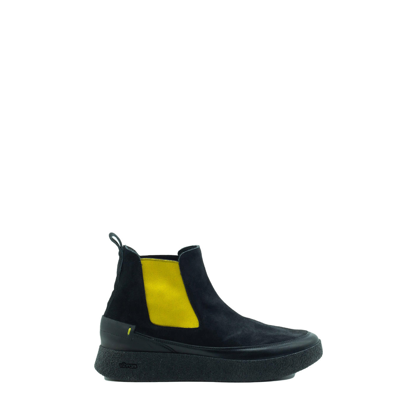 Whippy beatles nero/giallo in pelle di vitello semilucida e crosta, con elastico e punto a mano a contrasto. Suola in gomma leggera e flessibile dal texture crepe. Sottopiede flat ricoperto tessuto. Made in Italy.