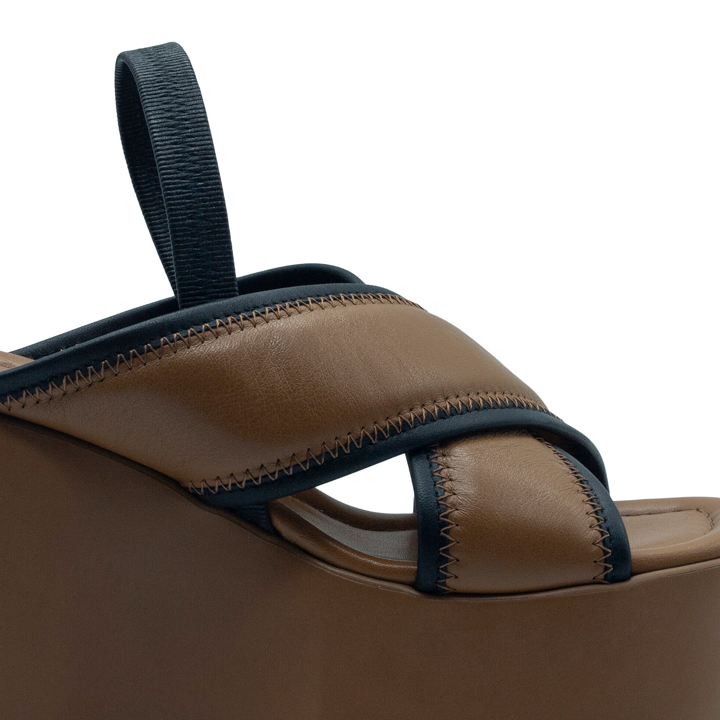 Yoko ciabatta cuoio/nera in nappa di vitello, composta da due fasce leggermente imbottite e bordate in pelle con cuciture a zig zag a contrasto;
