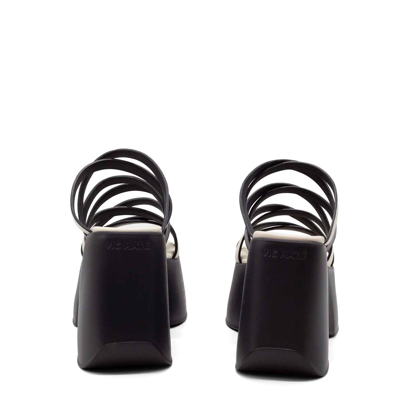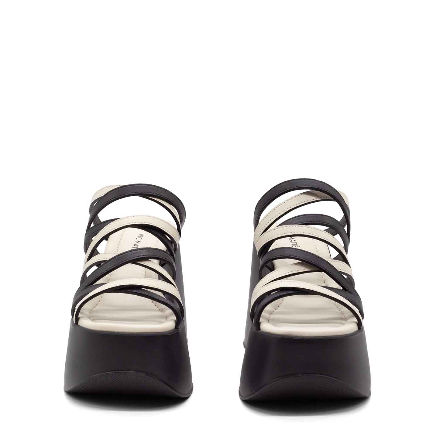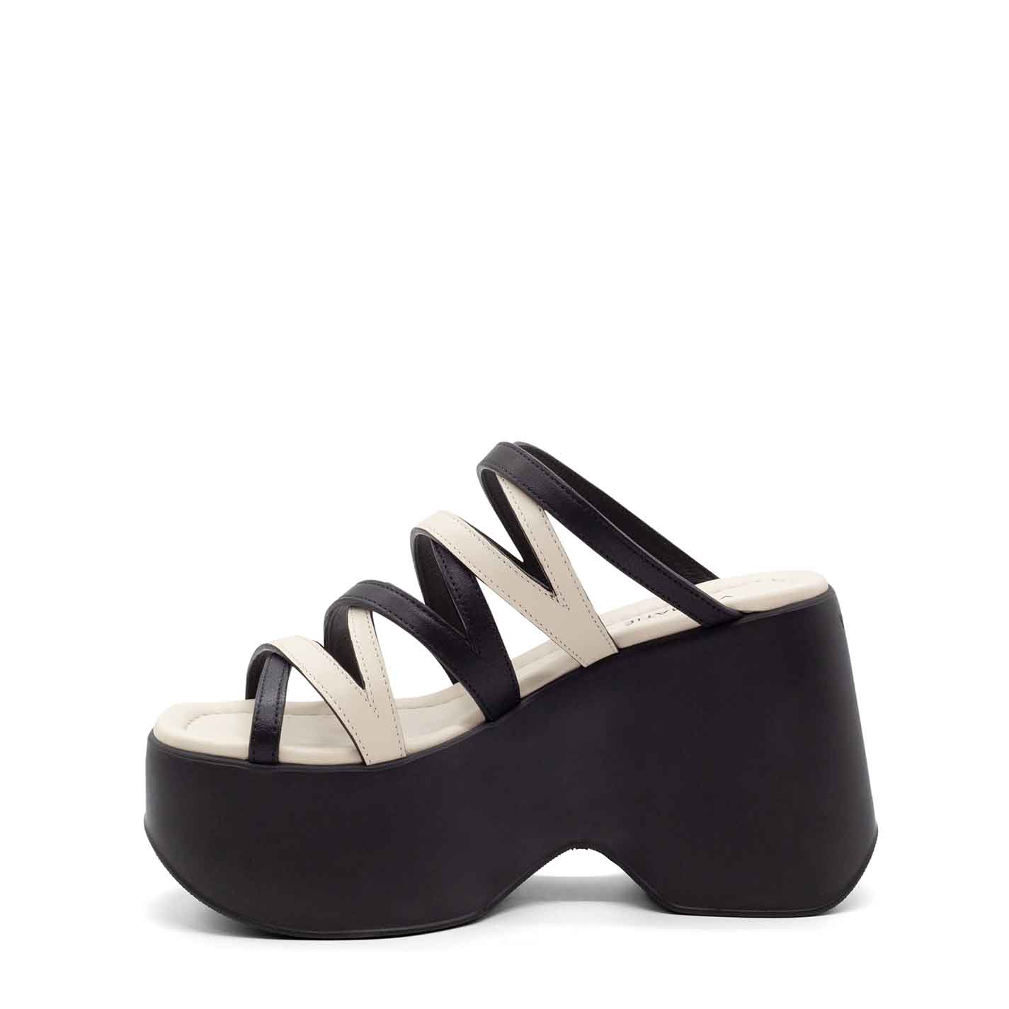 Yoko ciabatta incroci in morbida pelle nappata nera/avorio ,con listini di vitello che si incrociano, creando giochi di aperture. Zeppa in materiale espanso super leggero e confortevole. Sottopiede in pelle imbottito e arricchito da cucitura. Battistrada con texture antiscivolo. Made in Italy.