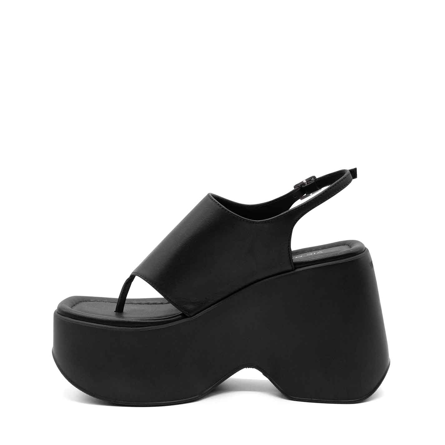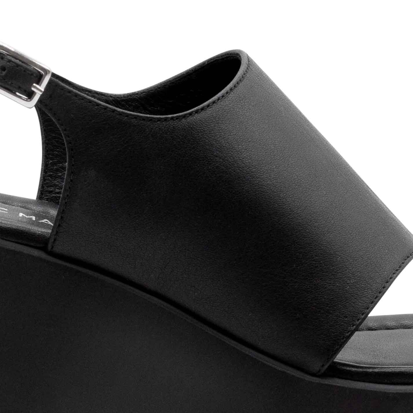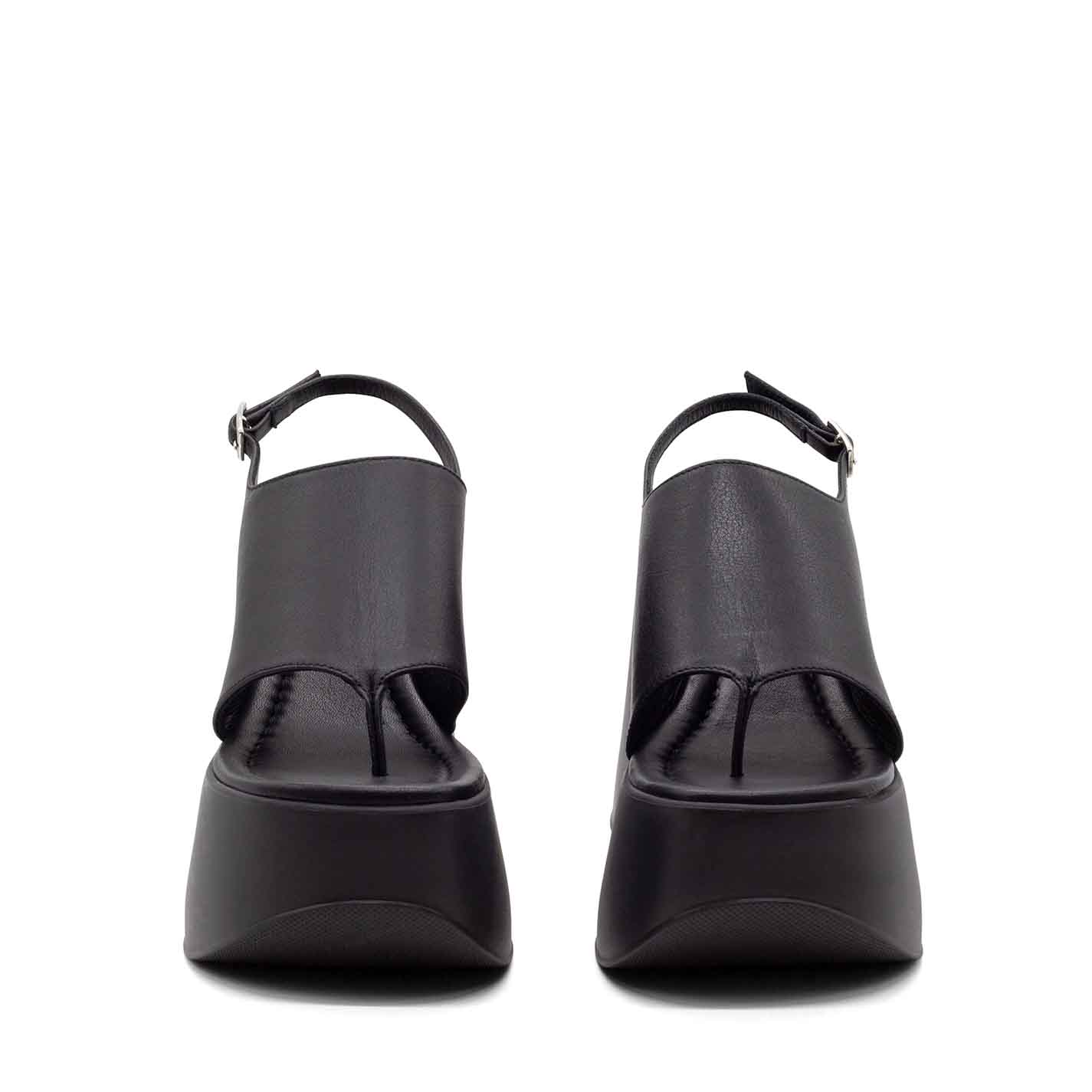 Yoko ciabatta infradito in morbido vitello nappato nero ,con cinturino regolabile da fibbia. Zeppa in materiale espanso super leggero e confortevole. Sottopiede in pelle imbottito e arricchito da cucitura. Battistrada con texture antiscivolo. Made in Italy.