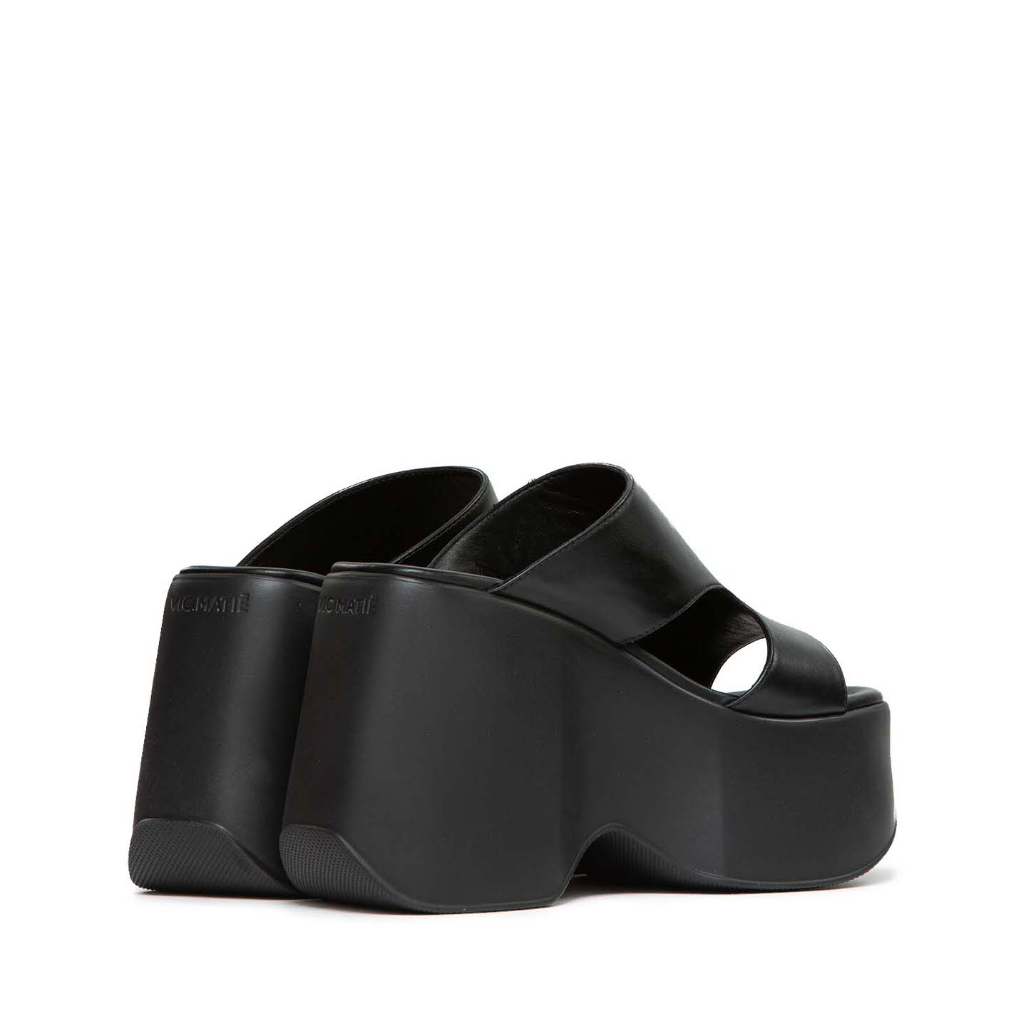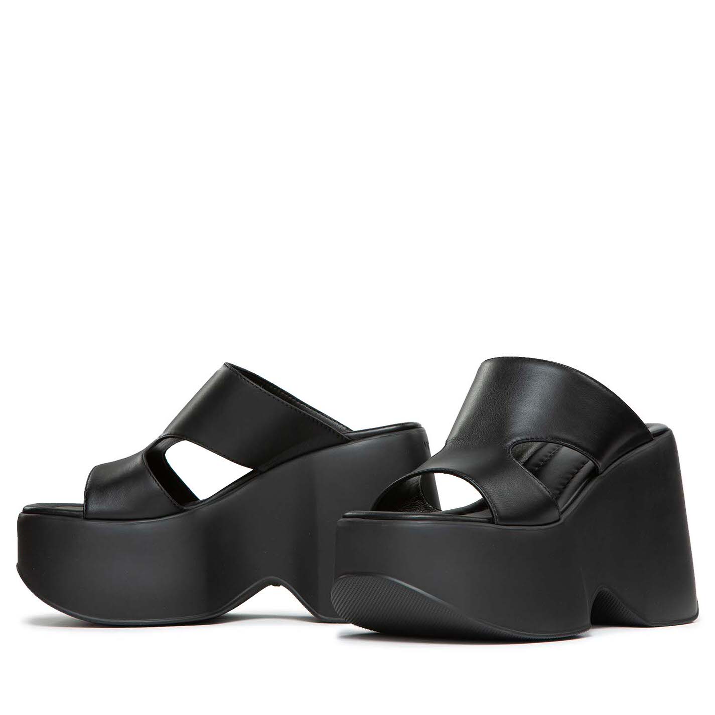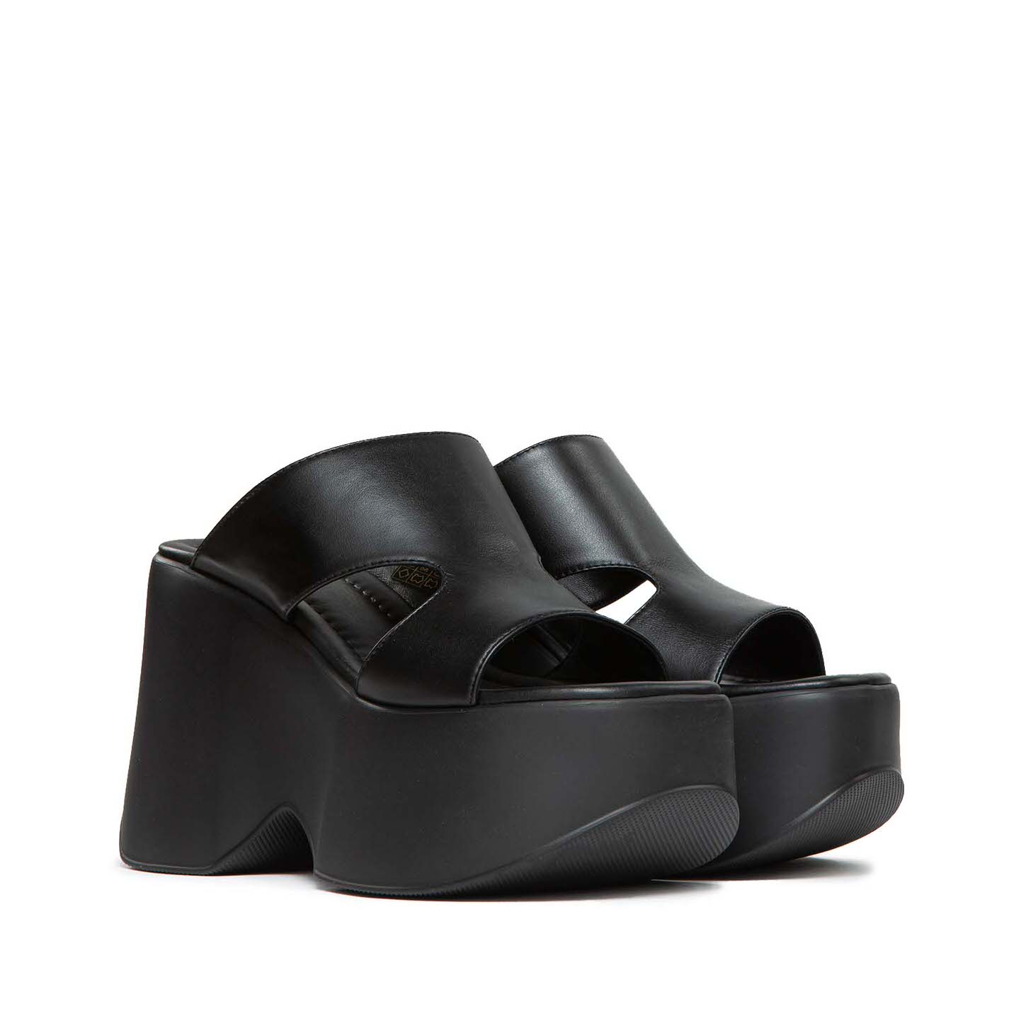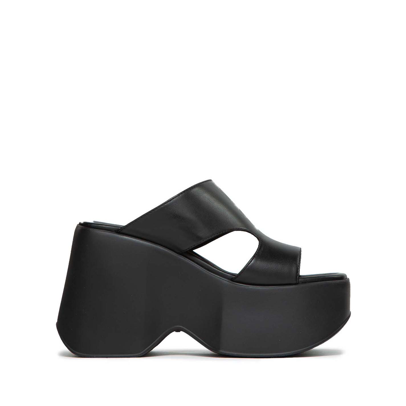 Yoko ciabatta nera con aperture laterali, in morbida pelle di vitello. Zeppa in materiale gommoso super leggero, confortevole e in tono con battistrada antiscivolo. Sottopiede in pelle imbottito e arricchito da cucitura. Made in Italy.