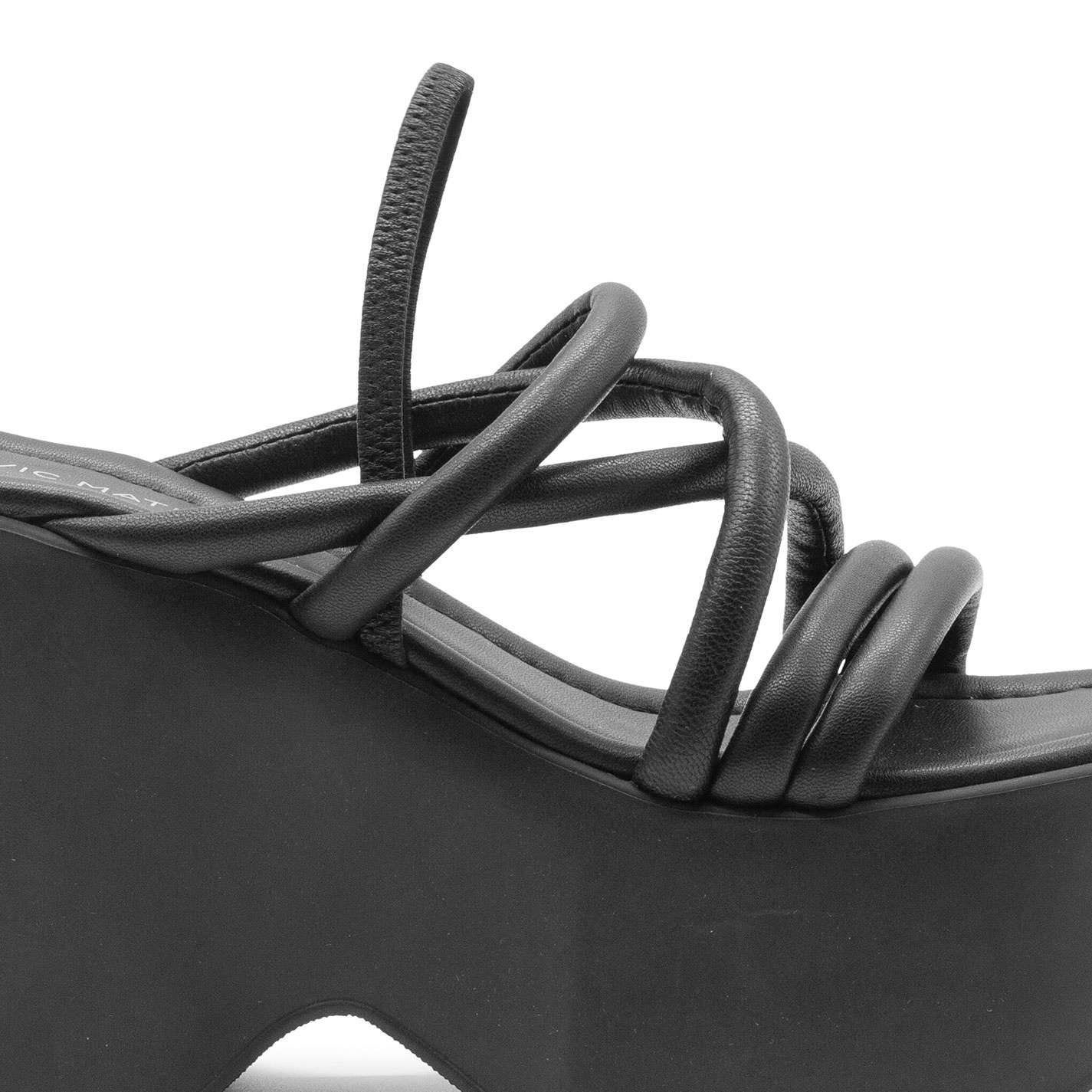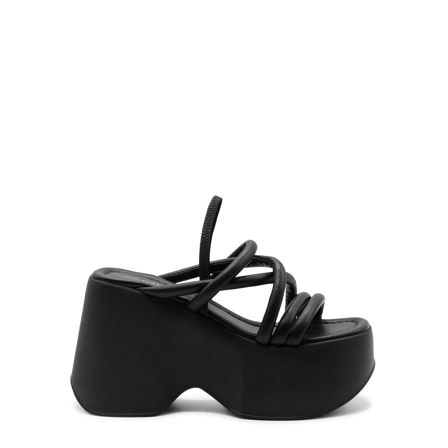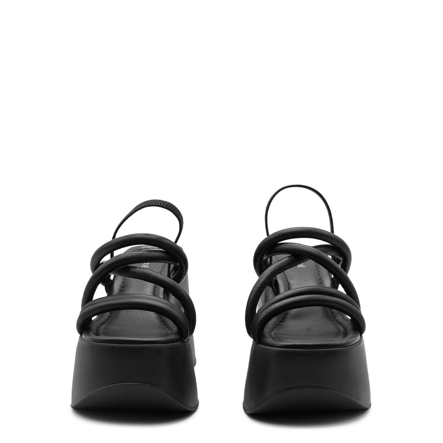 Yoko sandalo nero, composto da piccoli tubolari in nappa imbottiti, che si incrociano dal davanti;