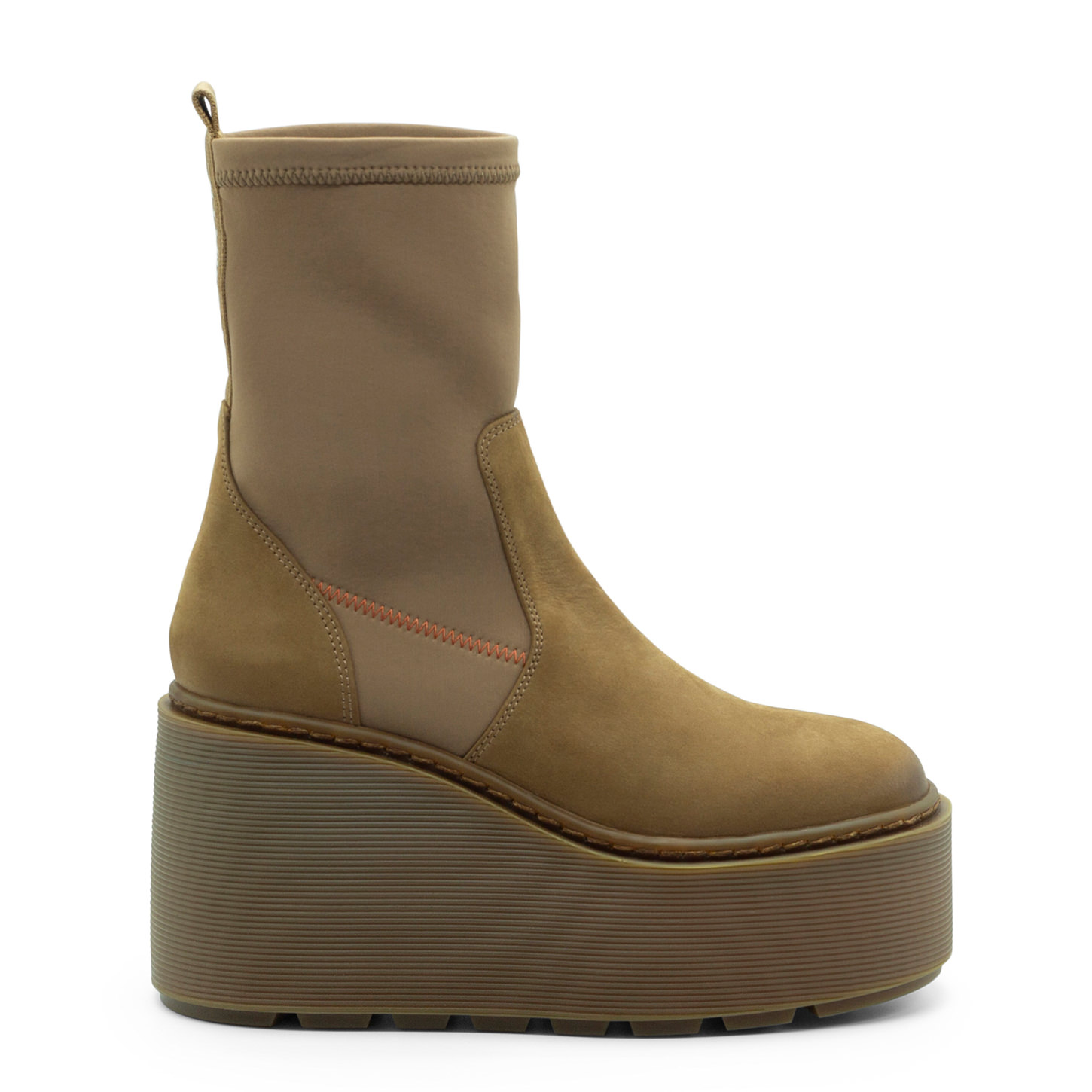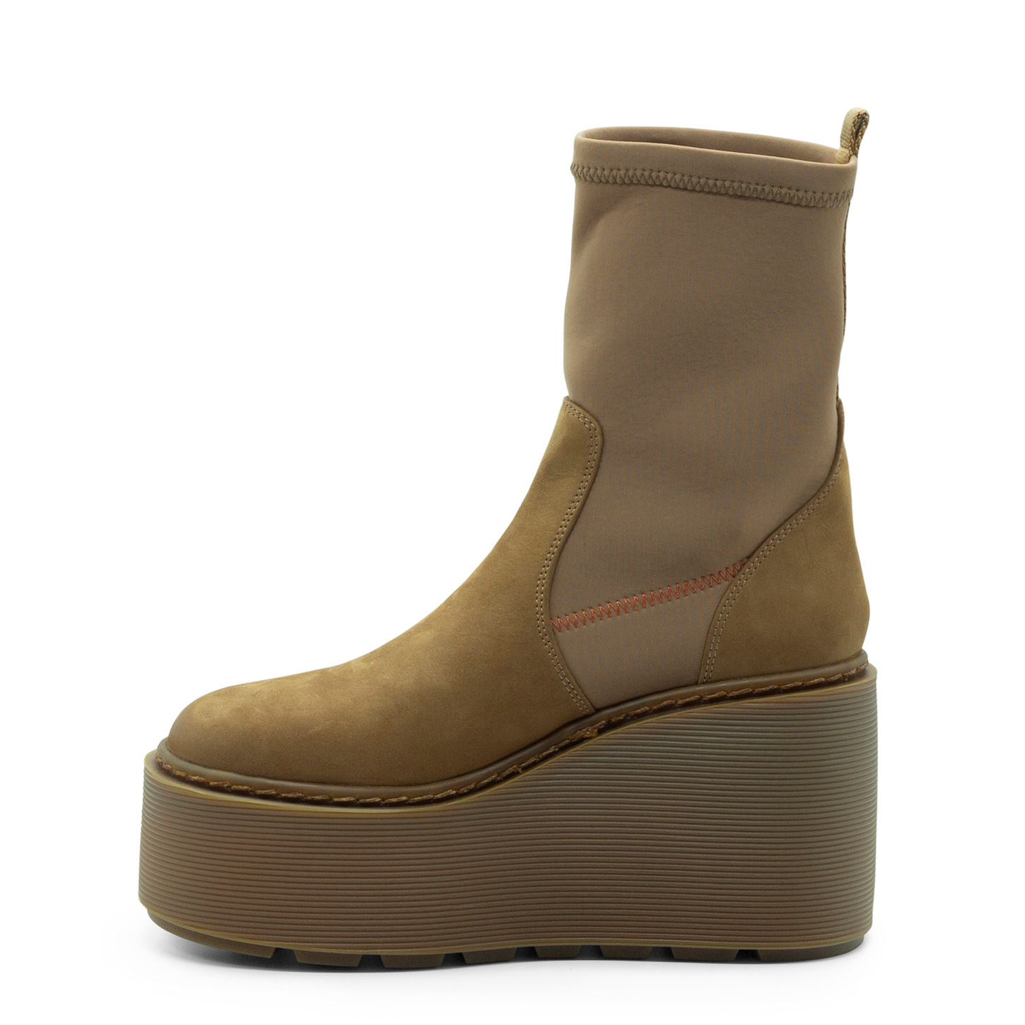 Zeppa Stripy tronchetto miele in nabuk e gambale in neoprene elasticizzato, con nastro logato tono su tono nel retro. Zeppa in gomma effetto rigato, con battistrada a tacche antiscivolo. Made in Italy.