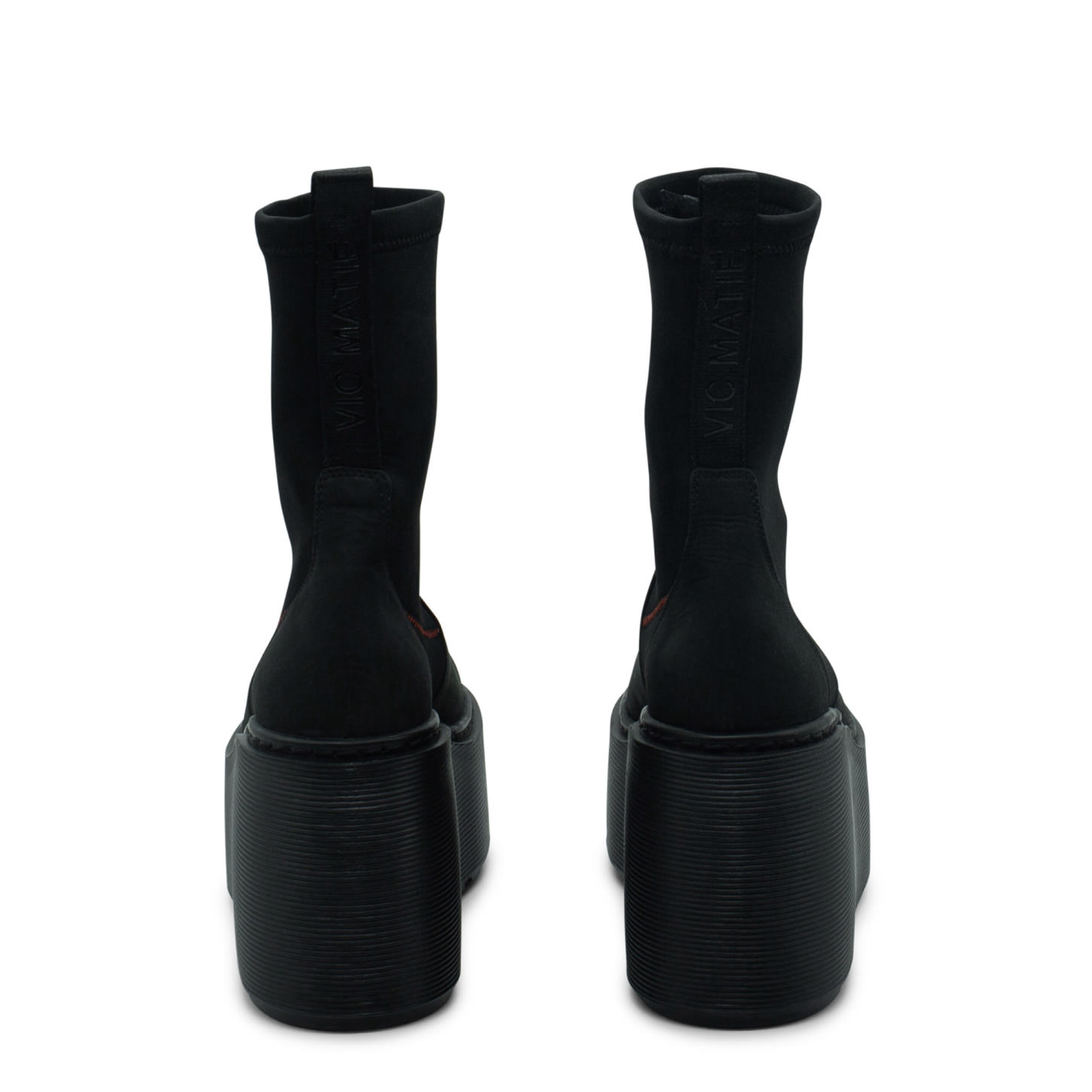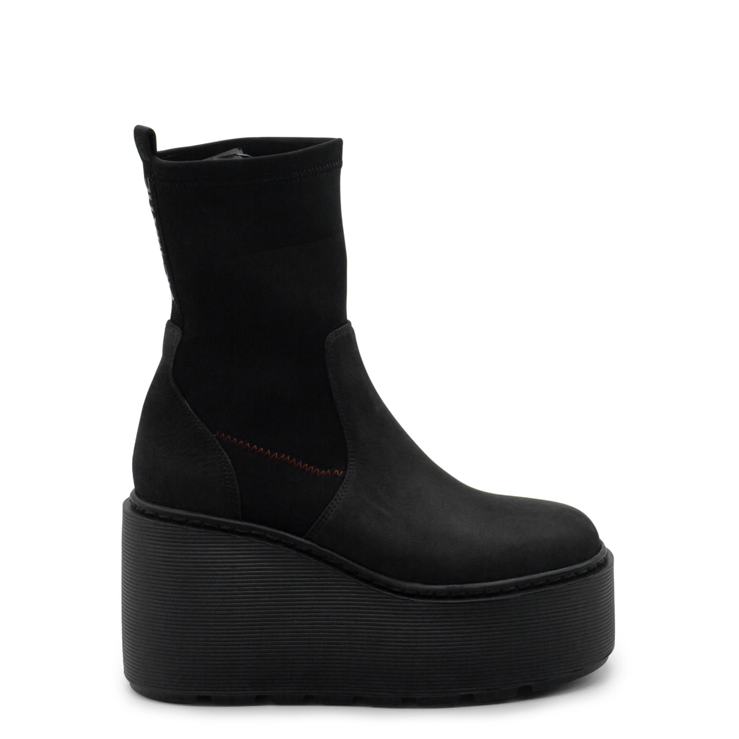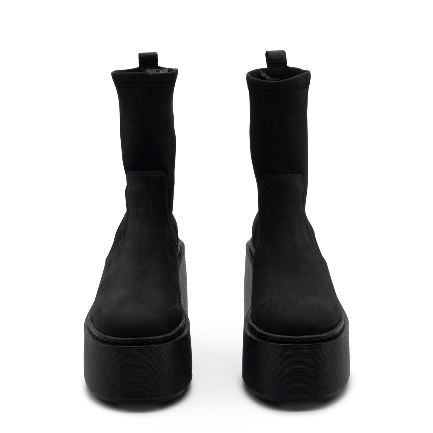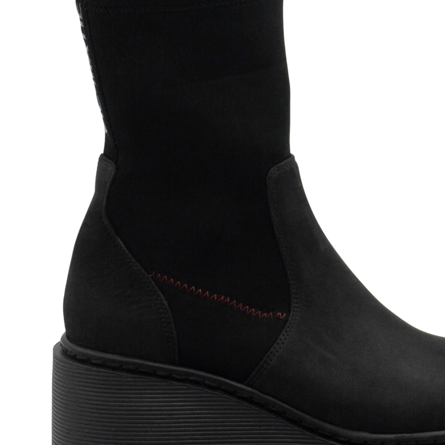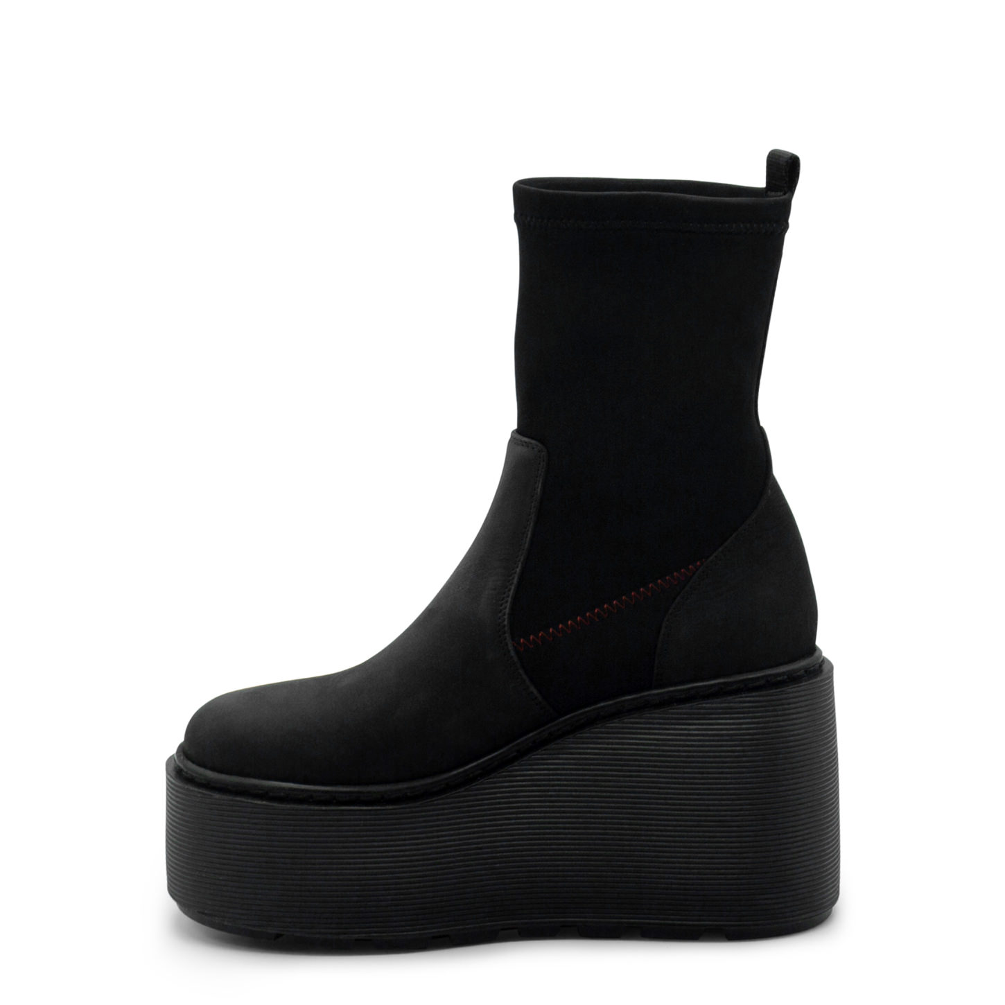 Zeppa Stripy tronchetto nero in nabuk e gambale in neoprene elasticizzato, con nastro logato tono su tono nel retro. Zeppa in gomma effetto rigato, con battistrada a tacche antiscivolo. Made in Italy.